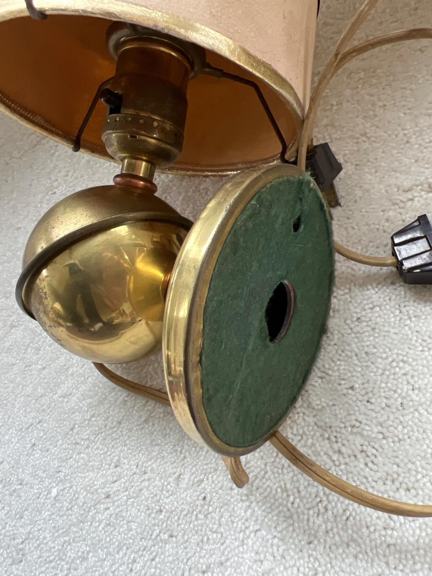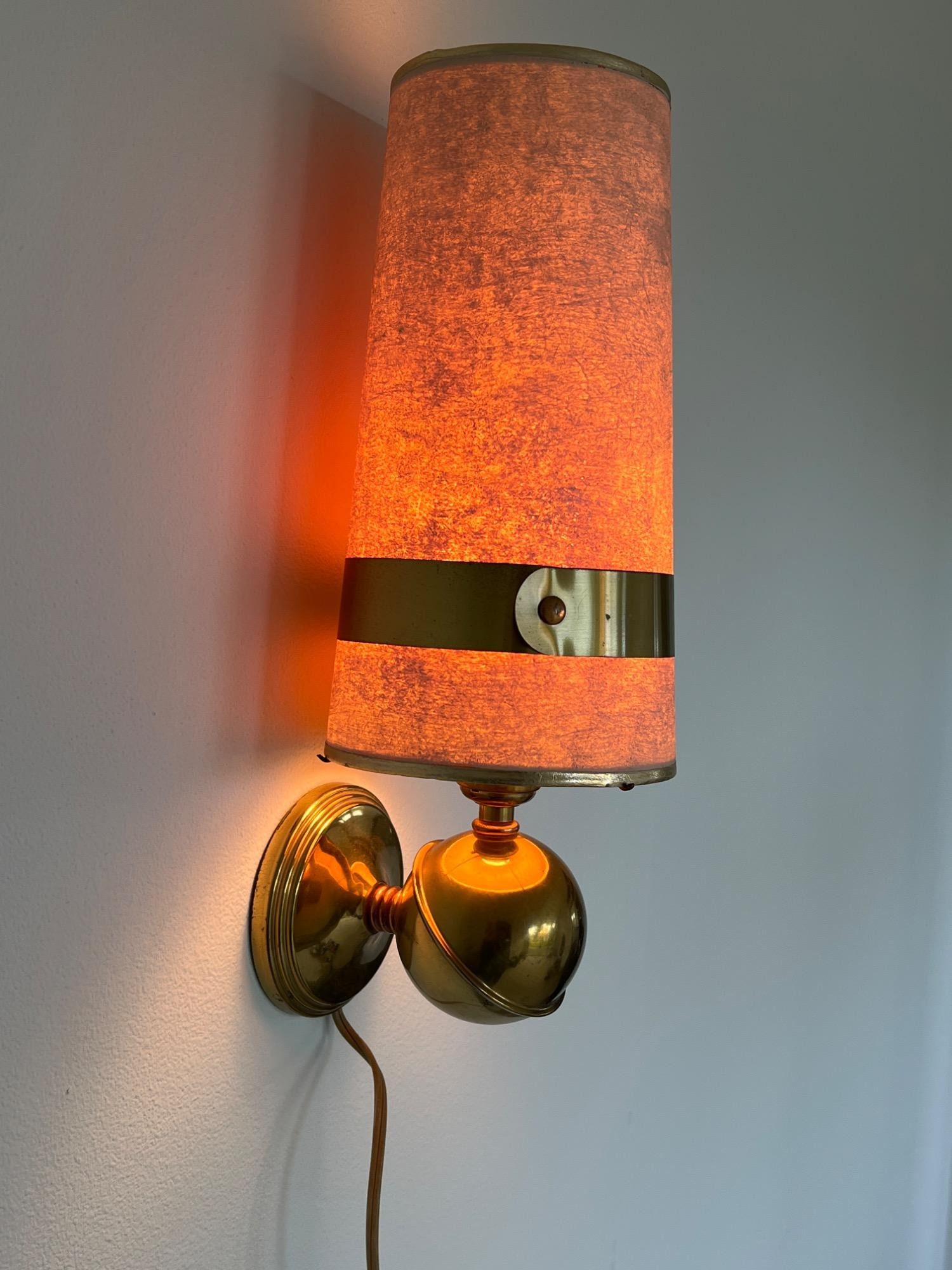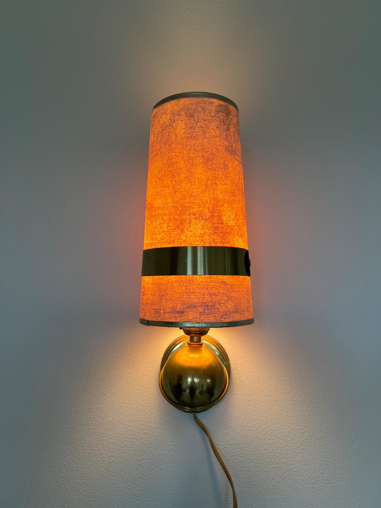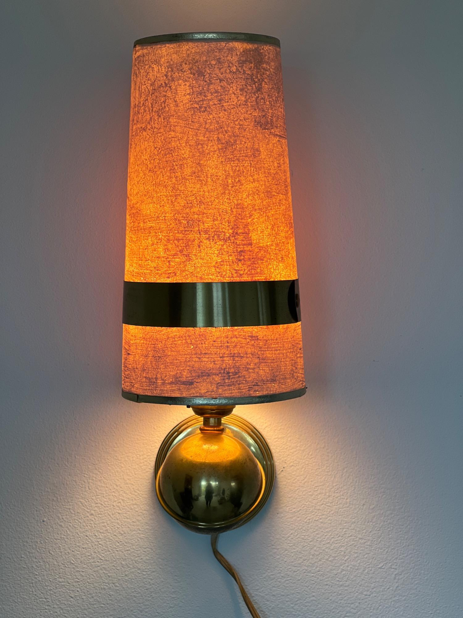 Two mid-century modern brass fixtures with an elegant, minimalist design. Conical beige lampshades, combined with brass trim and brass spherical base, give these lights a balanced and elongated appearance without dominating the wall space. The lights are working and simply plug into a wall outlet. Push on/off switch. Original shades that have some smudges to the surface.