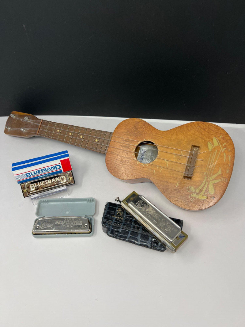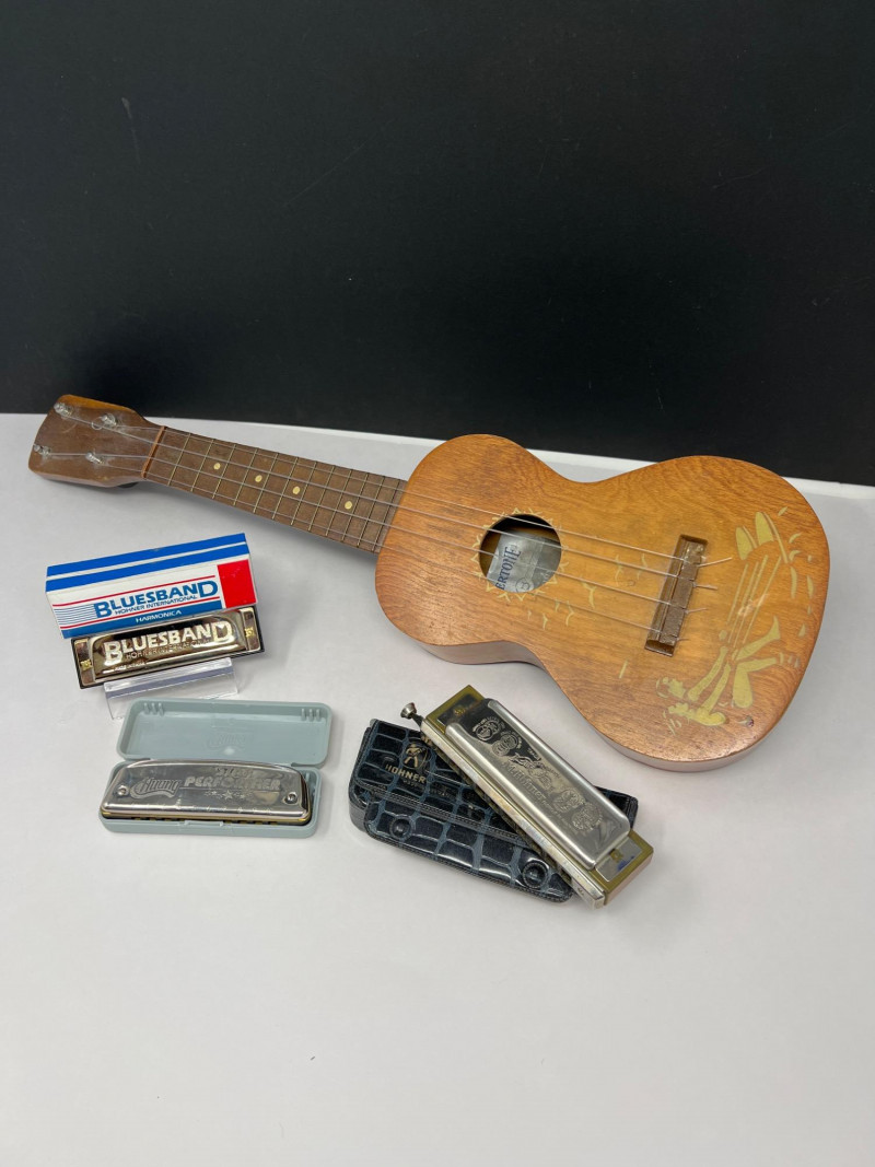 Lot # 69 - Supertone Ukulele & Trio of Harmonicas