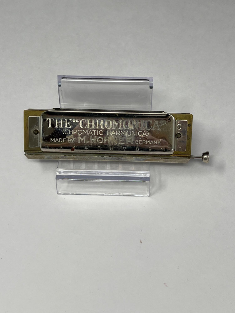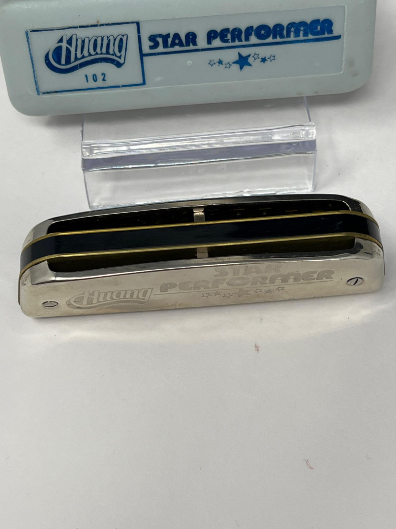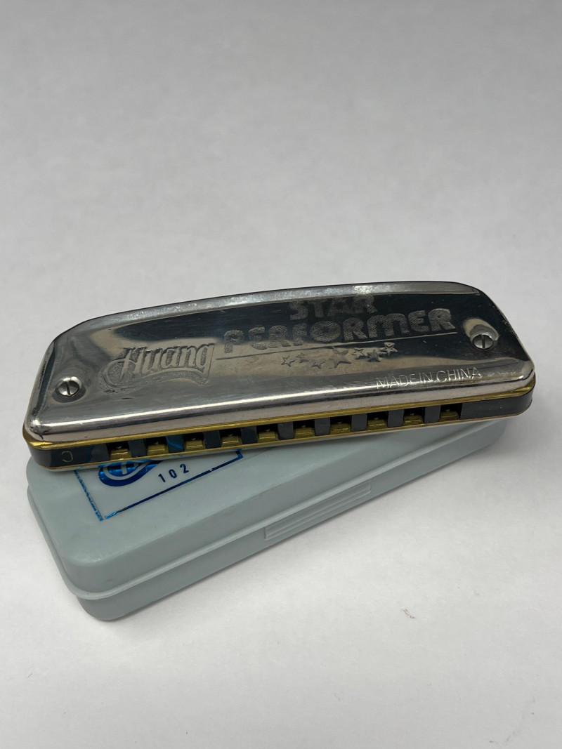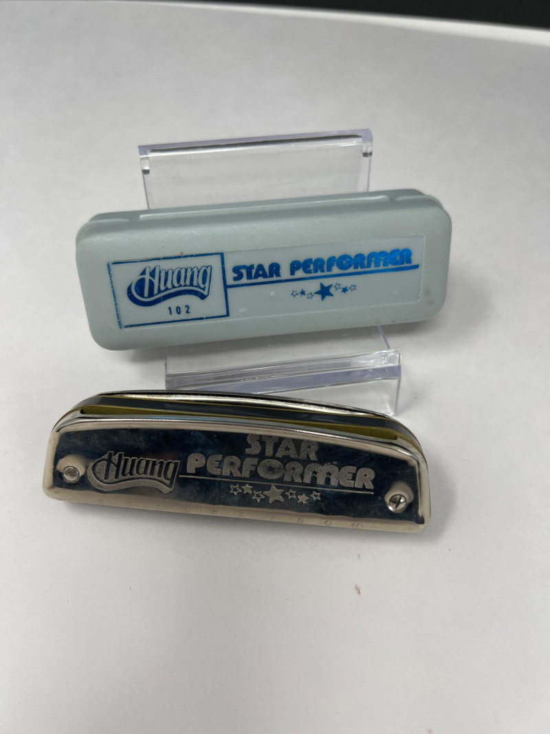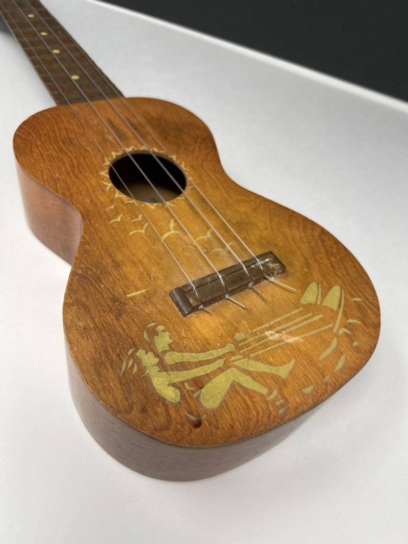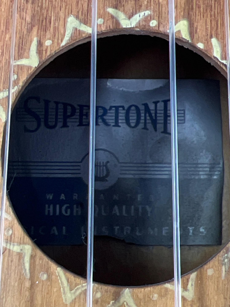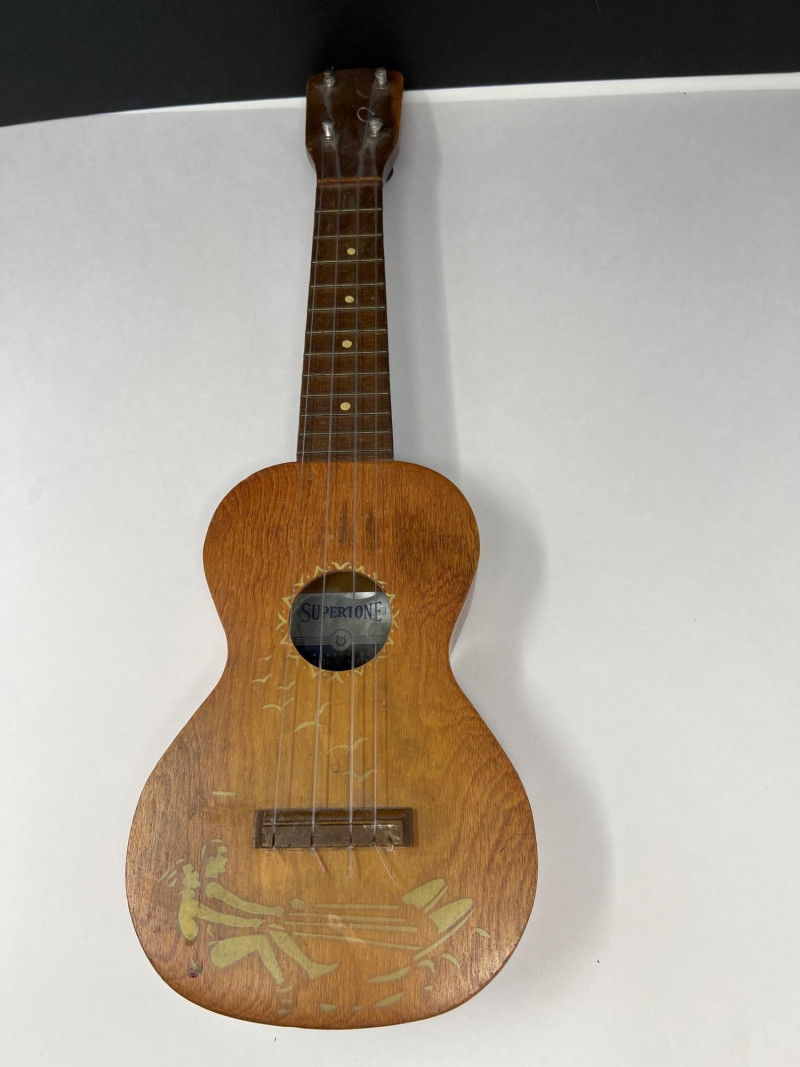 Vintage Supertone Ukulele with water ski design. Needs a tuning. Three harmonicas: