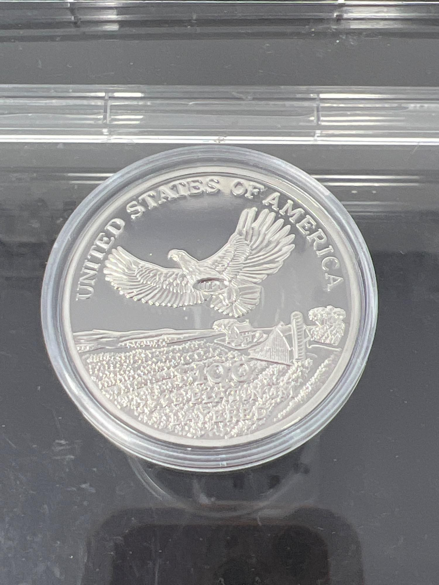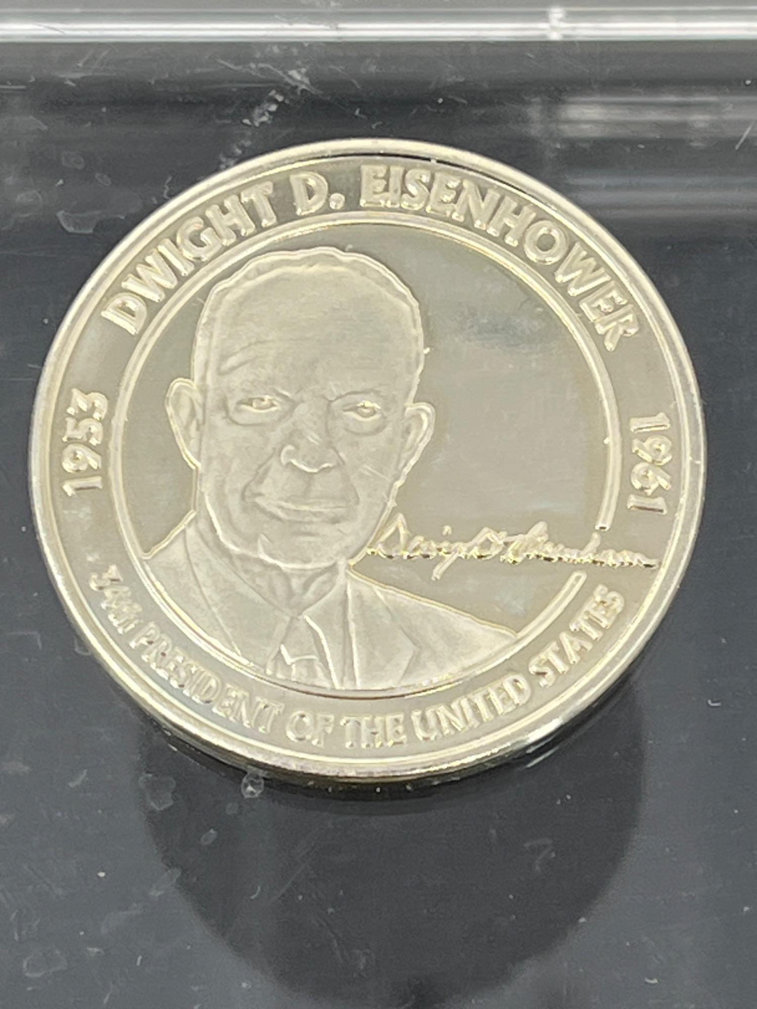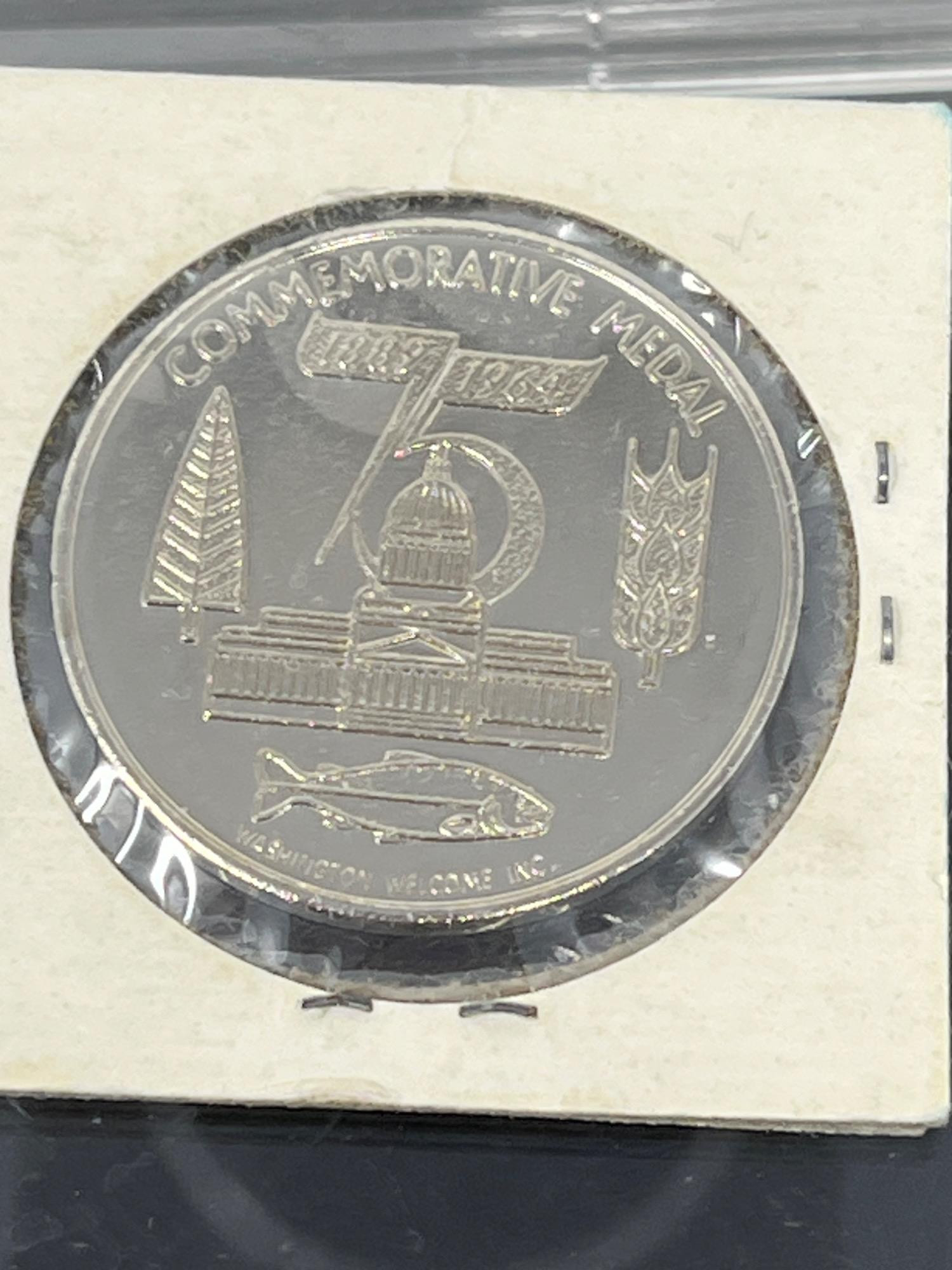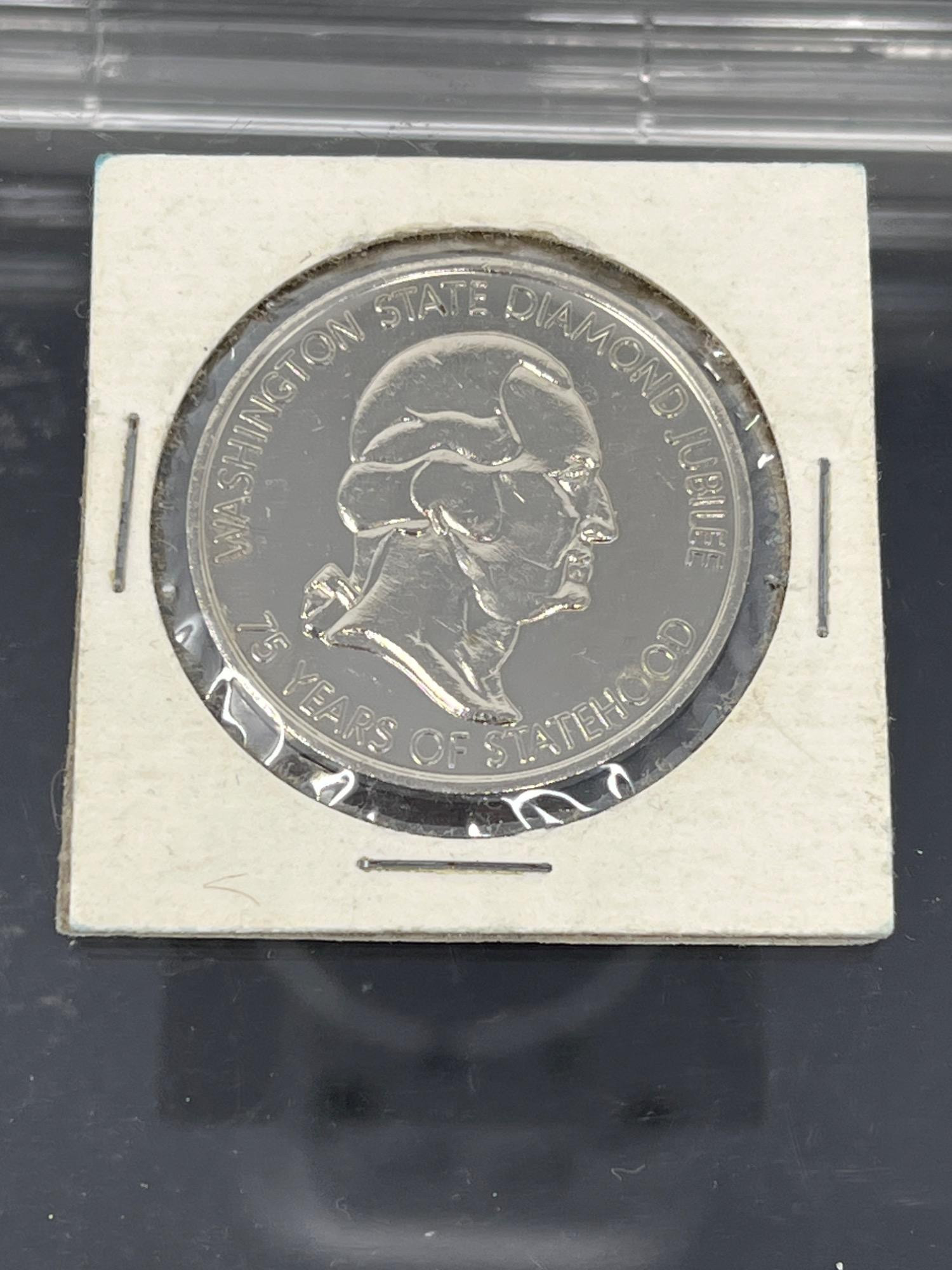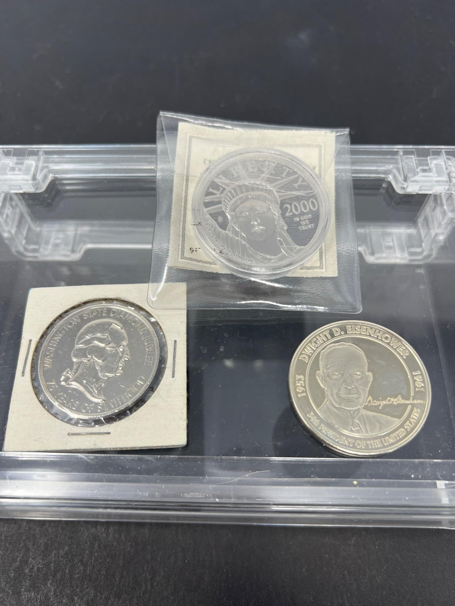 Liberty coin is dated 2000. Issued by American Mint, issued in 2011, $100 Eagle Replica. Cu Platinum layered. Washington State Diamond Jubilee 75 Years commemorative coin. Eisenhower 34th Anniversary Coin