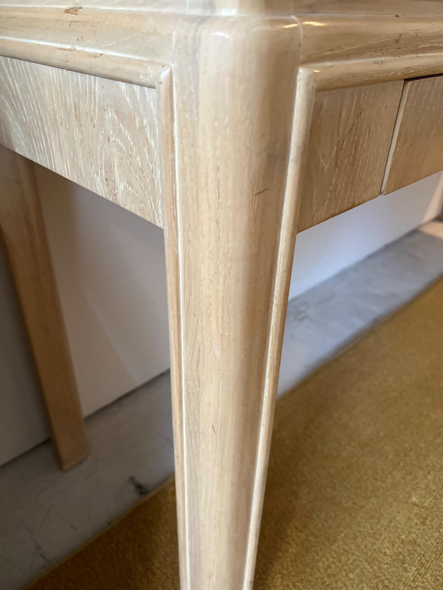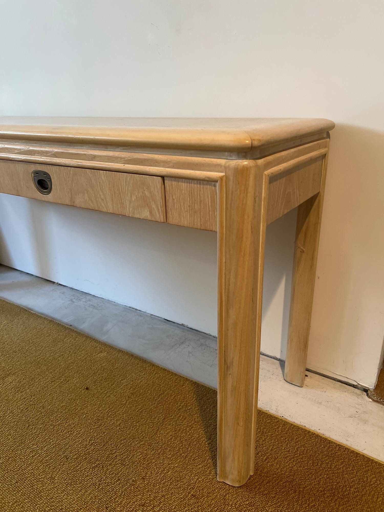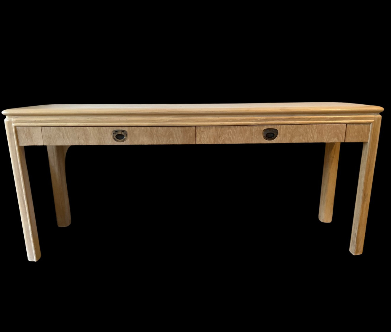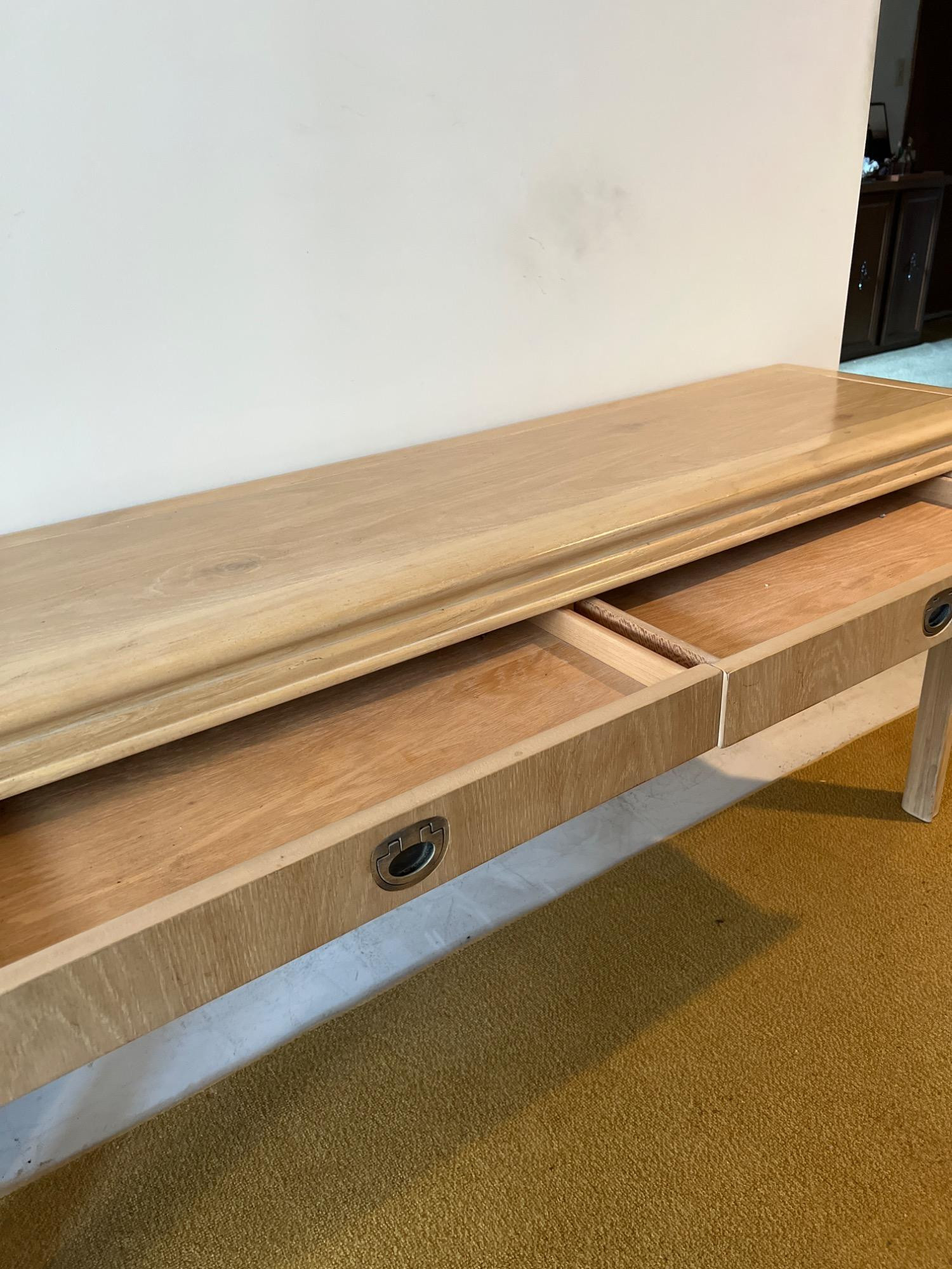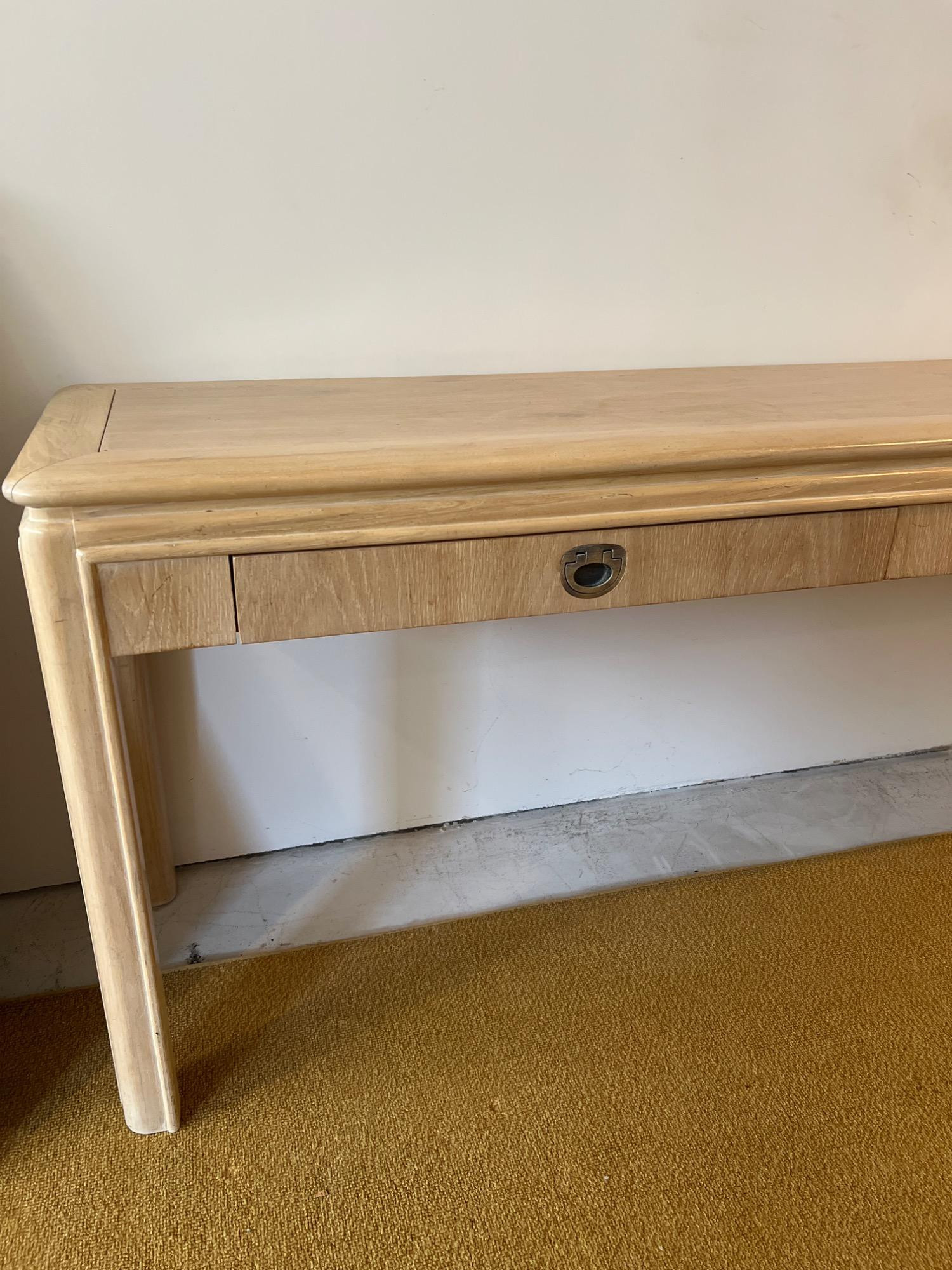 This blonde solid wood sofa or hallway/entry table is a Drexel Heritage Rectangular Table #16791. Drexel Heritage is known for its high-quality craftsmanship and timeless designs. The table has clean lines and a versatile design. It includes two drawers with original metal drawer pulls. See Lots 90 and 85 for additional furniture pieces from the same vintage Drexel Heritage collection. Located on a ground floor level, no steps. Bidding on this lot is an agreement that: (1.) You will have 2 capable, able-bodied persons to lift and load at a minimum. (2.) You
