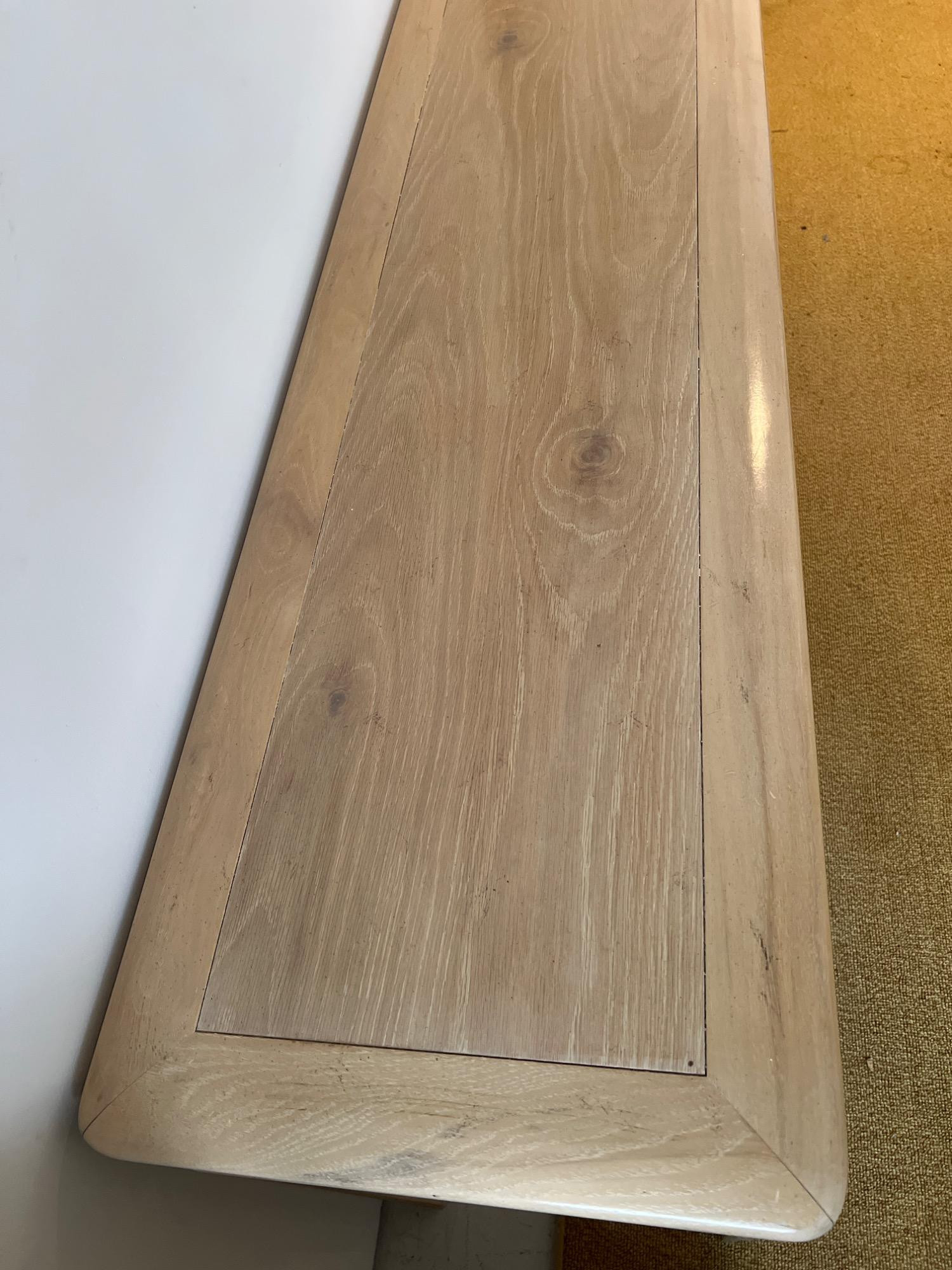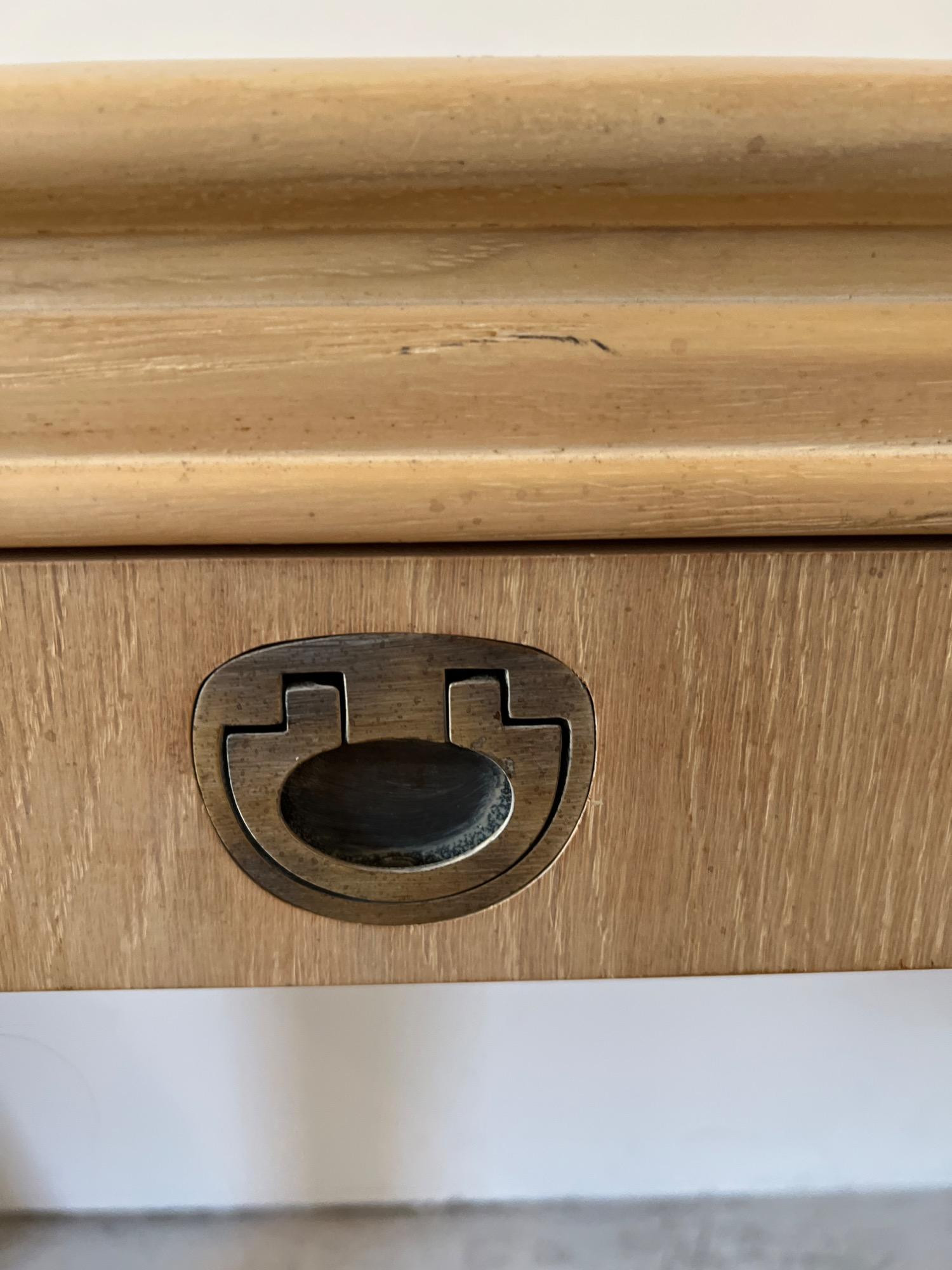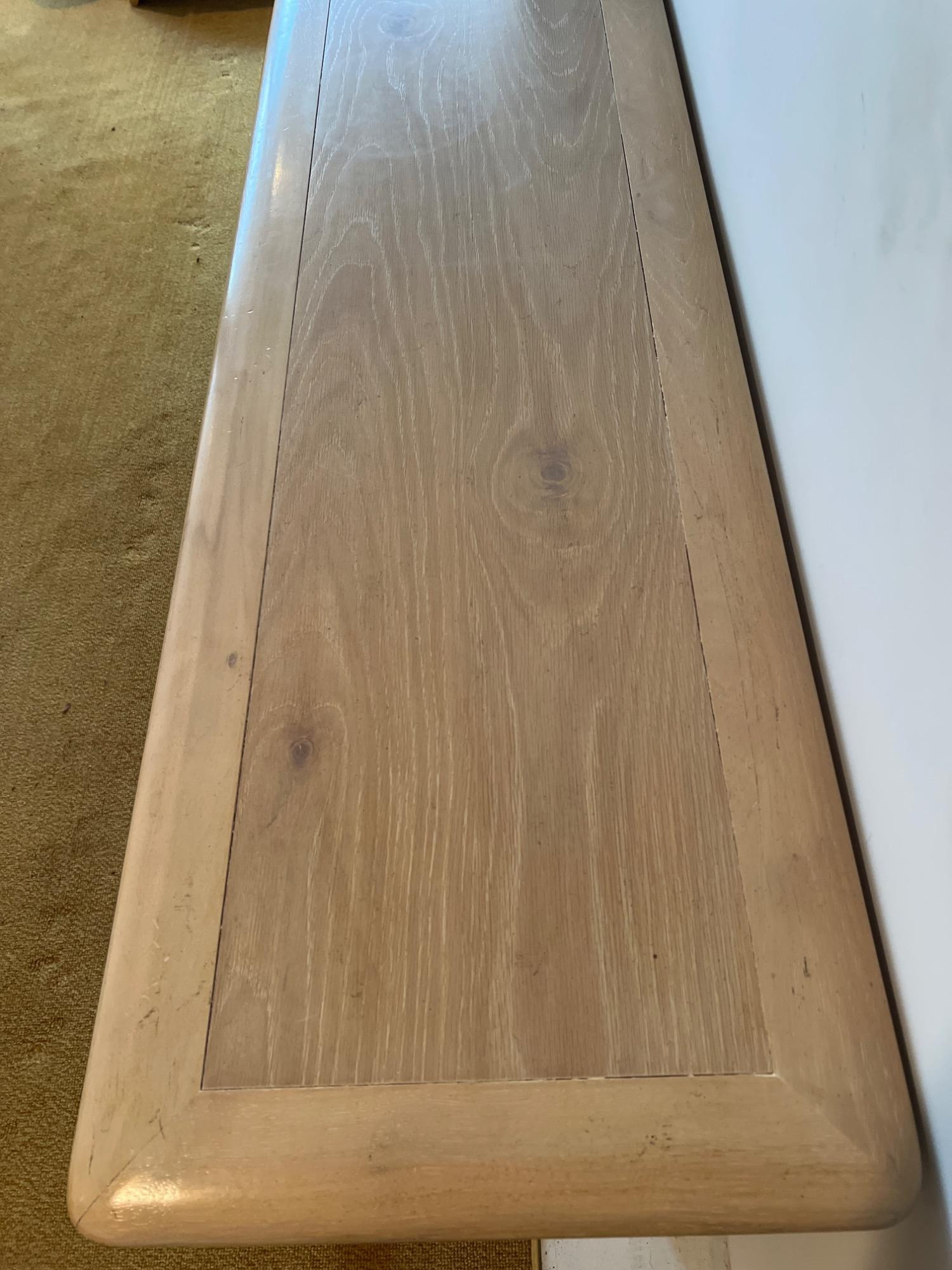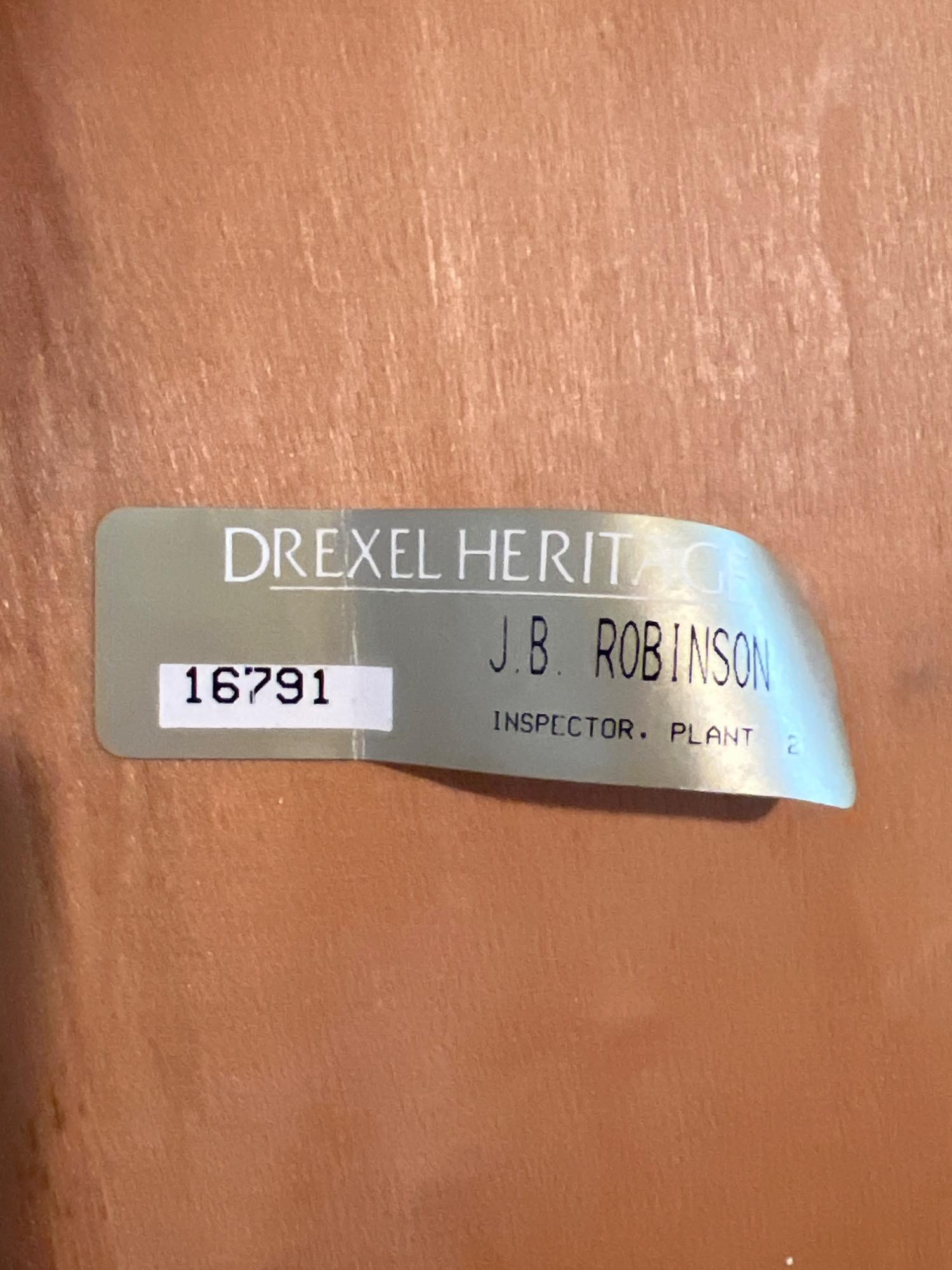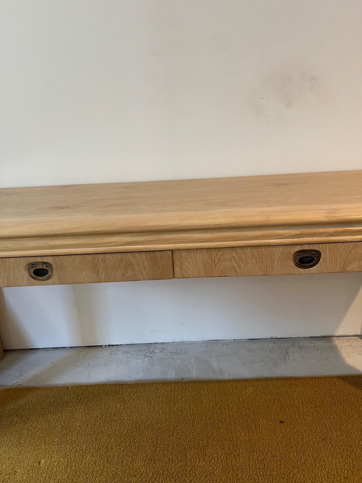 This blonde solid wood sofa or hallway/entry table is a Drexel Heritage Rectangular Table #16791. Drexel Heritage is known for its high-quality craftsmanship and timeless designs. The table has clean lines and a versatile design. It includes two drawers with original metal drawer pulls. See Lots 90 and 85 for additional furniture pieces from the same vintage Drexel Heritage collection. Located on a ground floor level, no steps. Bidding on this lot is an agreement that: (1.) You will have 2 capable, able-bodied persons to lift and load at a minimum. (2.) You