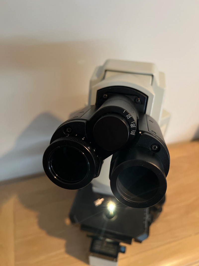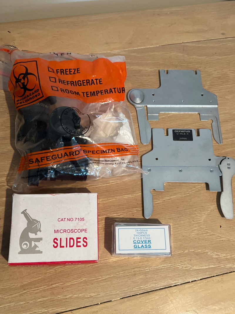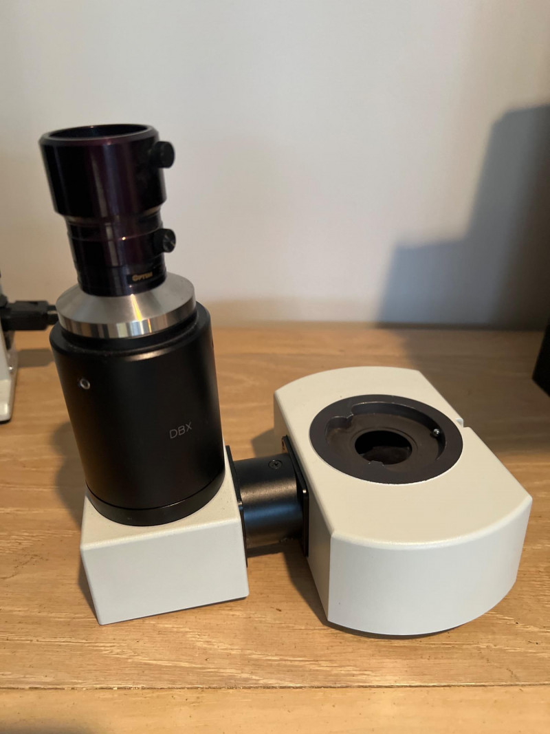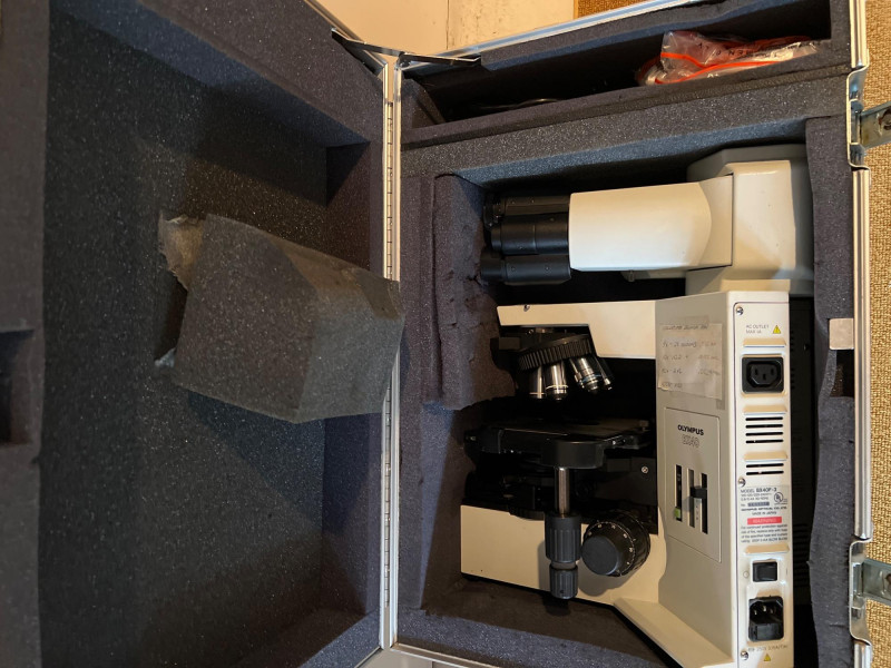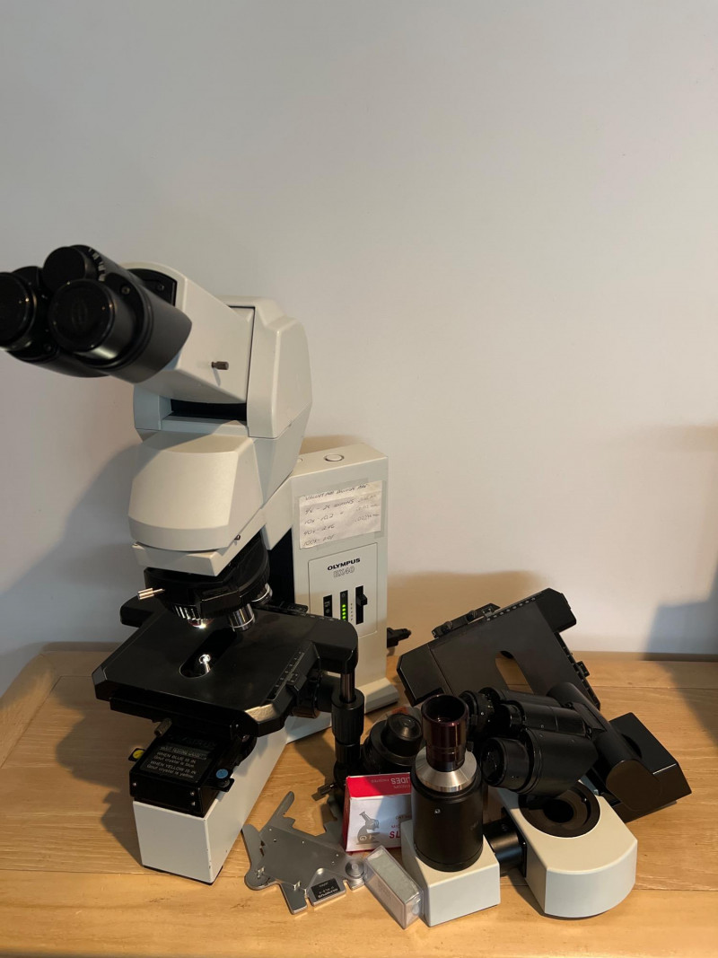 The Olympus BX40F-3 microscope is a clinical-grade instrument known for its precision and versatility. It features a Y-shaped design for enhanced stability and operability, making it ideal for various applications, including pathology and research. This is a fluorescence microscope which is a specialized version of the BX40 series. It is designed for advanced laboratory applications, particularly in biological and clinical research. It has an ergonomic head (U-TTBI), trinocular options for camara attachment, and high-quality objectives for precise imaging. The BX40 can be customized with different heads, objectives, and accessories to suit specific needs. Included are some extra components. (see pictures).