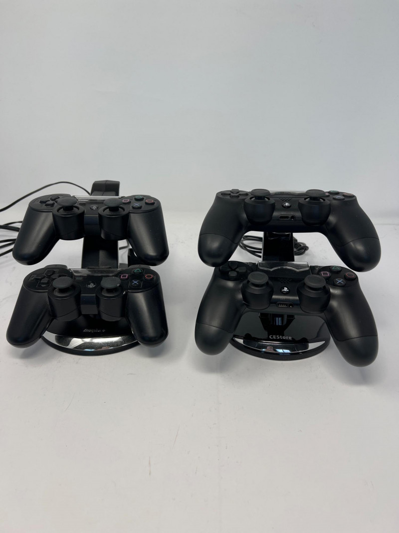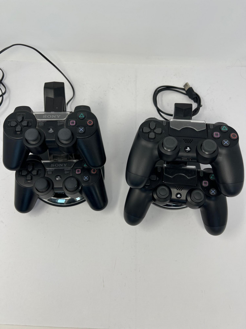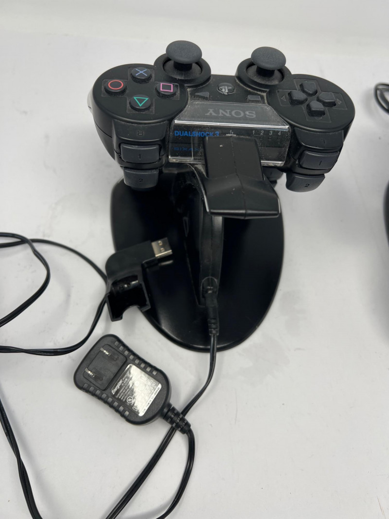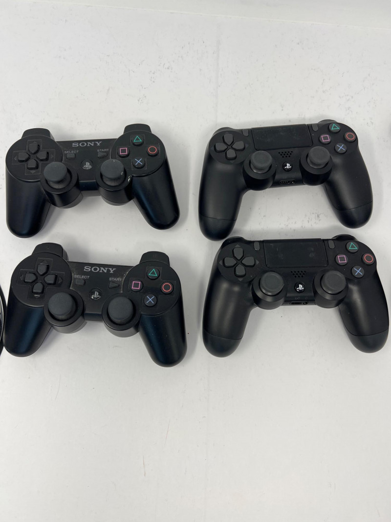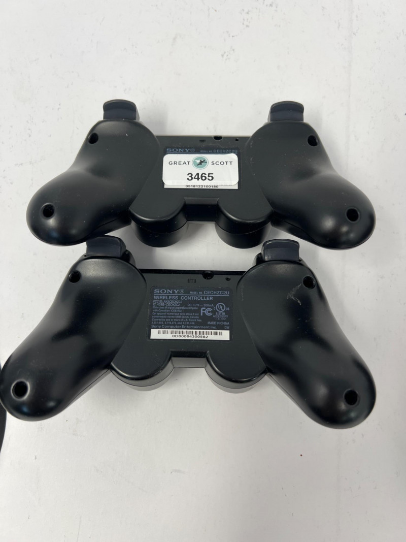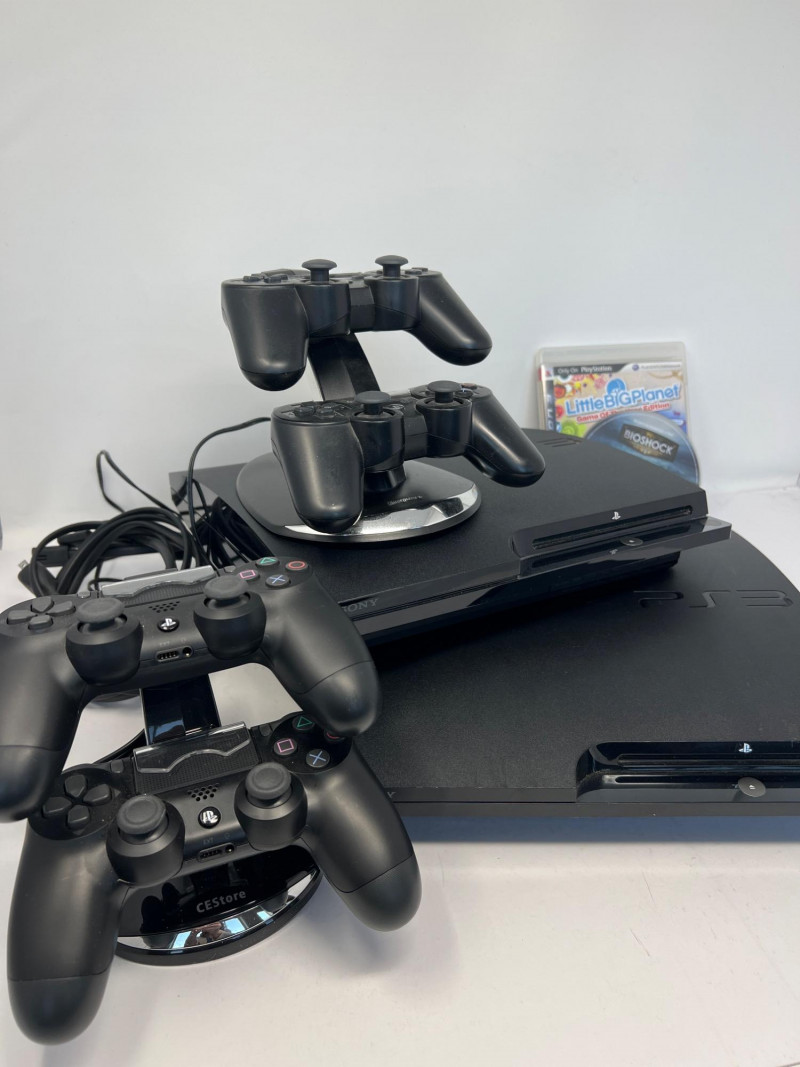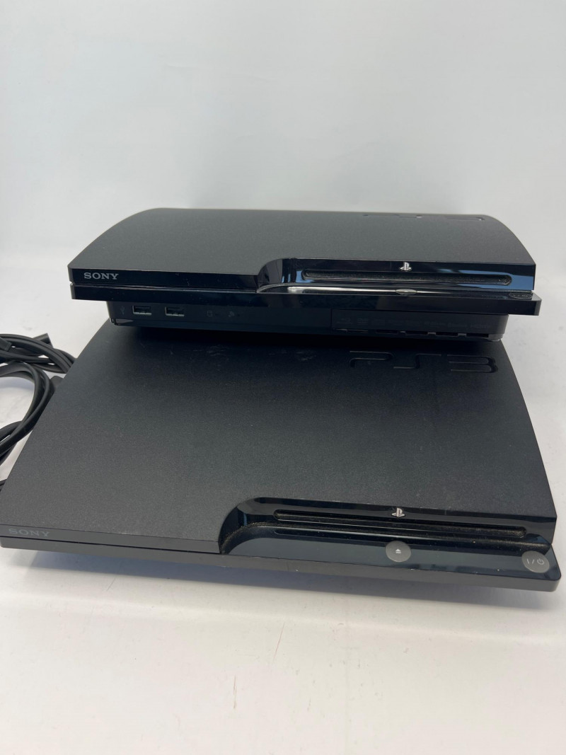 Two Sony PlayStation 3 CECH-2501B Consoles. Sleeker design compared to the original "Phat" PS3. Consoles power on. No further testing of the consoles or controllers. Features: consumes less power while maintaining the core functionalities of the console, includes Blu-ray Disc player for high-definition gaming and movies, Wi-Fi connectivity for online gaming and media streaming, USB ports for accessories and external storage, backward compatibility with PlayStation 1 games (but not PS2 games), and hard drive upgradeability that allows for swapping of the internal storage. Two consoles, 4 Sony Playstation controllers, two charging stations, cables, power cords, two games - Little Big Planet and BioShock.