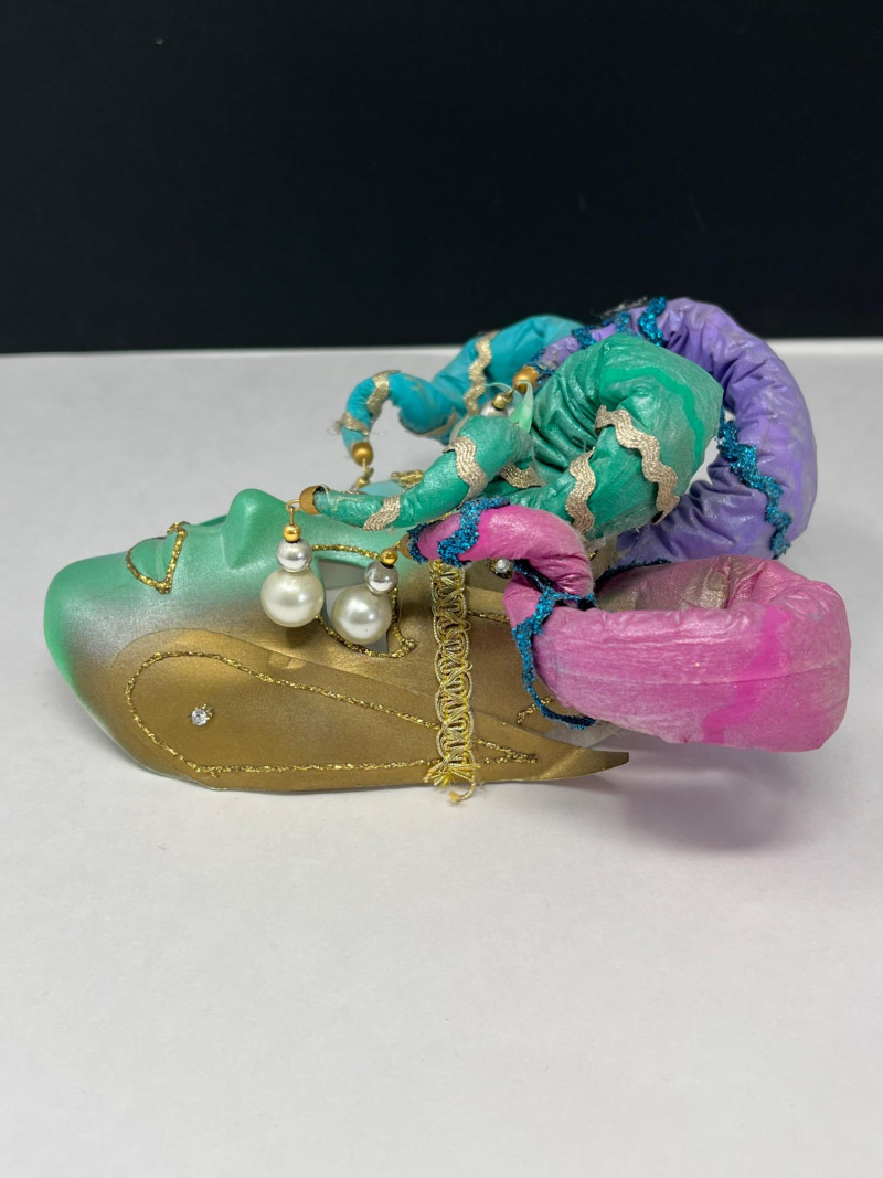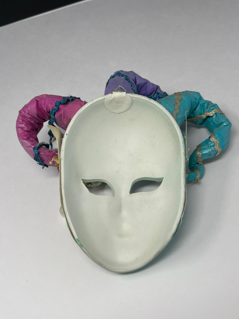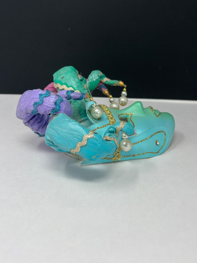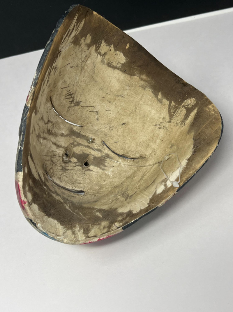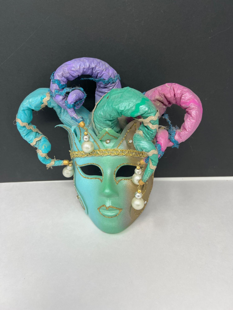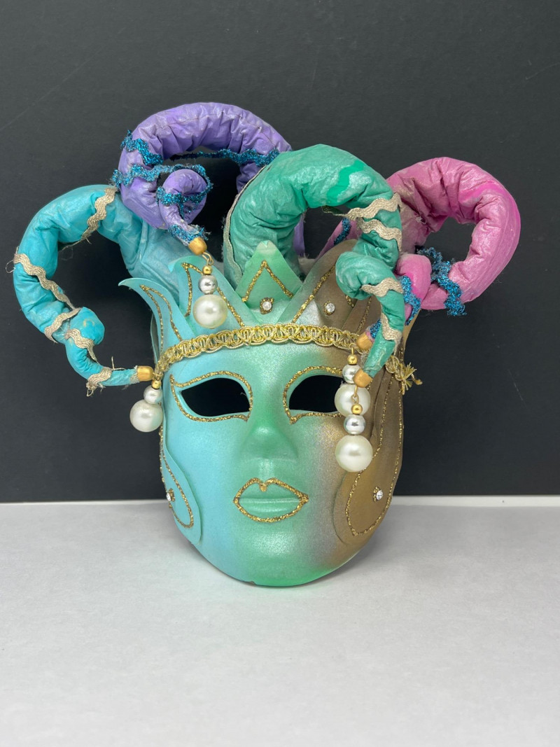 Italian mask was acquired in Italy. Ceramic face and papier mache hat Wood mask is hand carved and handpainted.
