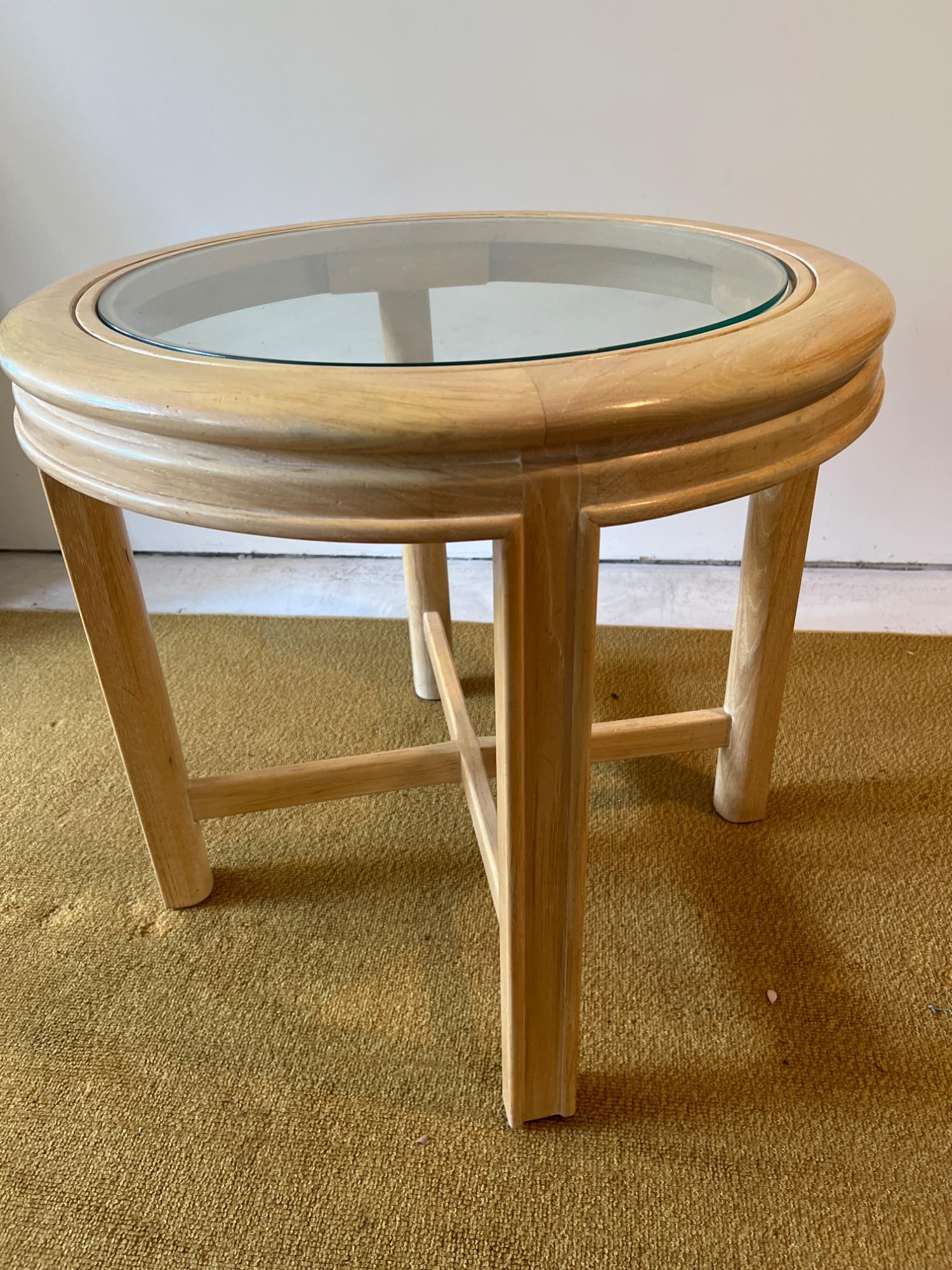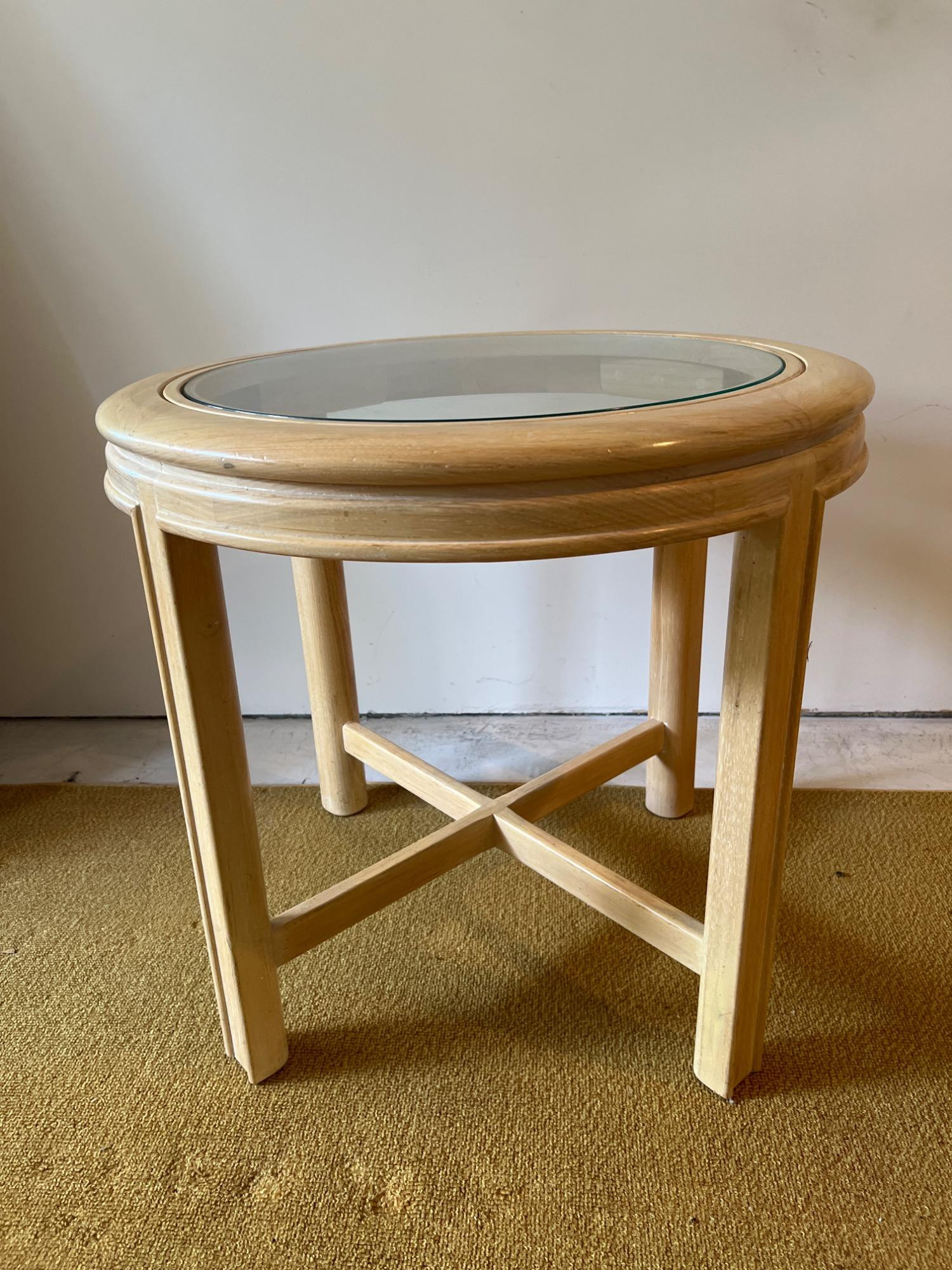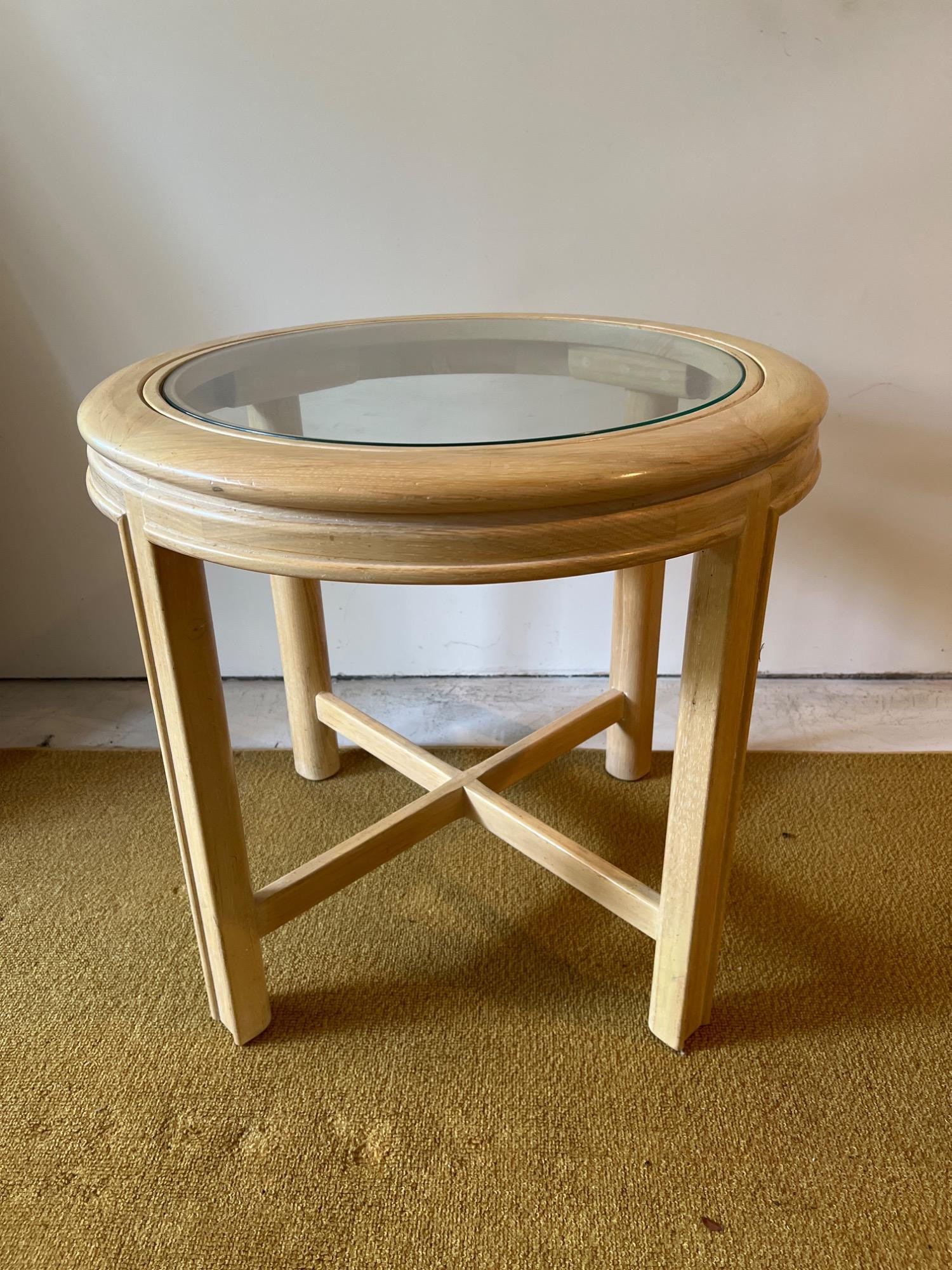 This blonde solid wood end table is a Drexel Heritage Round Glass Top Side/End Table. Drexel Heritage is known for its high-quality craftsmanship and timeless designs. The table has clean lines and a versatile design. No 31344. Blonde wood with glass top insert. See Lots 80 and 90 for additional furniture pieces from the same vintage Drexel Heritage collection. Located on a ground floor level, no steps.