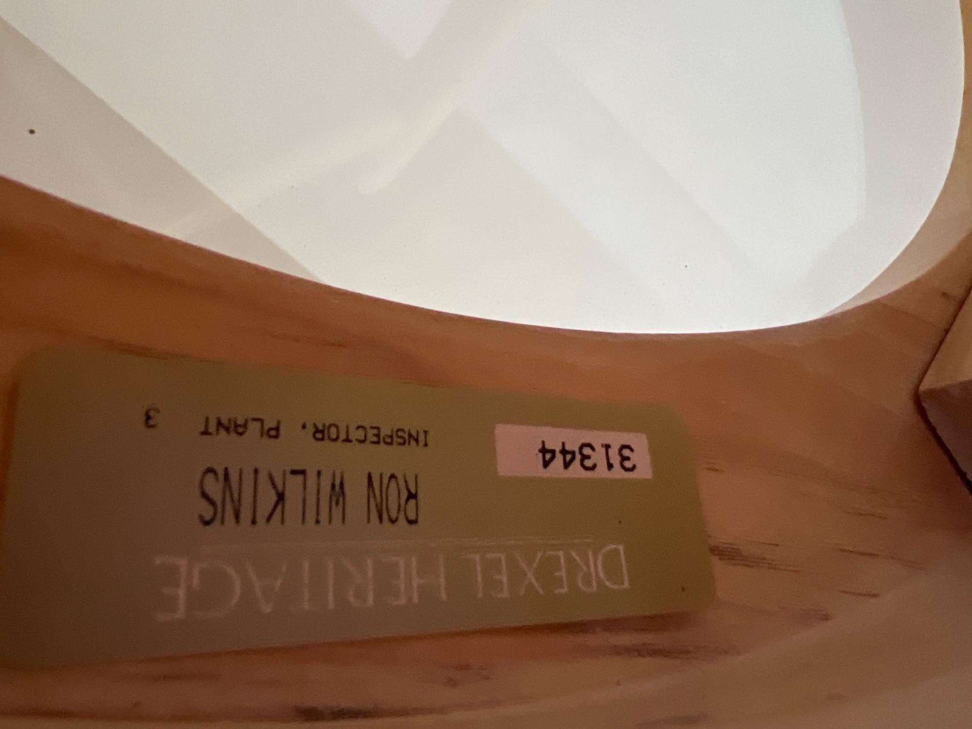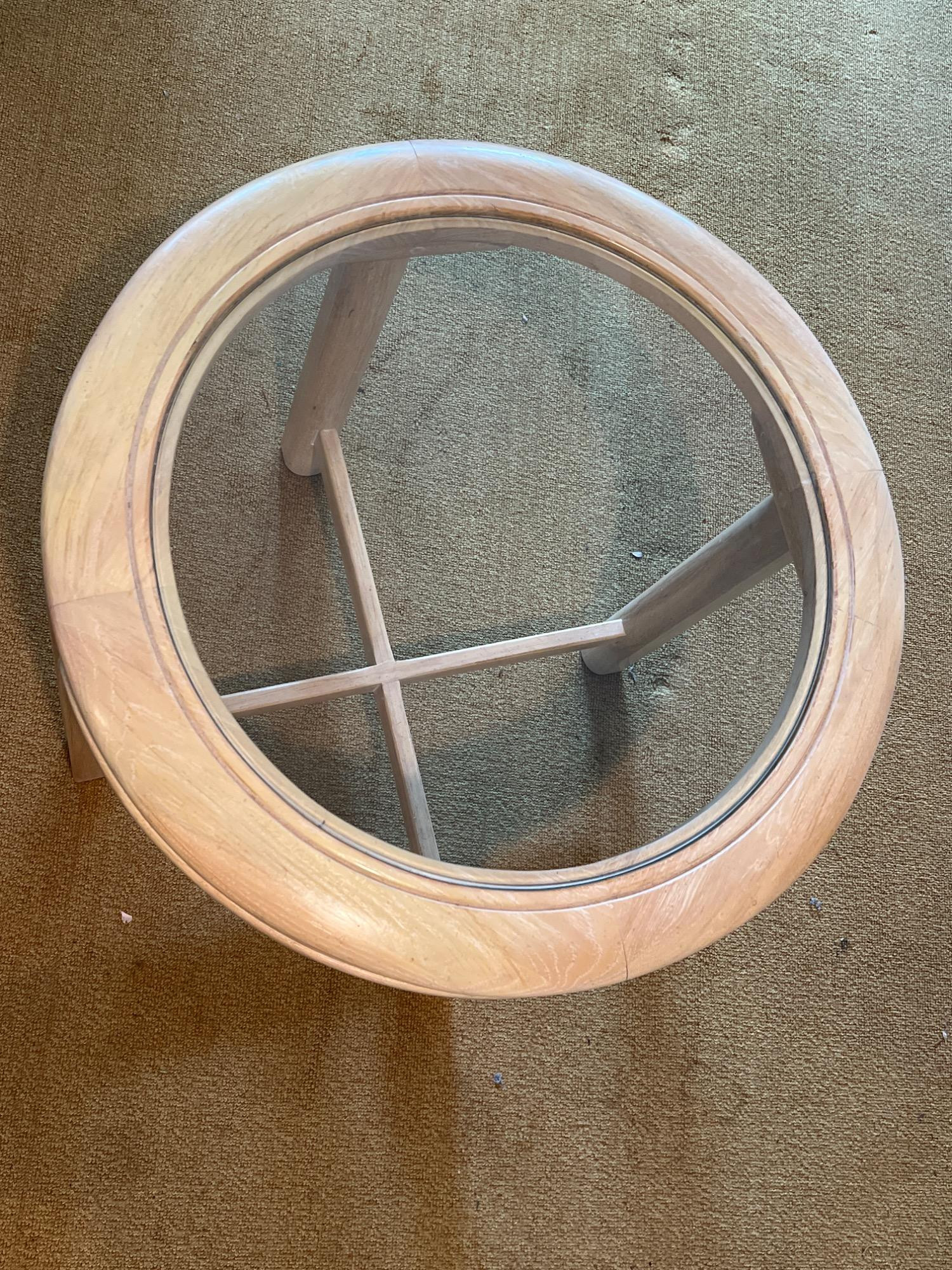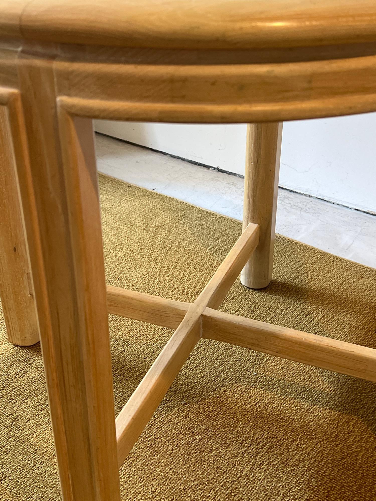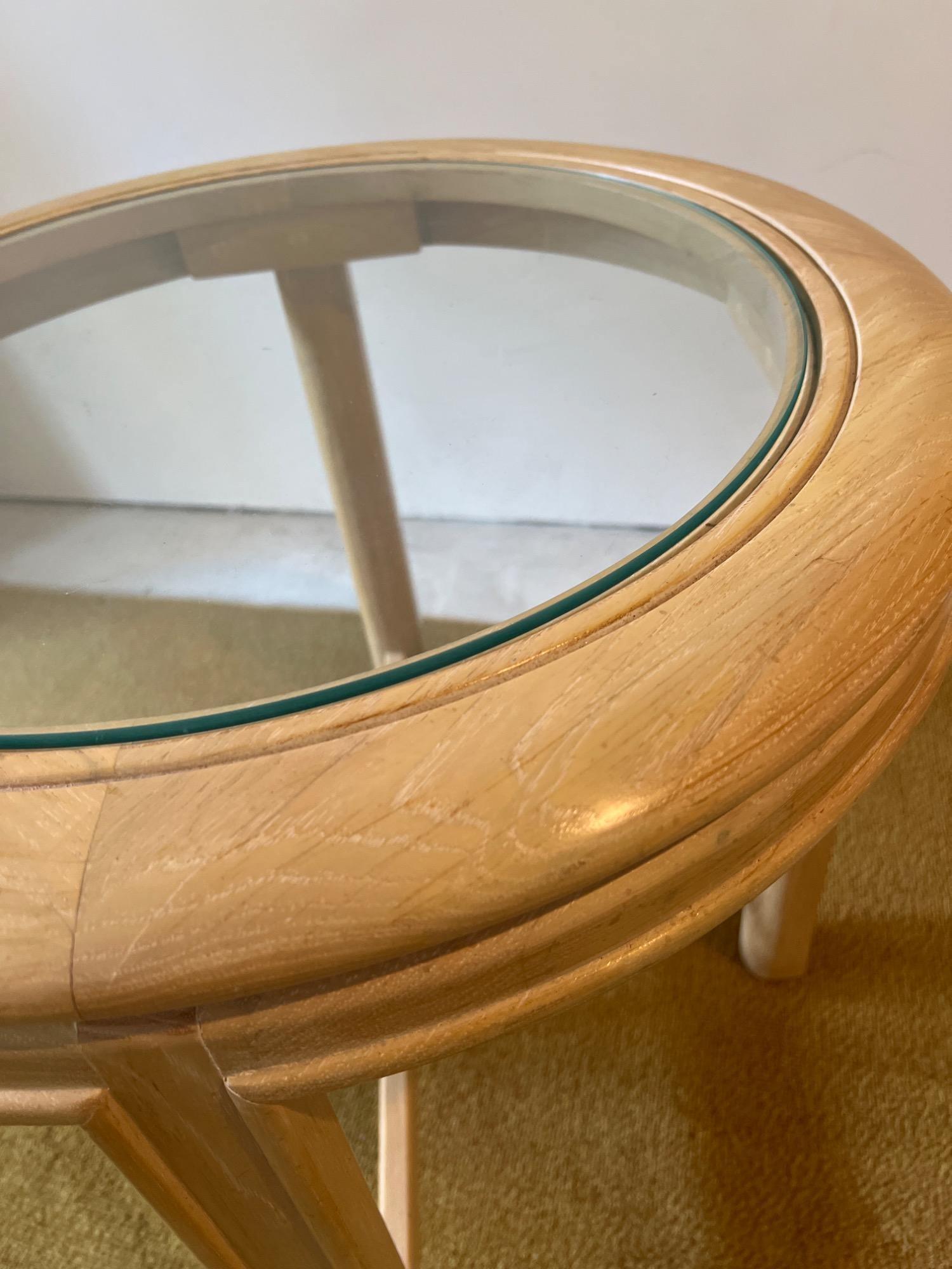 This blonde solid wood end table is a Drexel Heritage Round Glass Top Side/End Table. Drexel Heritage is known for its high-quality craftsmanship and timeless designs. The table has clean lines and a versatile design. No 31344. Blonde wood with glass top insert. See Lots 80 and 90 for additional furniture pieces from the same vintage Drexel Heritage collection. Located on a ground floor level, no steps.