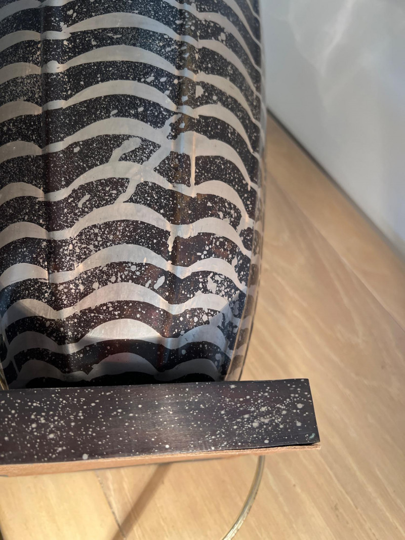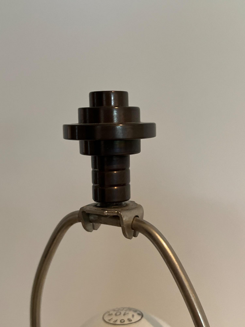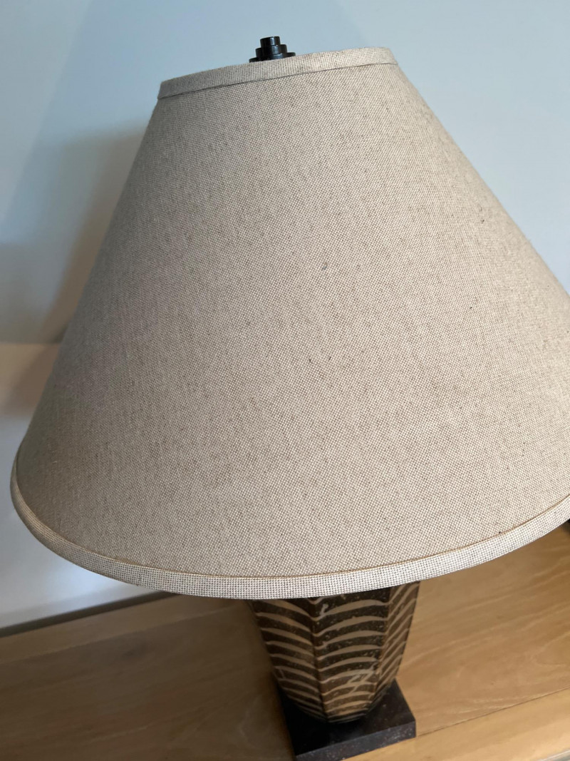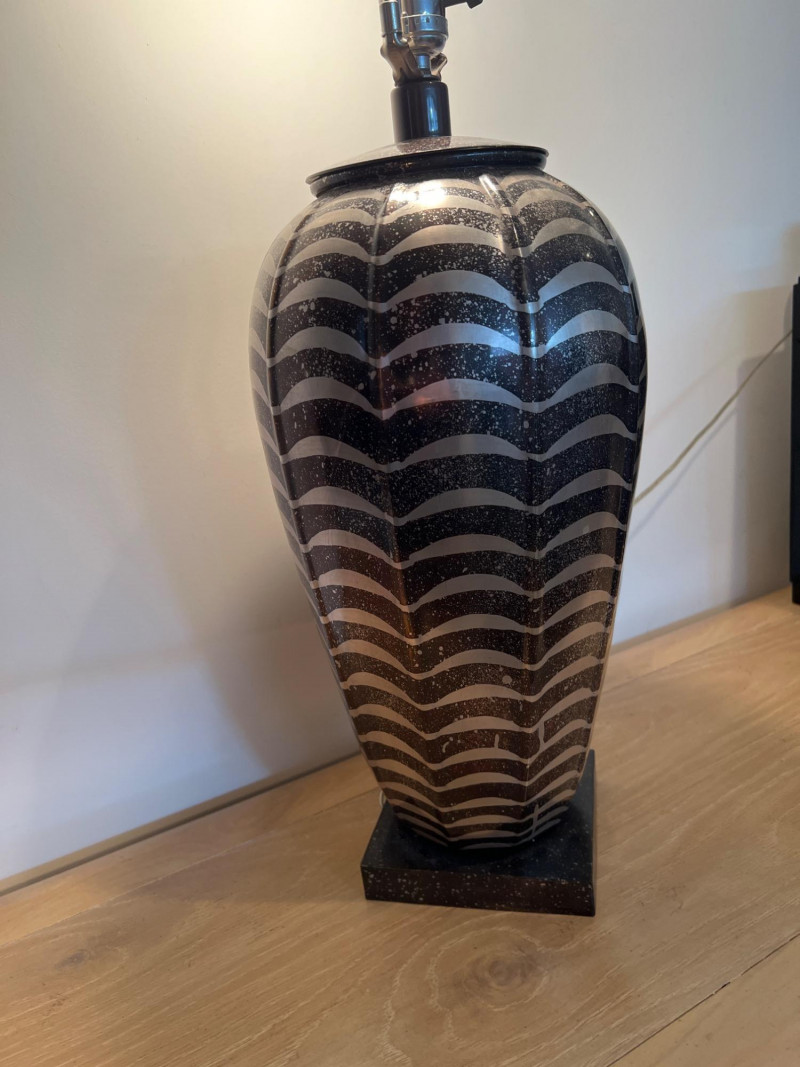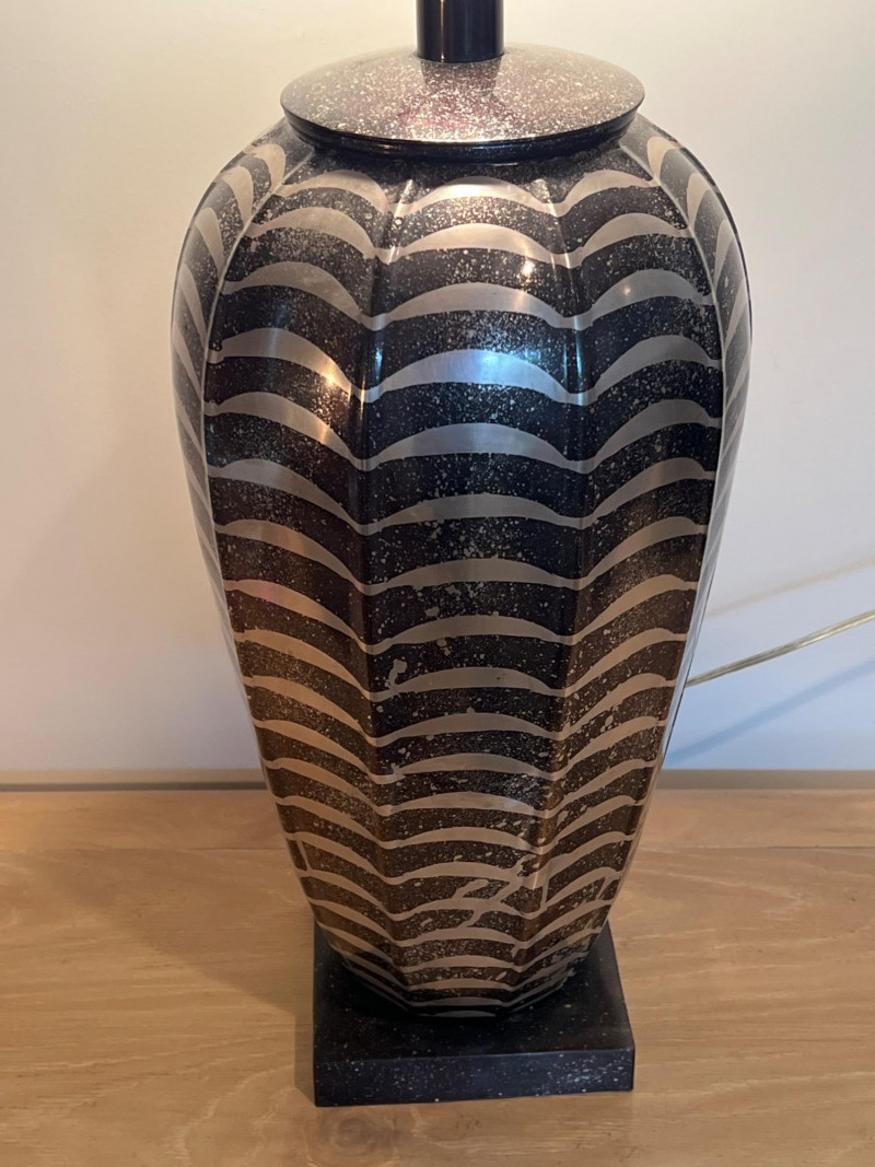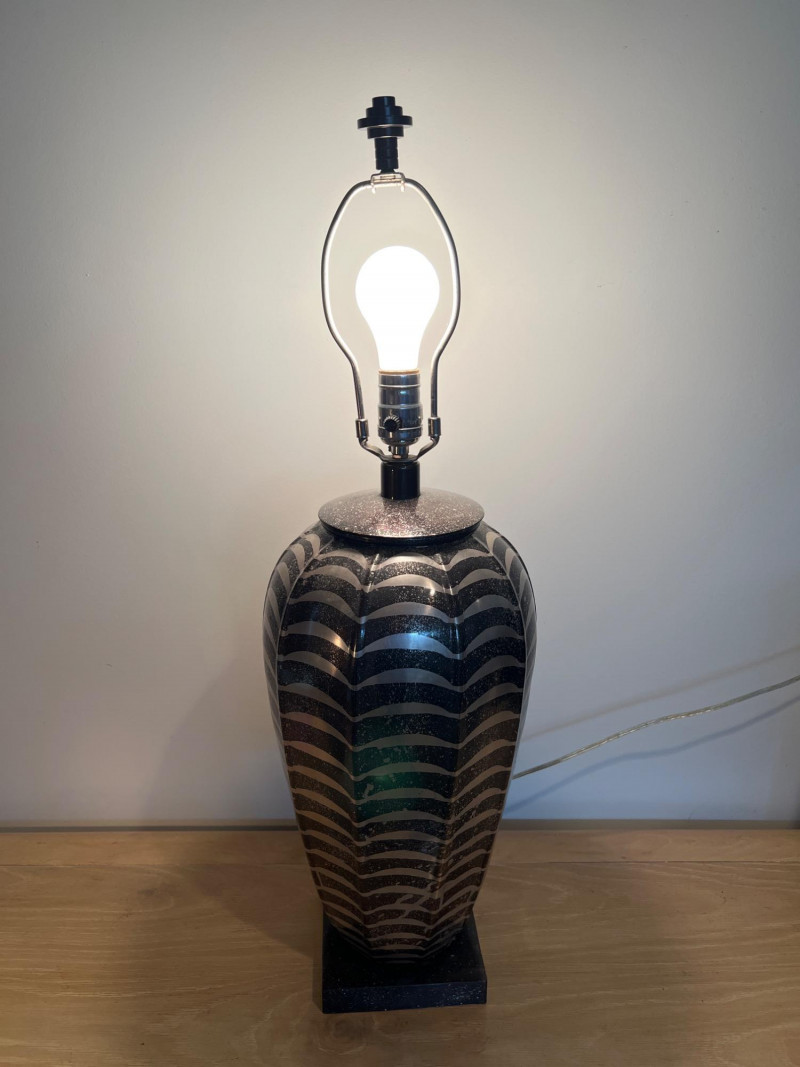 Jay Spectre has a distinctive design that blends modernism with Art Deco influences. Spectre, an acclaimed American designer, was known for his luxurious and sophisticated creations, often incorporating sleek lines, rich materials, and bold geometric shapes. His lamps are not just functional lighting pieces but also artistic statements that elevate any space. This lamp was designed for Paul Hansen. It features a striking combination of materials and textures, such as lacquered steel, ceramic, or nickel. These lamps were crafted with meticulous attention to detail. Base is 6 inches x 6 inches. Shade is 14 inches height x 22 inches diameter at bottom. Overall: