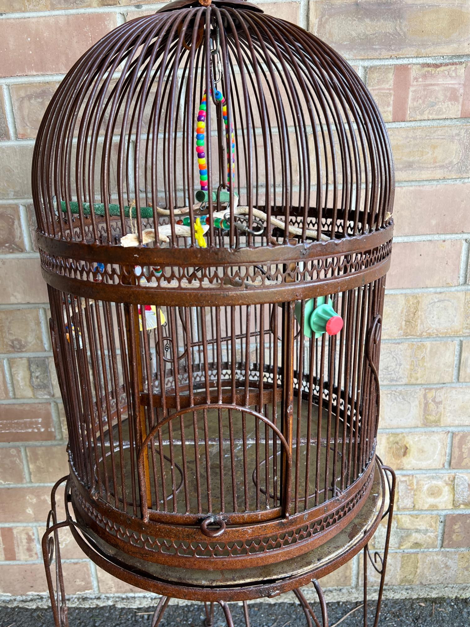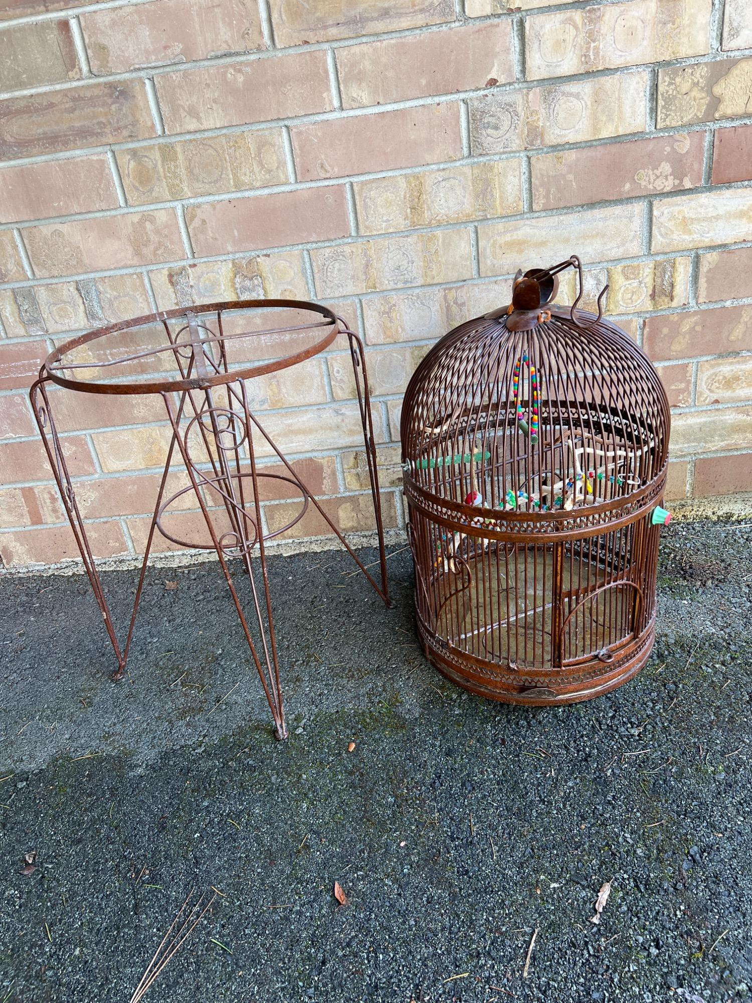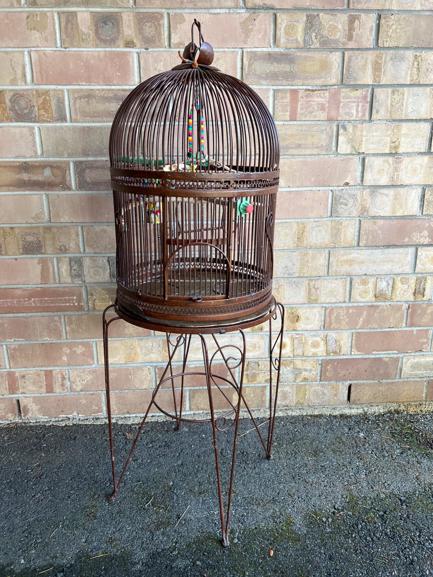 Bird cage has removable tray at bottom for ease in cleaning. Hinged door. Includes iron stand. Cage has weight (vintage to antique). CAGE: 23 inches height x 17 inches diameter STAND: 25.5 inches tall x 17.5 inch diameter OVERALL: