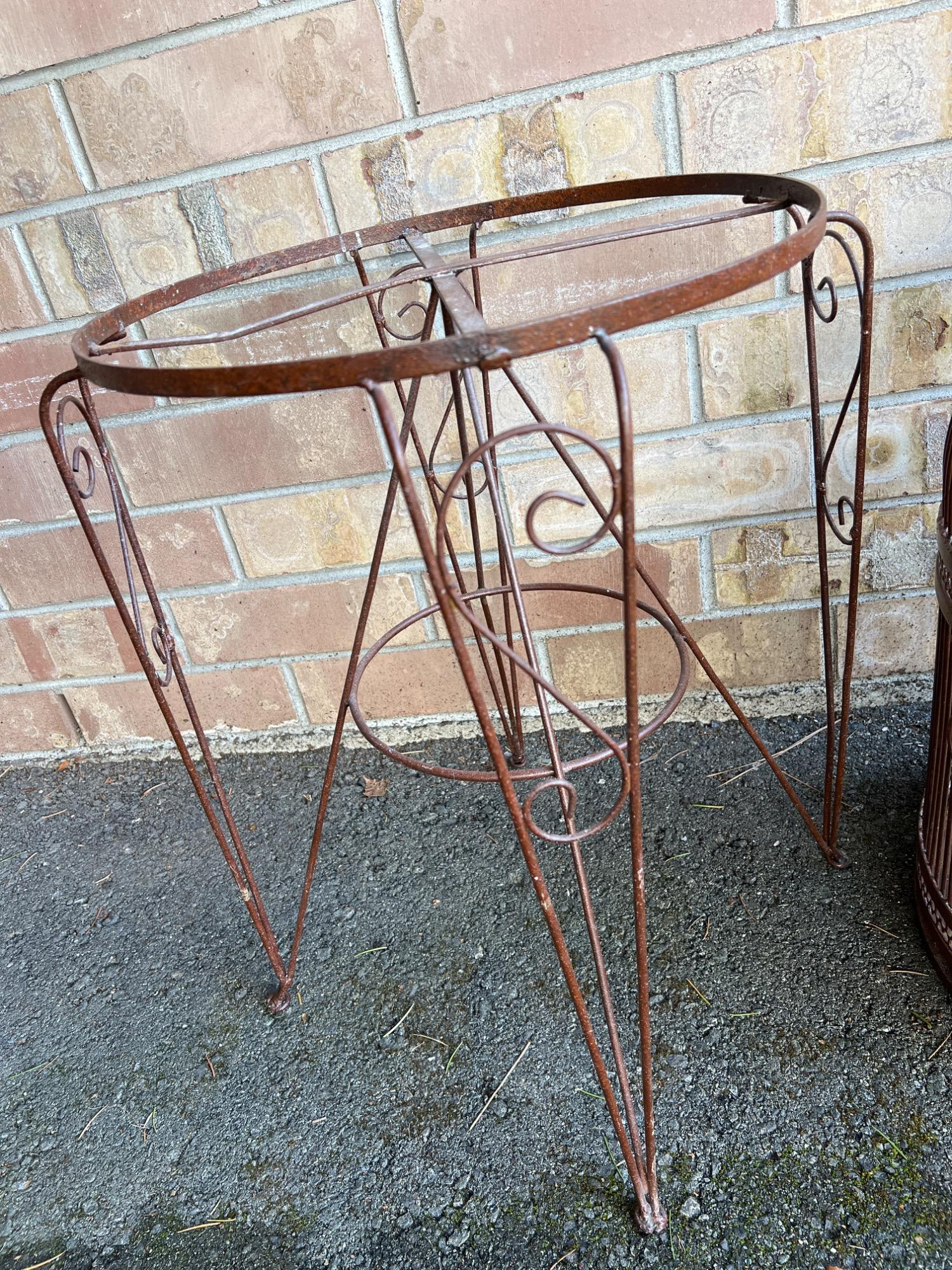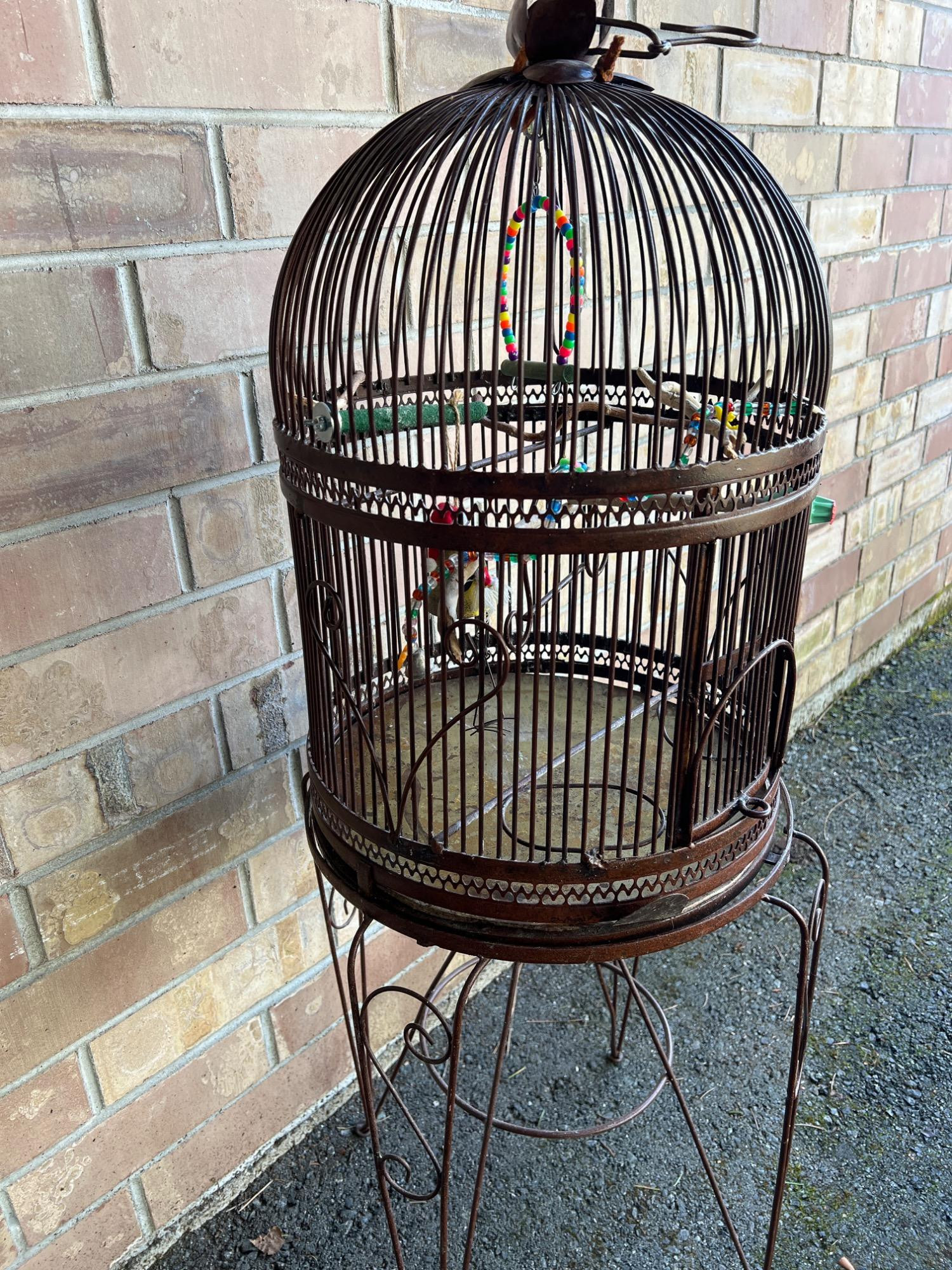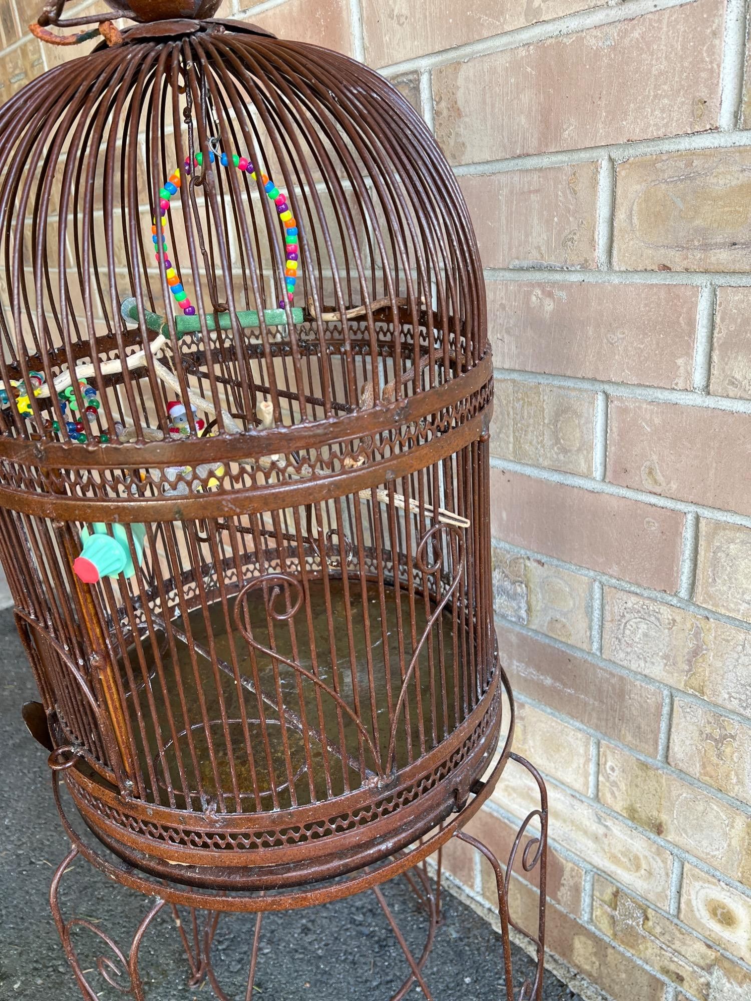 Bird cage has removable tray at bottom for ease in cleaning. Hinged door. Includes iron stand. Cage has weight (vintage to antique). CAGE: 23 inches height x 17 inches diameter STAND: 25.5 inches tall x 17.5 inch diameter OVERALL: