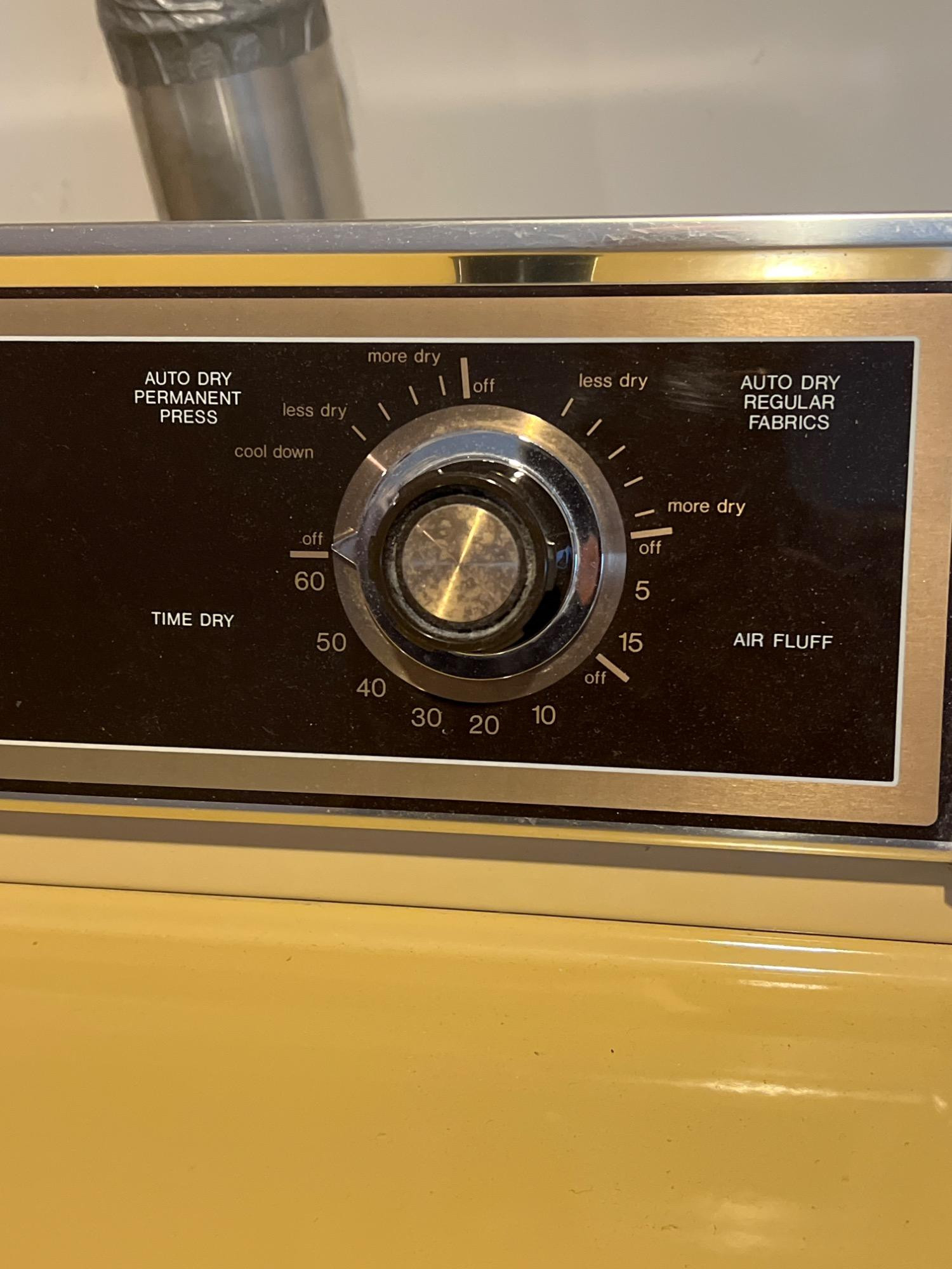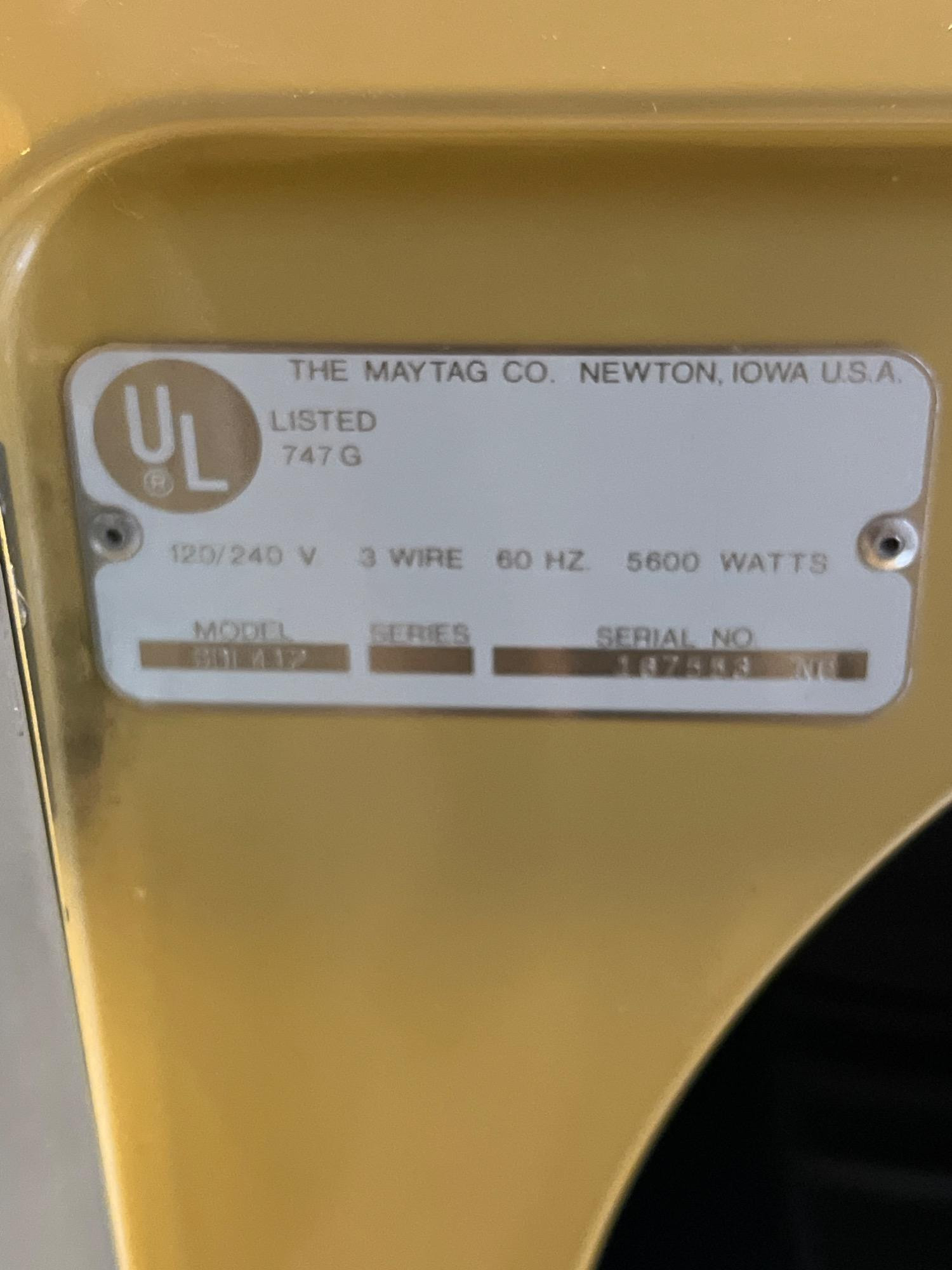 Maytag dryer in working condition. Age of dryer may be 1980s or as late as 2006. Serial: 187553NC, Model #801 412. Inside clean, normal wear/tear to exterior. Note cosmetic issue with instrument panel (bubbling to surface at left). Bidding on this lot is an agreement that: (1.) You will have 2 capable, able-bodied persons to lift and load at a minimum. (2.) You