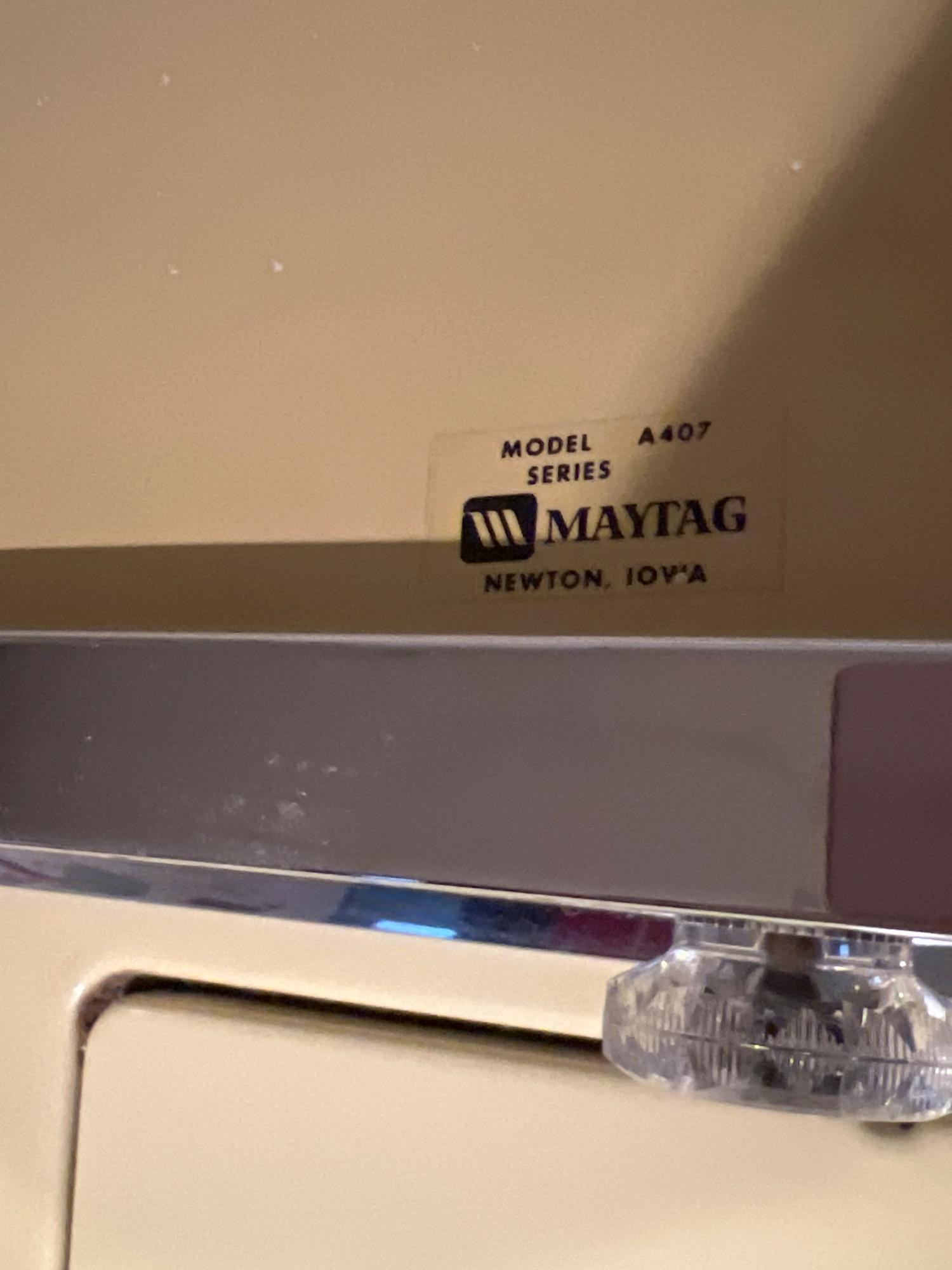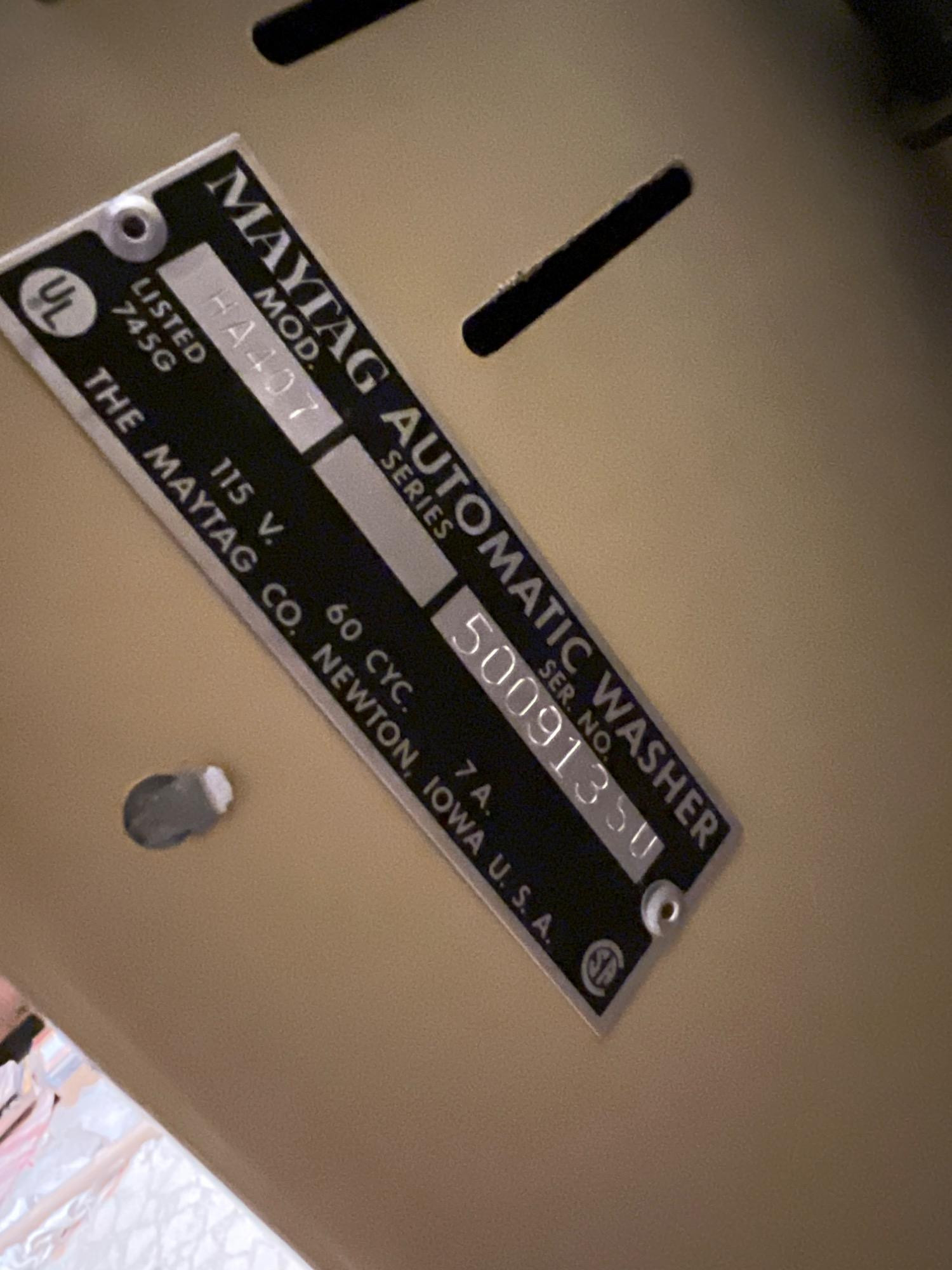 Model HA407, Serial #500913SU, Maytag washer most likely manufactured in 1997. Washer is in working condition. Appears that the "Large" push button is broken. Tub fills with water, agitates and drains. Bidding on this lot is an agreement that: (1.) You will have 2 capable, able-bodied persons to lift and load at a minimum. (2.) You