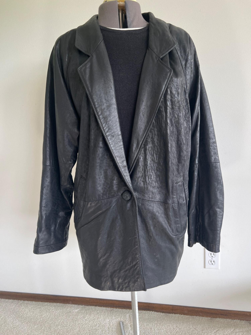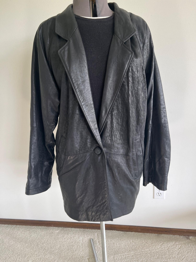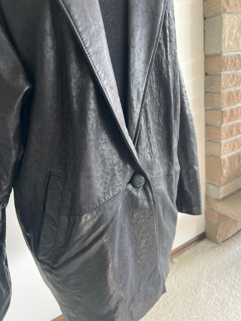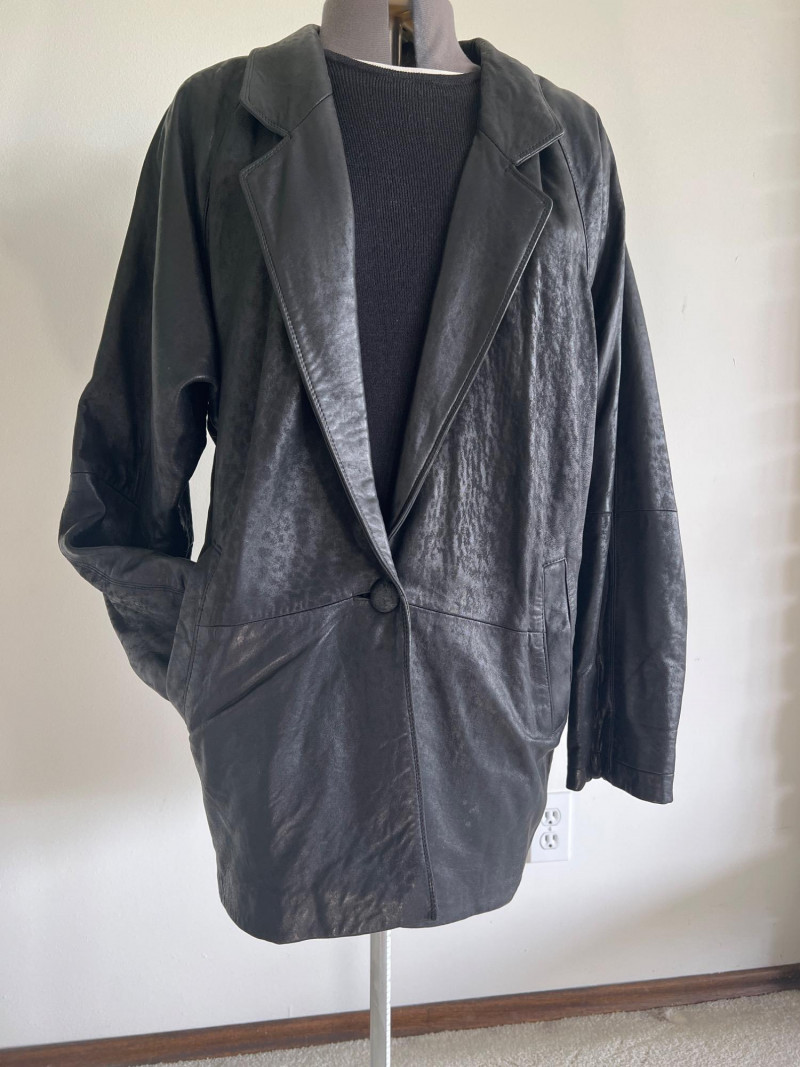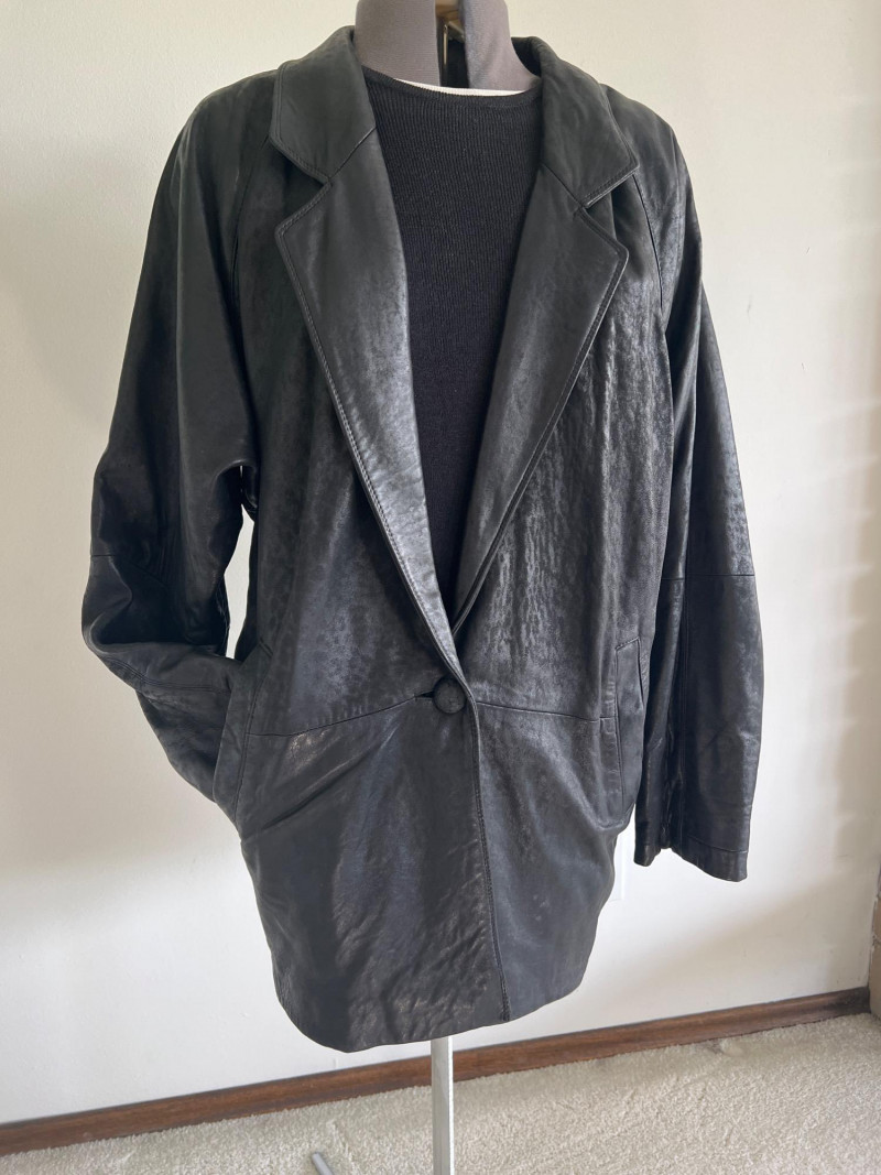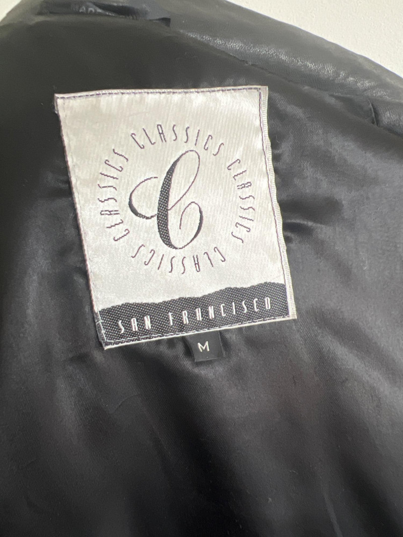 Vintage black leather blazer/jacket, "San Francisco Classics" brand. This leather appears to have undergone a distressing techniques, like applying rubbing alcohol and manipulating the material, to enhance the vintage look of the leather. Side pockets and fully lined. Size Medium.