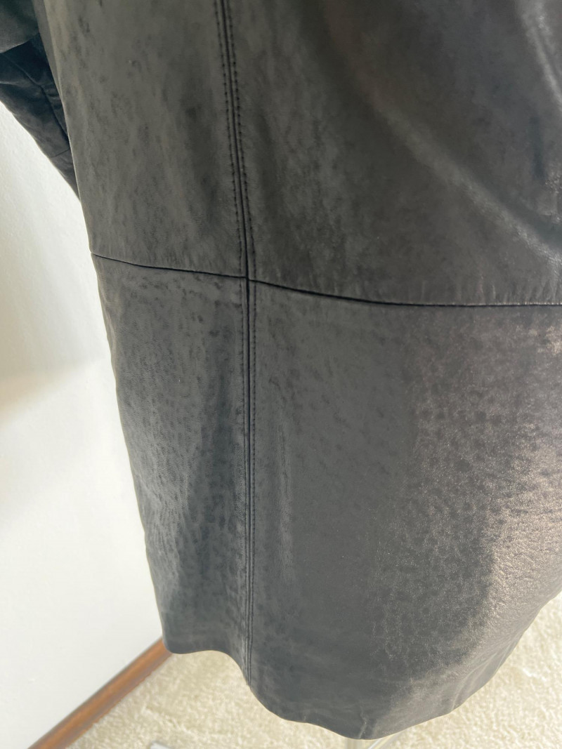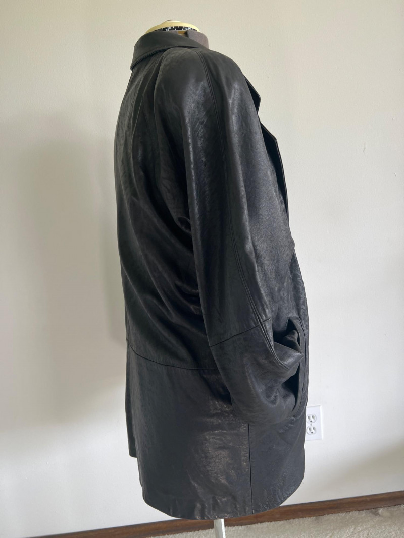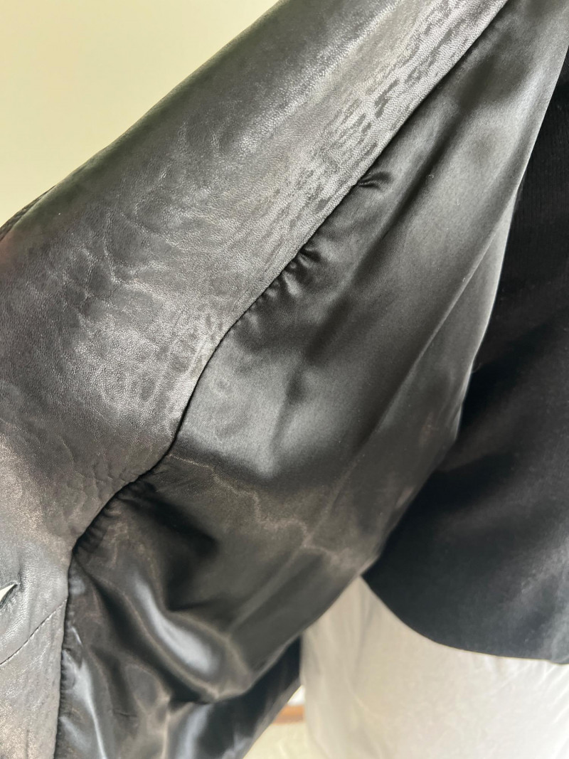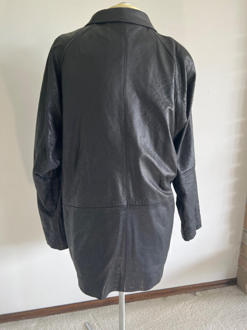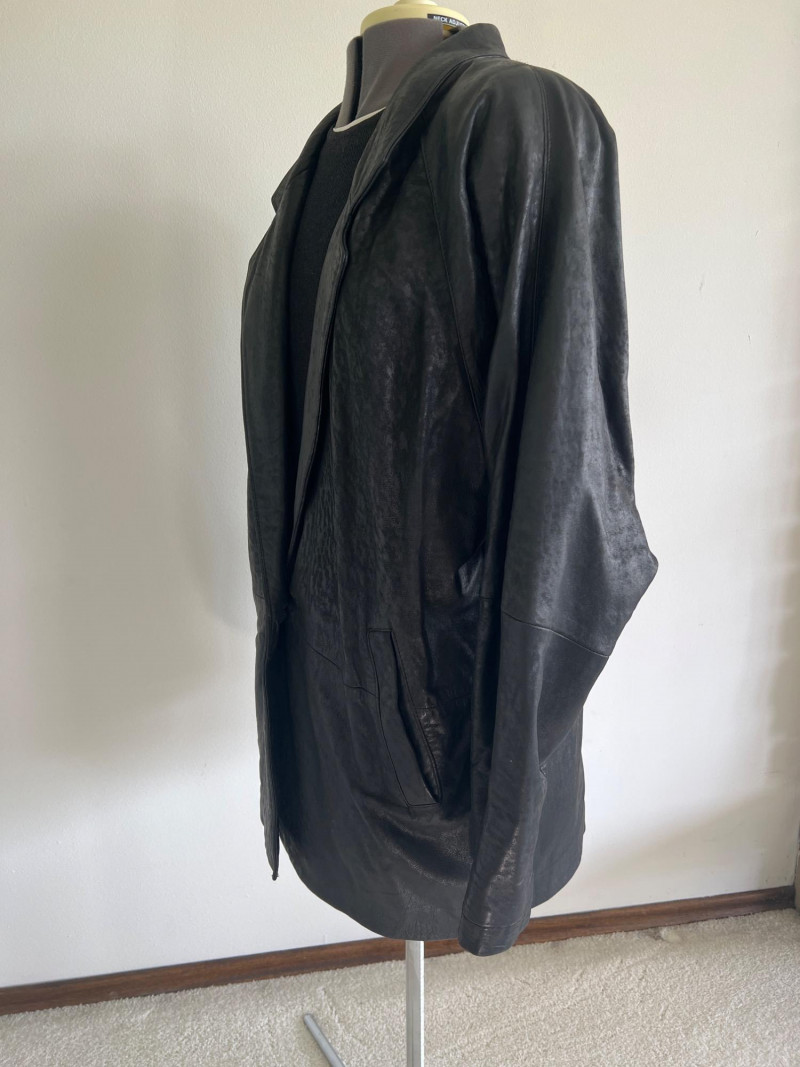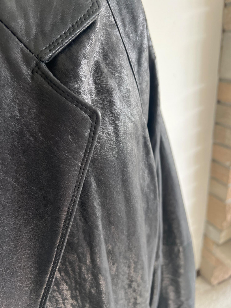 Vintage black leather blazer/jacket, "San Francisco Classics" brand. This leather appears to have undergone a distressing techniques, like applying rubbing alcohol and manipulating the material, to enhance the vintage look of the leather. Side pockets and fully lined. Size Medium.