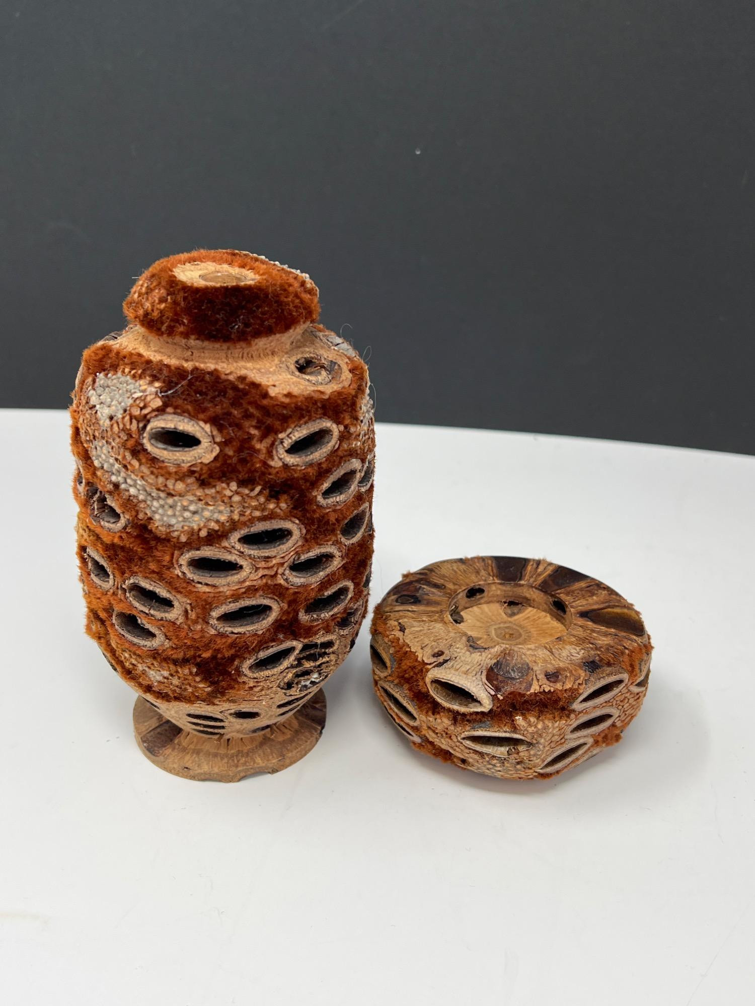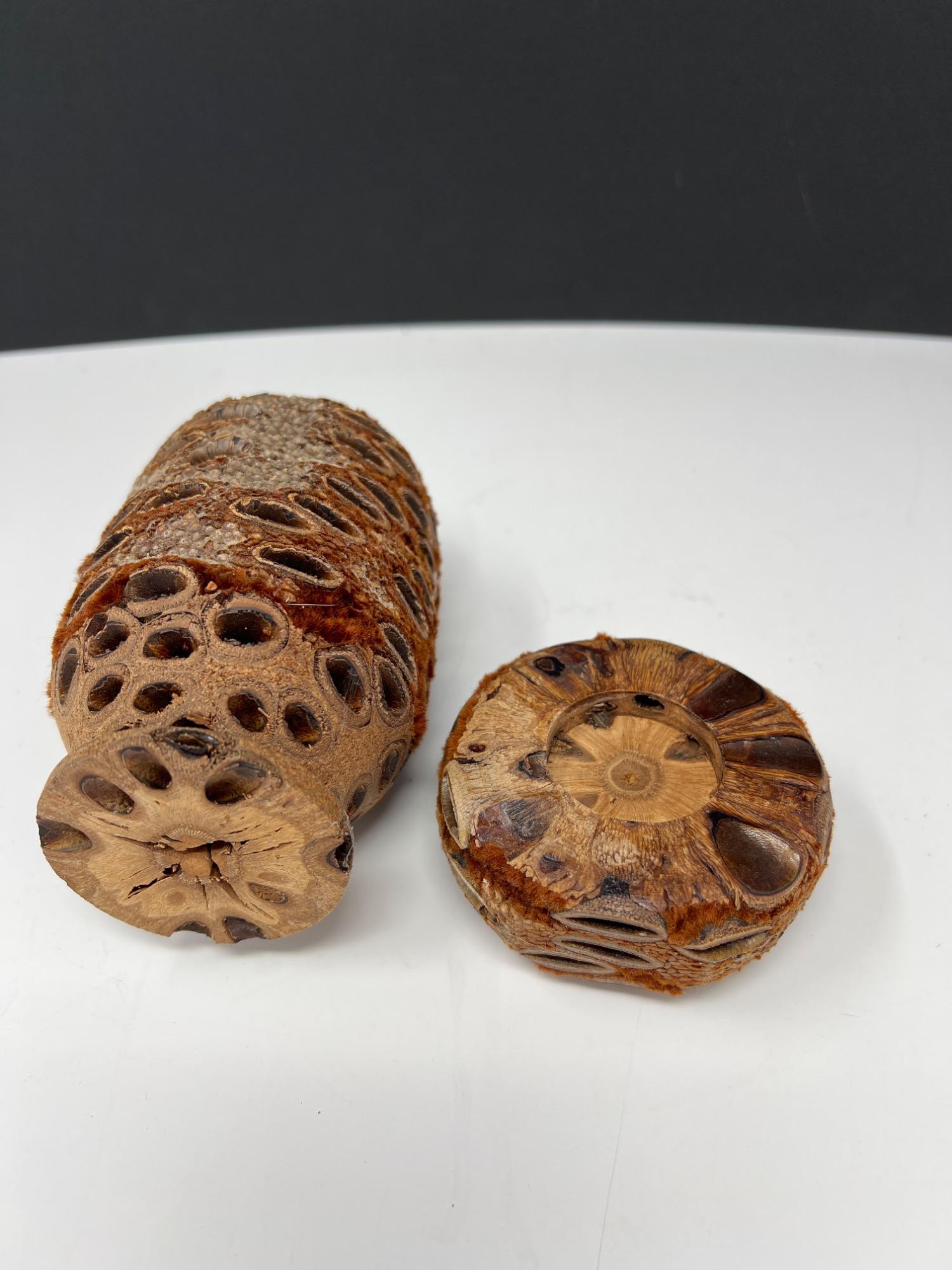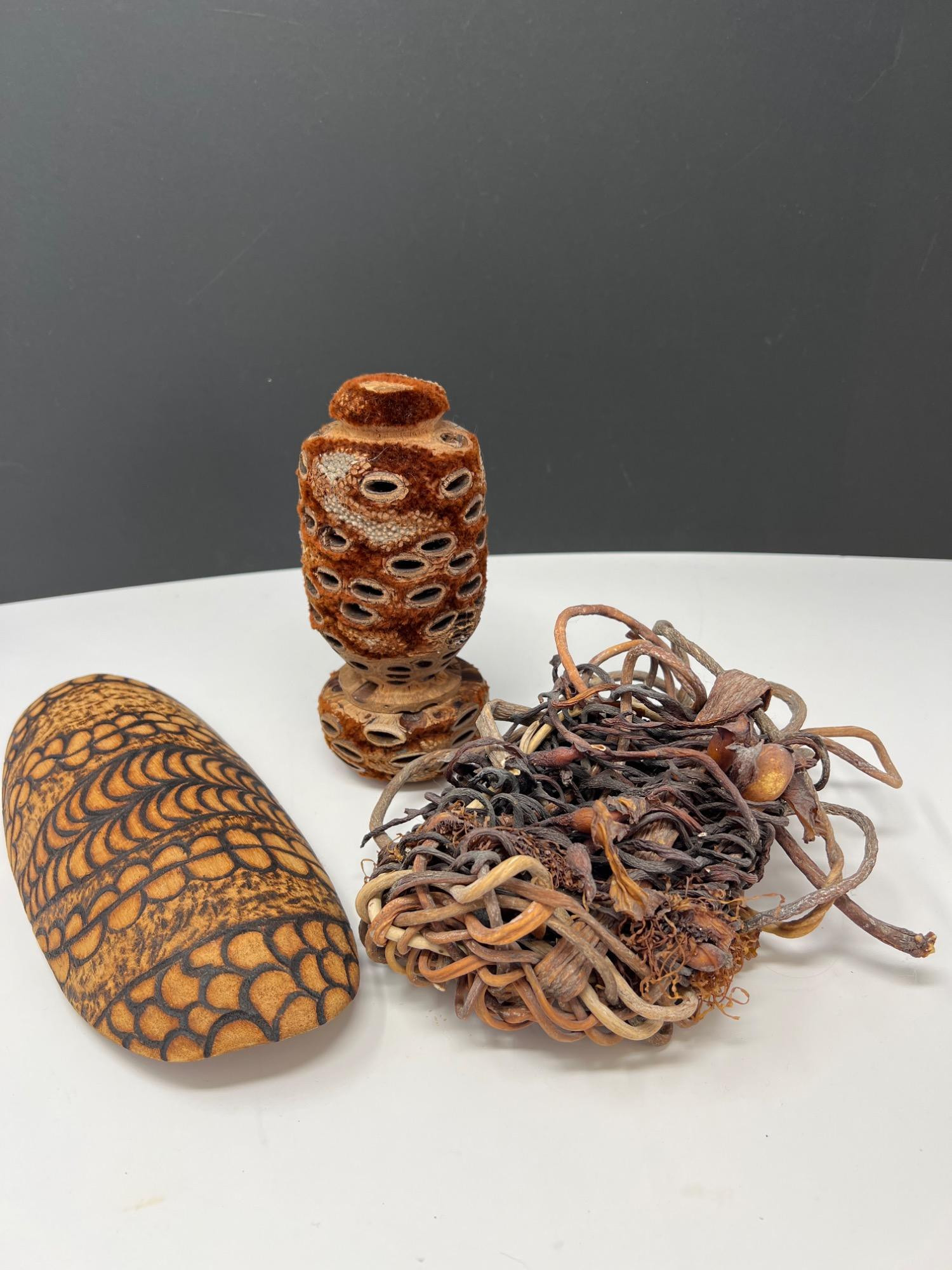 Carved Australian Banksia Seedpod Vase - 7 inches height x 3 inches round Australian Aboriginal Carved Wooden Coolamon Bowl - 11 inches length x 3 inches wide (signed) Bull Whip Kelp (Oregon, USA) - 9 inches long x 7 inches wide
