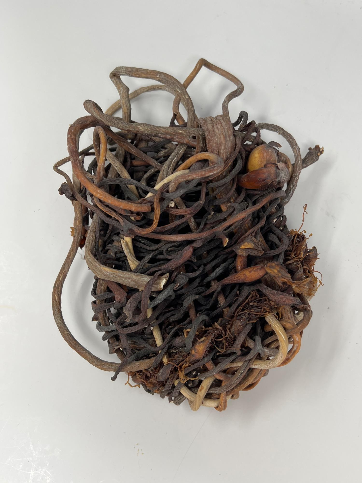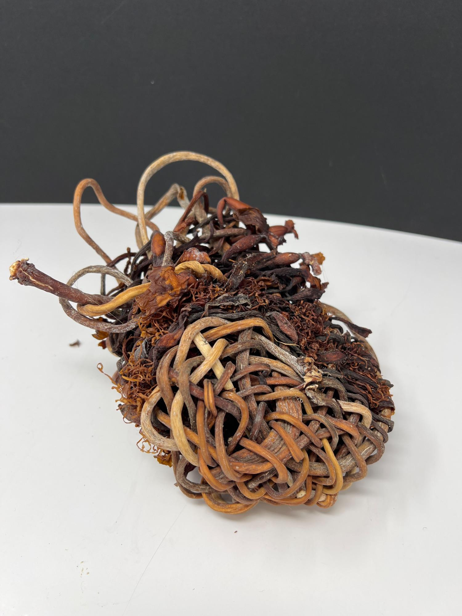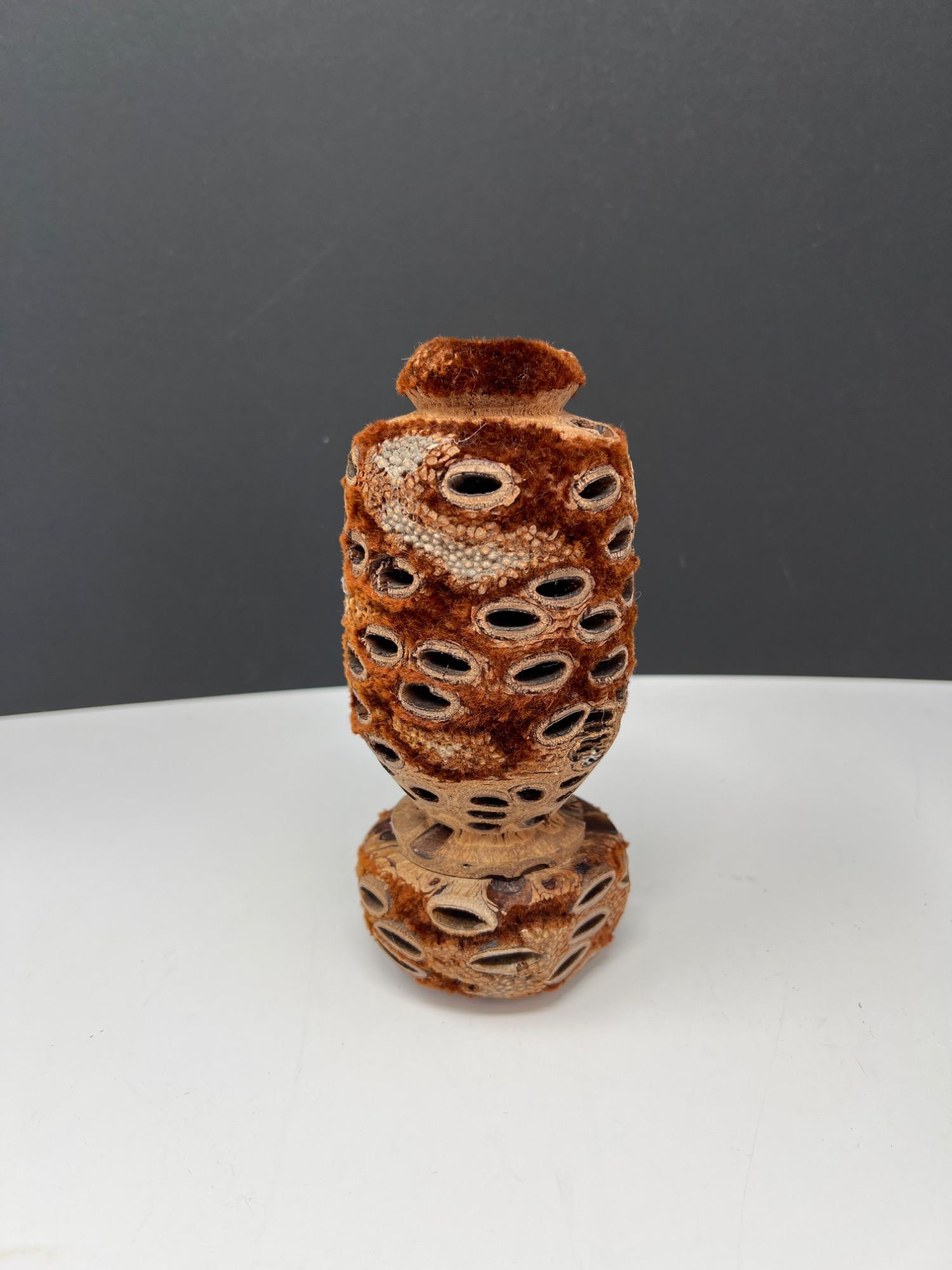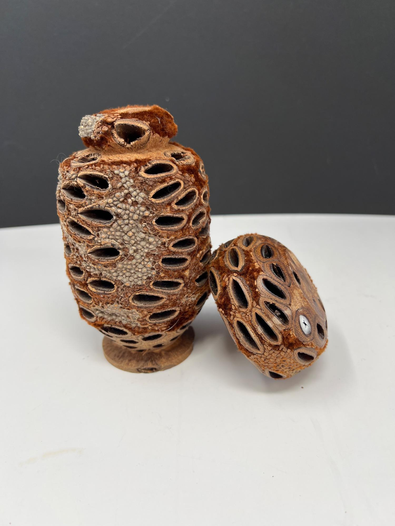 Carved Australian Banksia Seedpod Vase - 7 inches height x 3 inches round Australian Aboriginal Carved Wooden Coolamon Bowl - 11 inches length x 3 inches wide (signed) Bull Whip Kelp (Oregon, USA) - 9 inches long x 7 inches wide