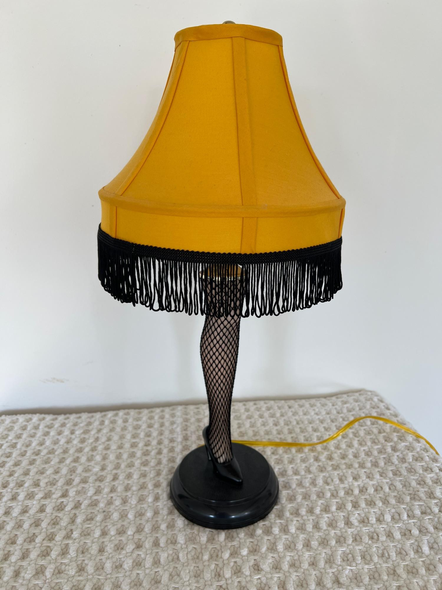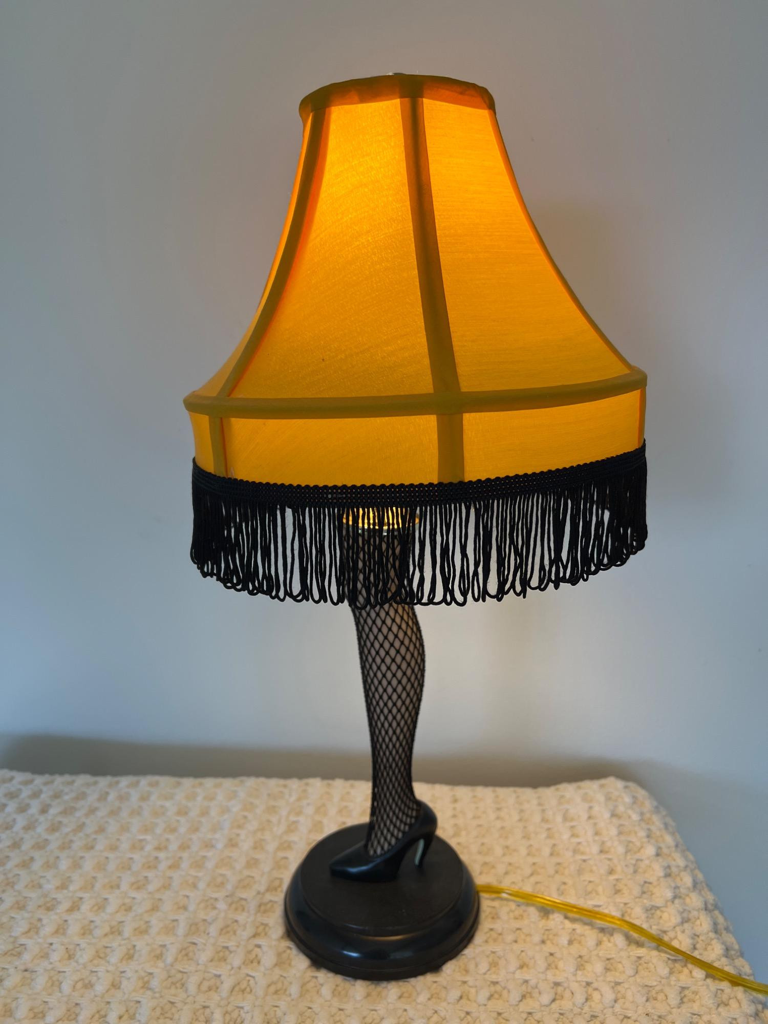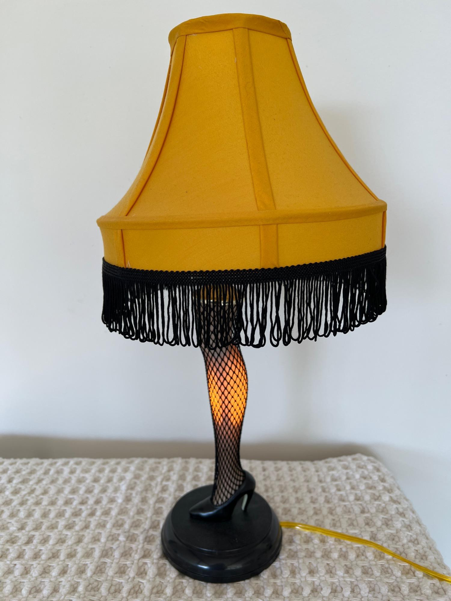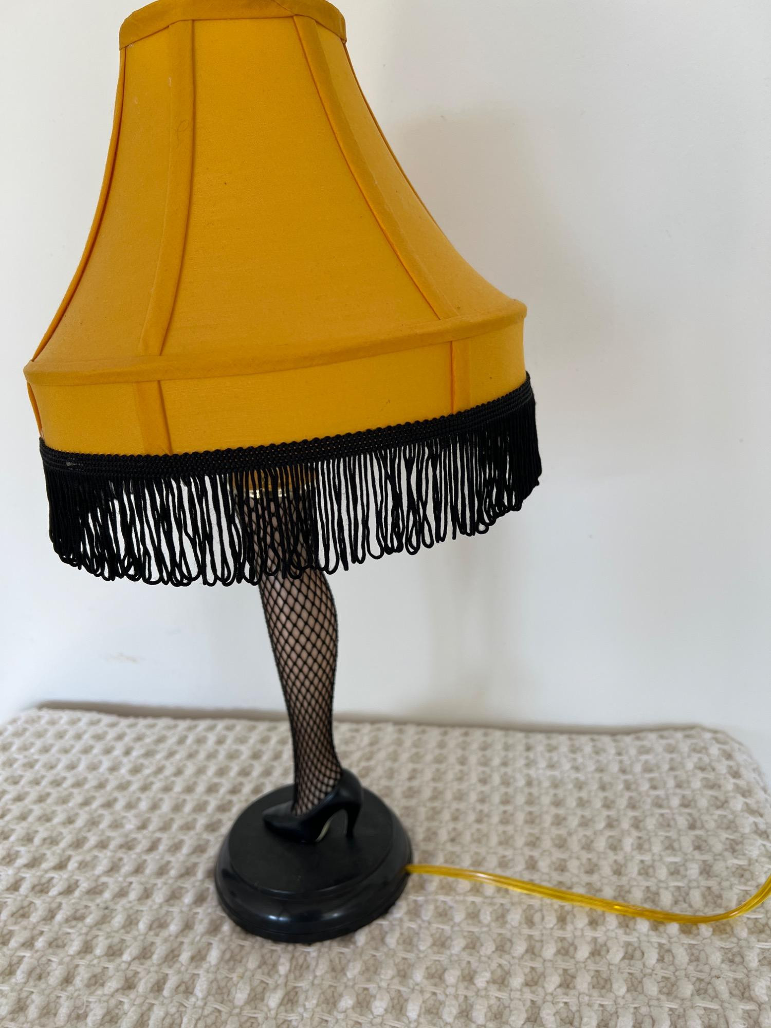 This lamp is a quirky and iconic piece, famously known as the Leg Lamp from the movie A Christmas Story. It is designed to resemble a woman's leg wearing fishnet stockings and a black high-heeled shoe, topped with a yellow lampshade with black fringe. The lamp is celebrated for its distinctive and humorous design, embodying a playful and nostalgic charm. It's often associated with holiday decor and adds a touch of whimsy to any space. This lamp is stamped Sun-Lite, made in China. Most likely a replica.