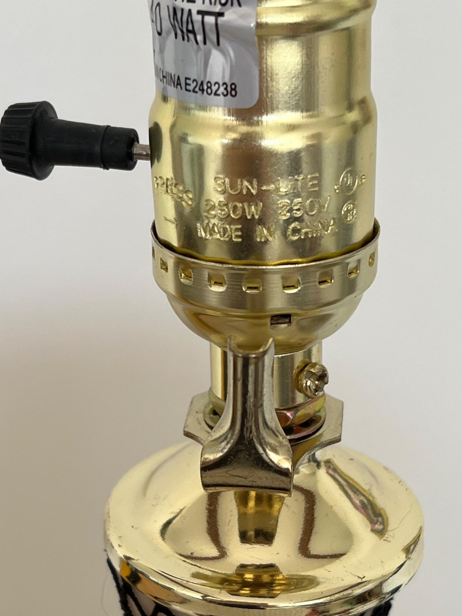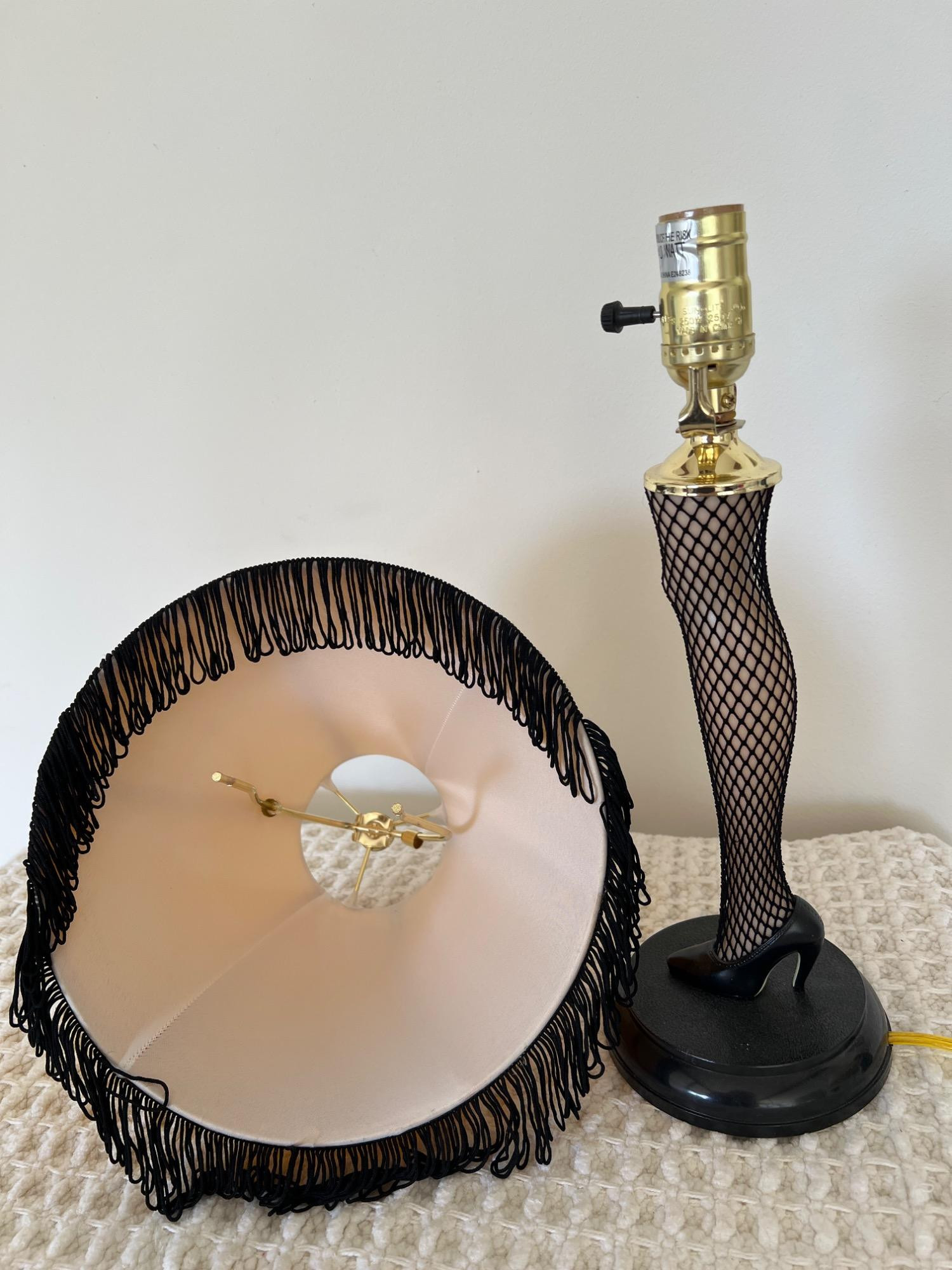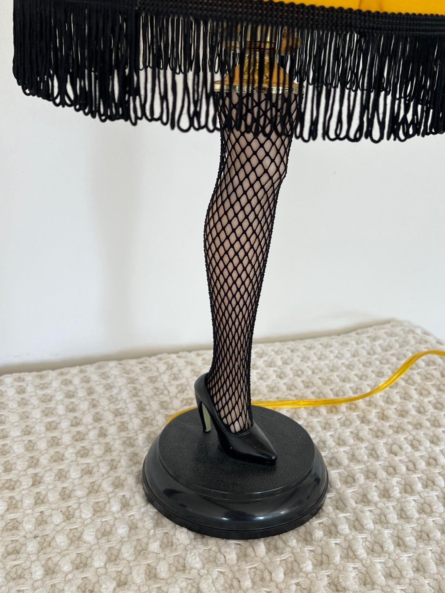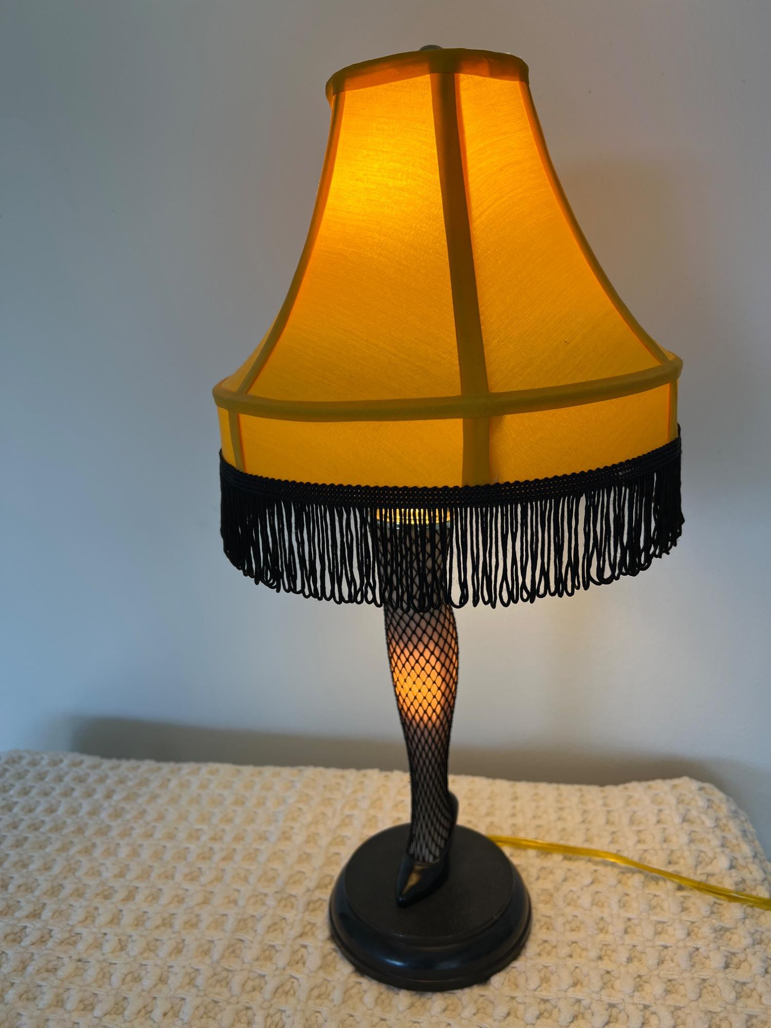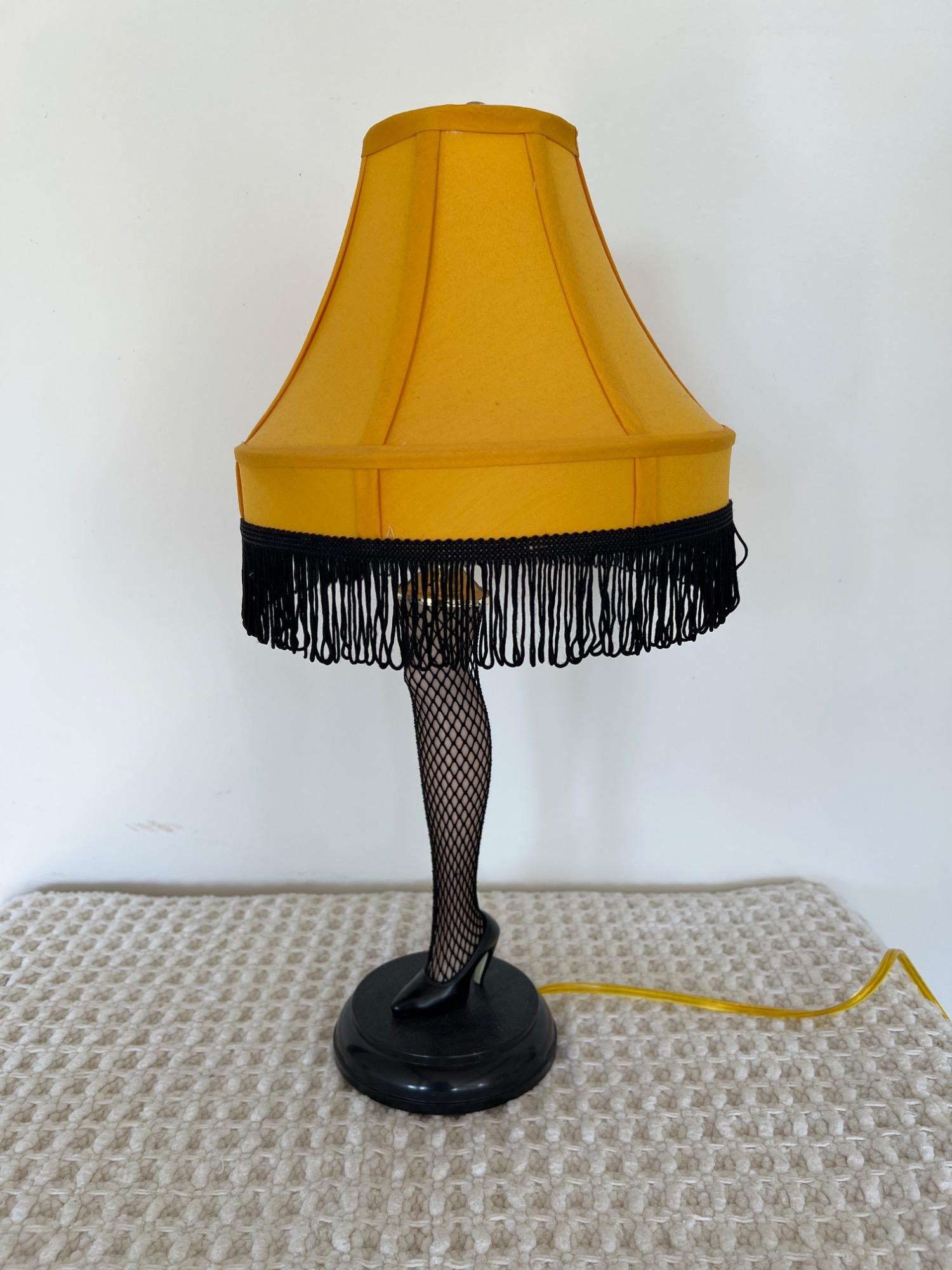 This lamp is a quirky and iconic piece, famously known as the Leg Lamp from the movie A Christmas Story. It is designed to resemble a woman's leg wearing fishnet stockings and a black high-heeled shoe, topped with a yellow lampshade with black fringe. The lamp is celebrated for its distinctive and humorous design, embodying a playful and nostalgic charm. It's often associated with holiday decor and adds a touch of whimsy to any space. This lamp is stamped Sun-Lite, made in China. Most likely a replica.