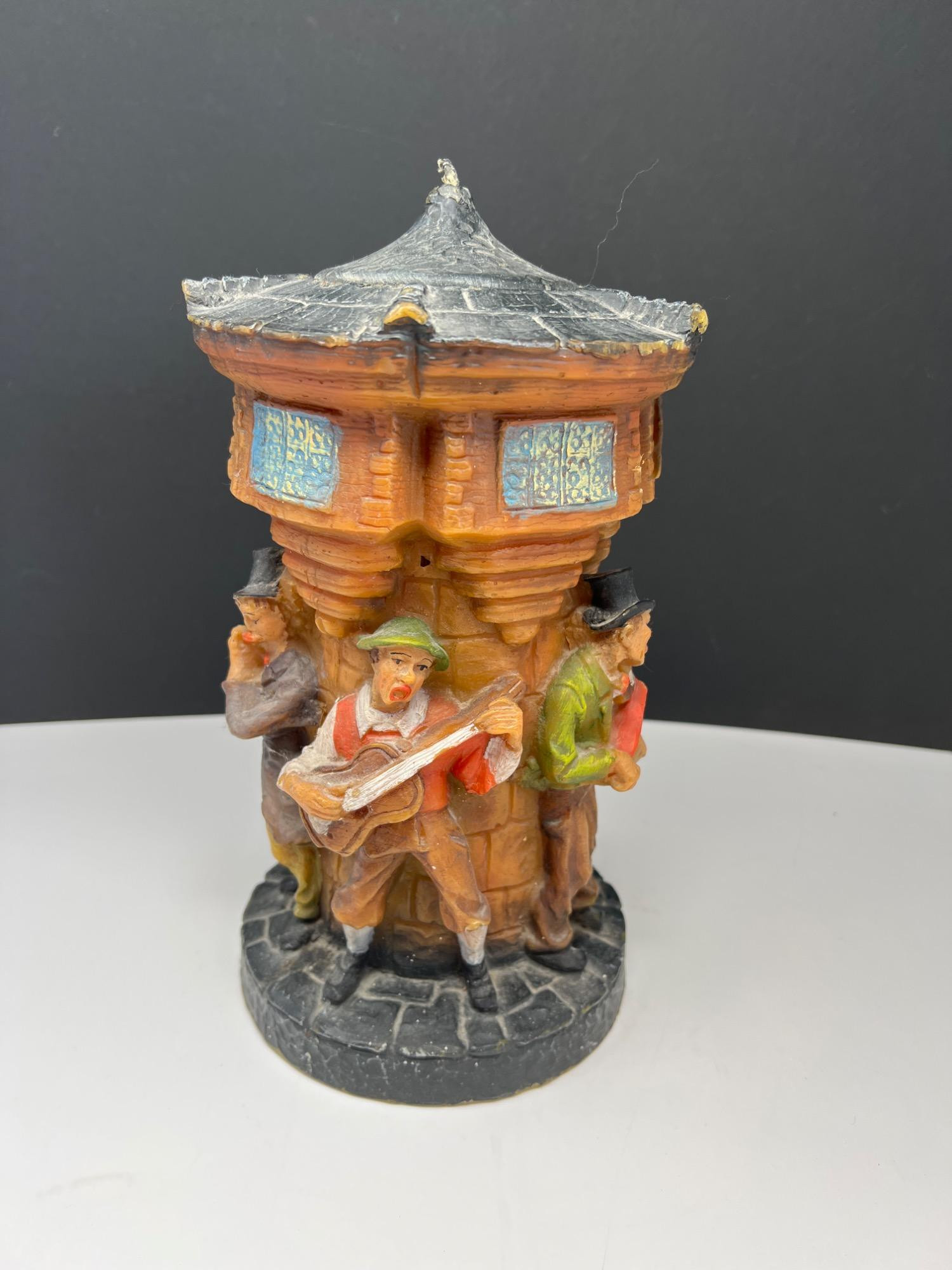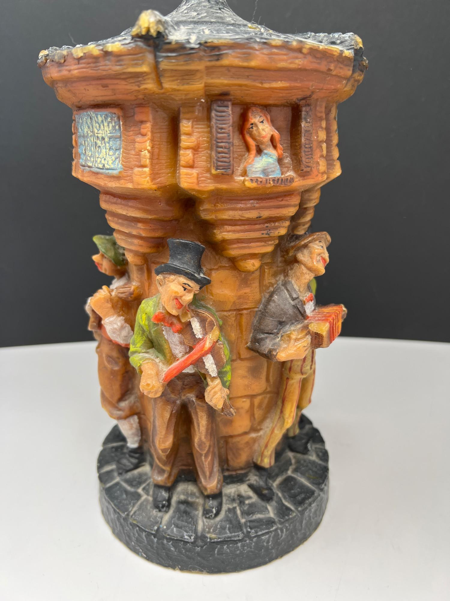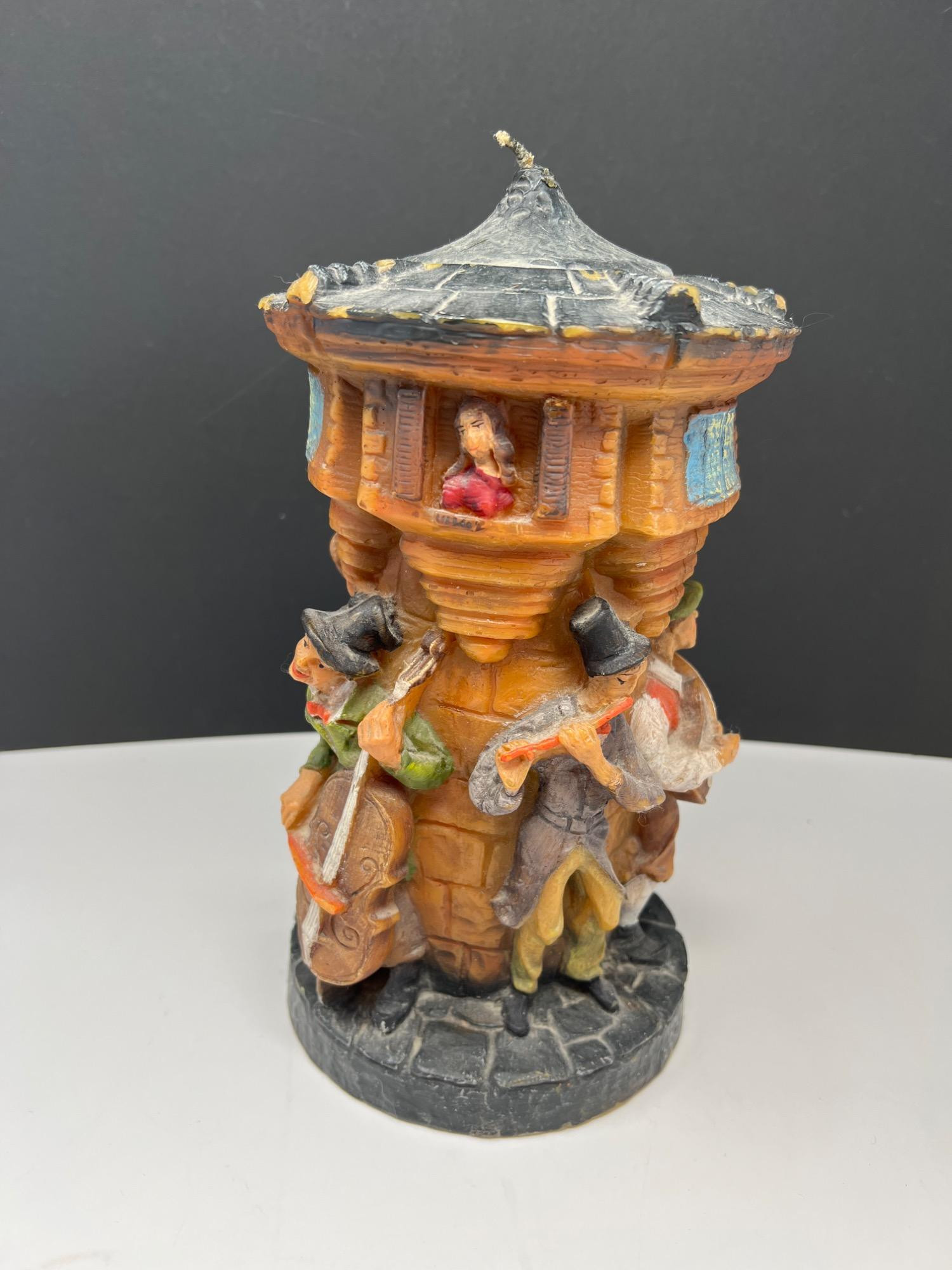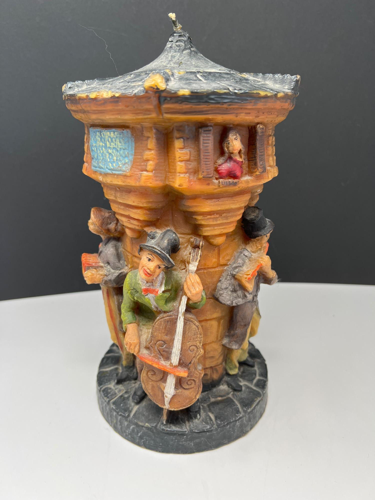 Delightfully intricately carved wax candle by Gunter of Germany. Top of roof removes to insert a tea lite. Depicts street musicians entertaining villagers.
