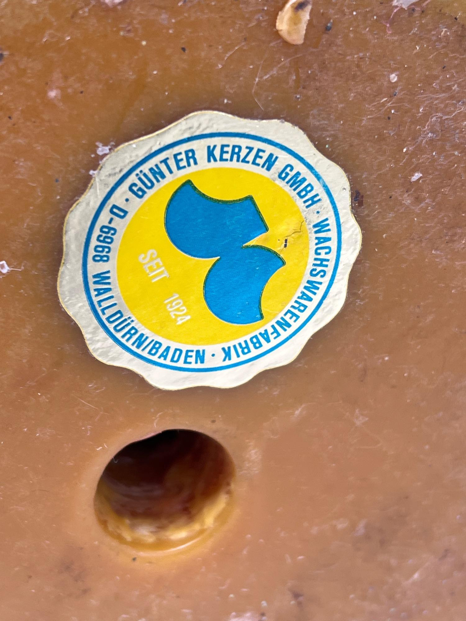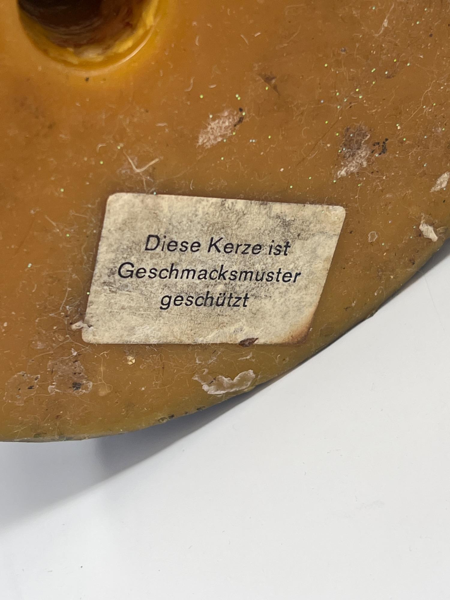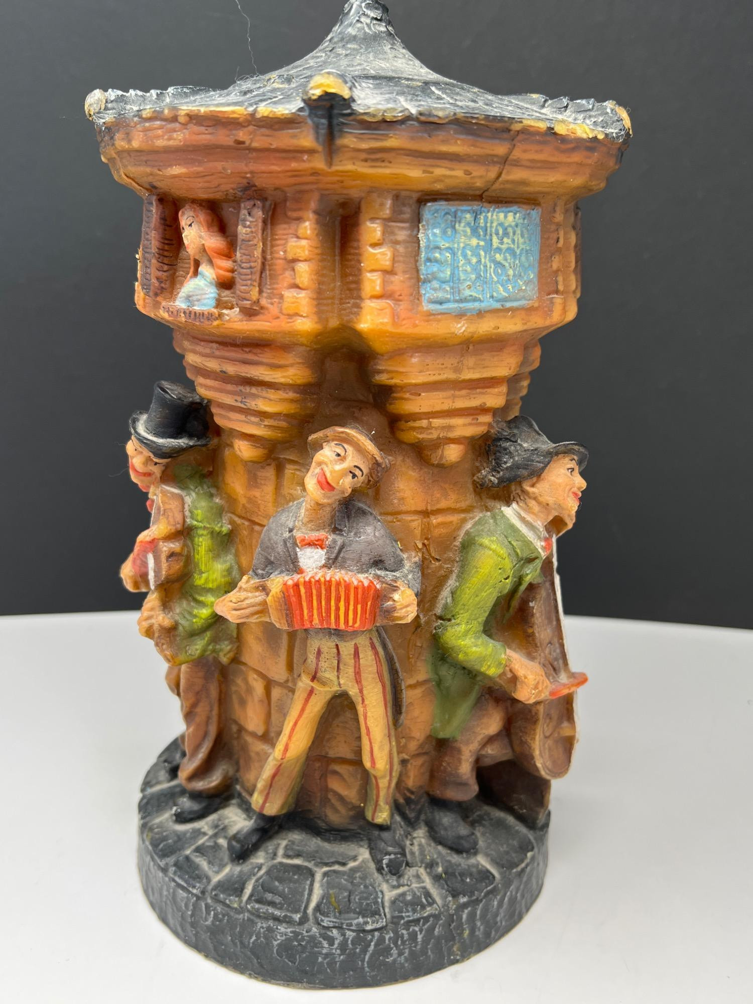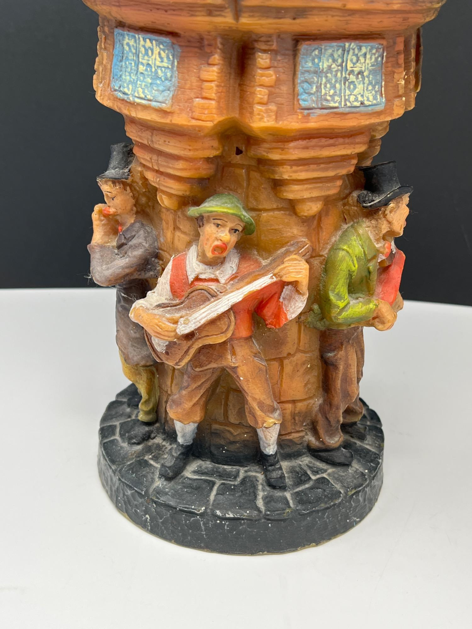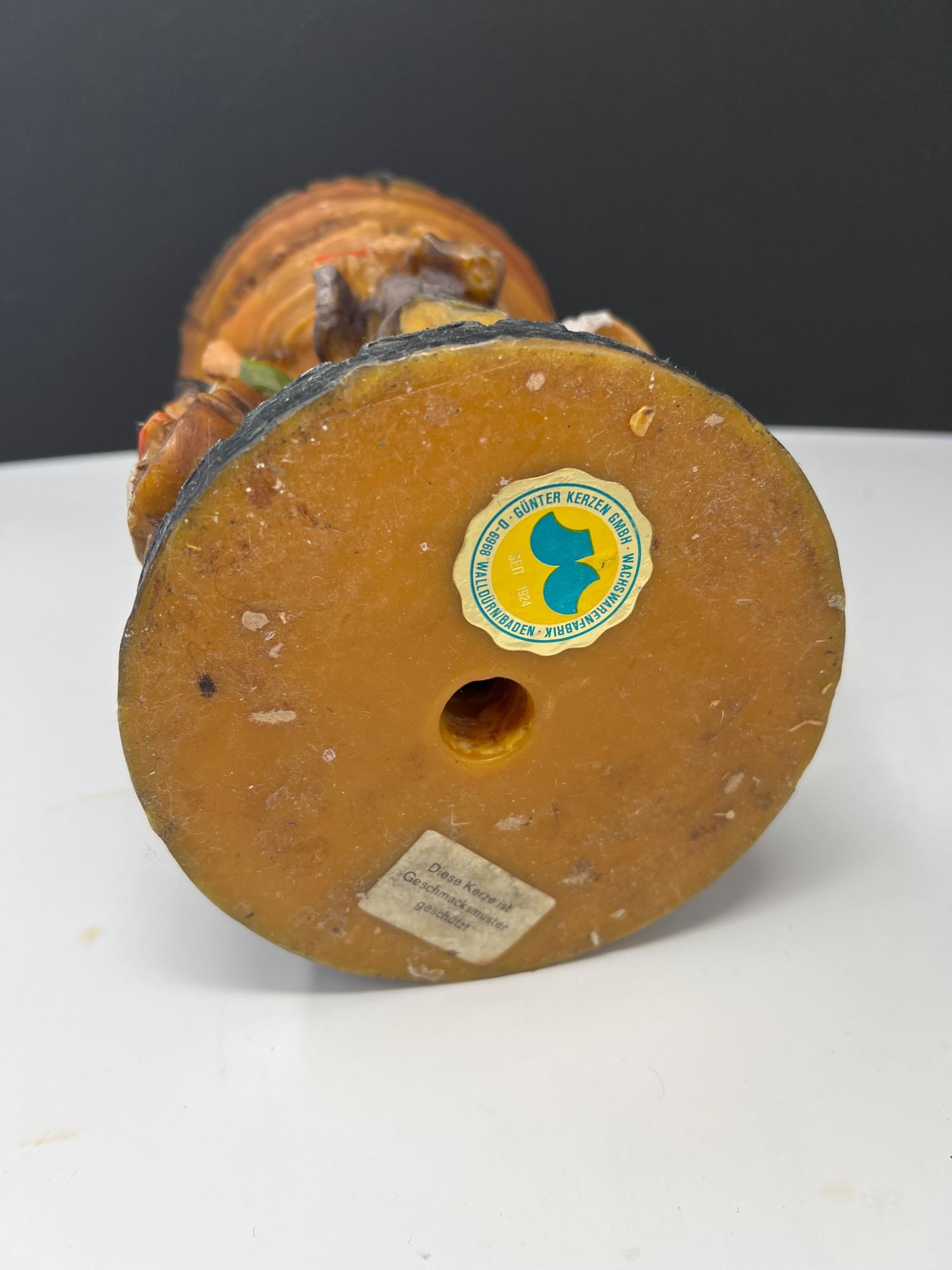 Delightfully intricately carved wax candle by Gunter of Germany. Top of roof removes to insert a tea lite. Depicts street musicians entertaining villagers.