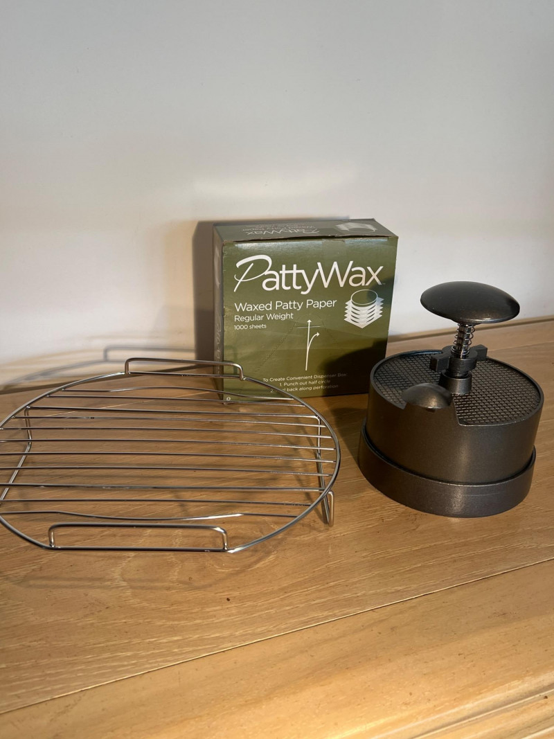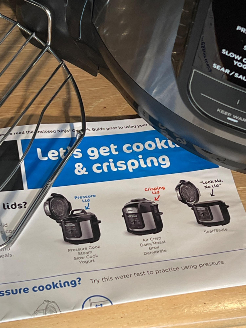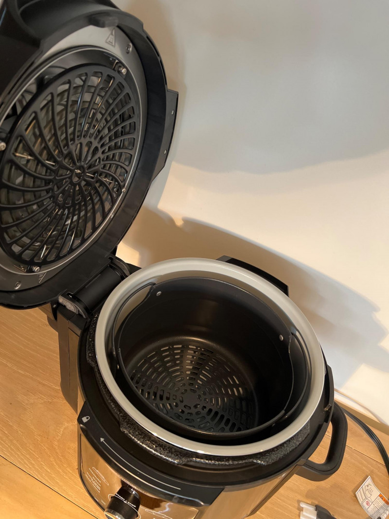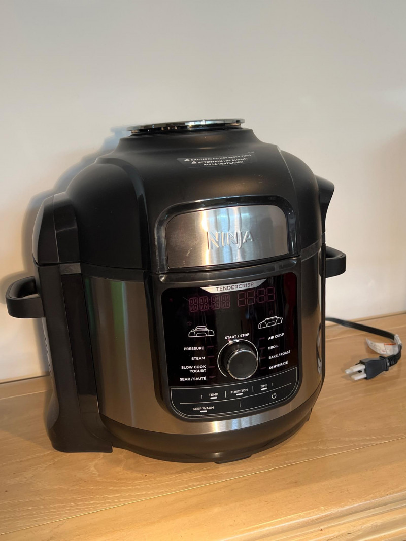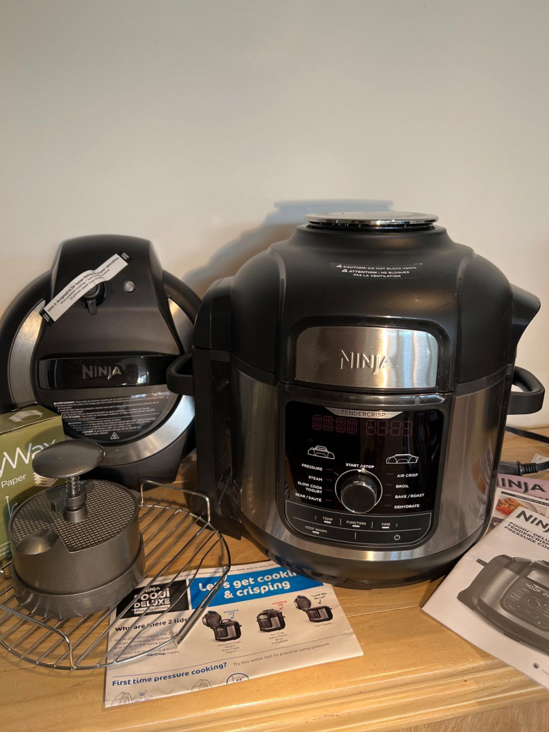 The Ninja FD401 LP3 is an 8-quart deluxe pressure cooker and air fryer, part of the Ninja Foodi series. It offers 12-in-1 versatility, allowing you to pressure cook, air fry, steam, slow cook, sauté, bake, roast, broil, dehydrate, sous vide, and more. Its TenderCrisp Technology lets you quickly pressure cook ingredients to lock in juices, then finish with a crispy, golden air-fryer texture. This model includes an extra-large ceramic-coated pot that is nonstick and easy to clean, along with a 5-quart Cook & Crisp basket for air frying. It also comes with a deluxe reversible rack for steaming and broiling, making it ideal for preparing meals for large families or gatherings. Hardly used or not ever used. Includes patty maker and box of patty wax. Cooking lid and crisping lid.