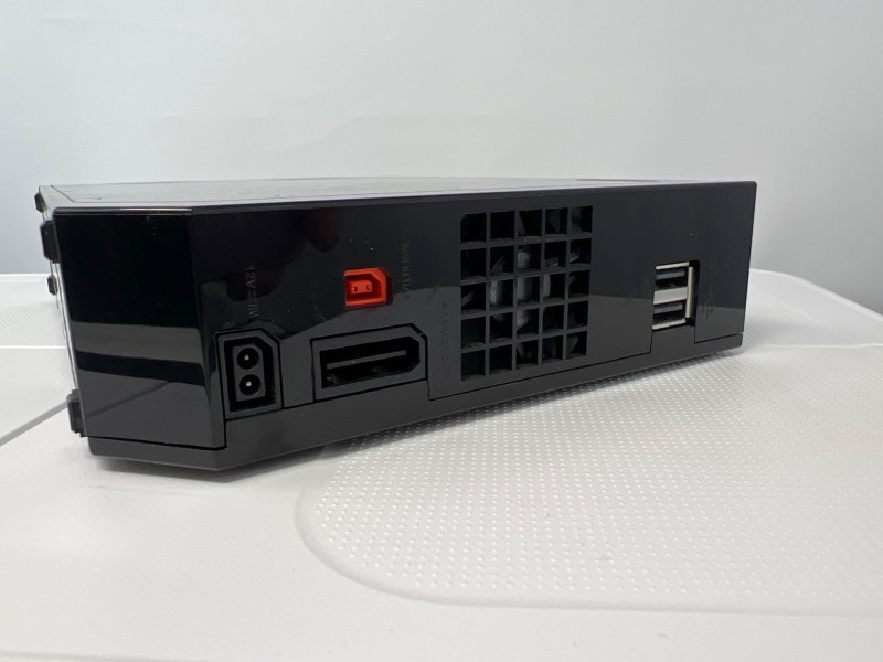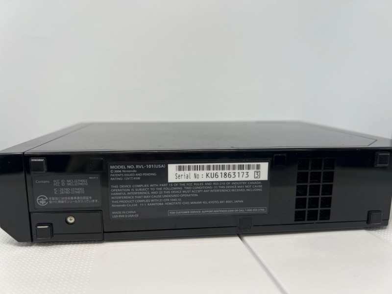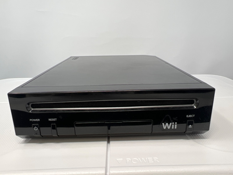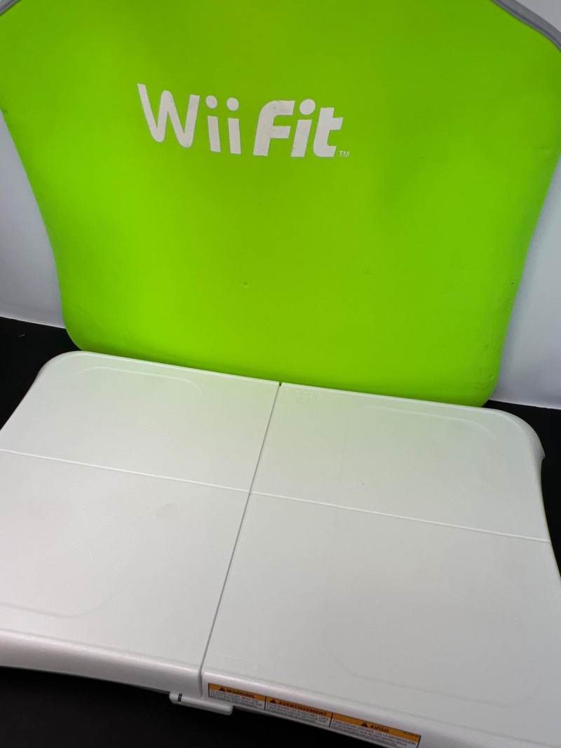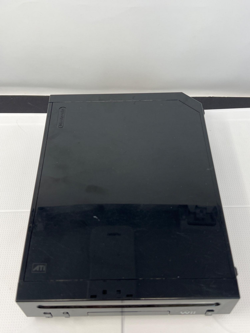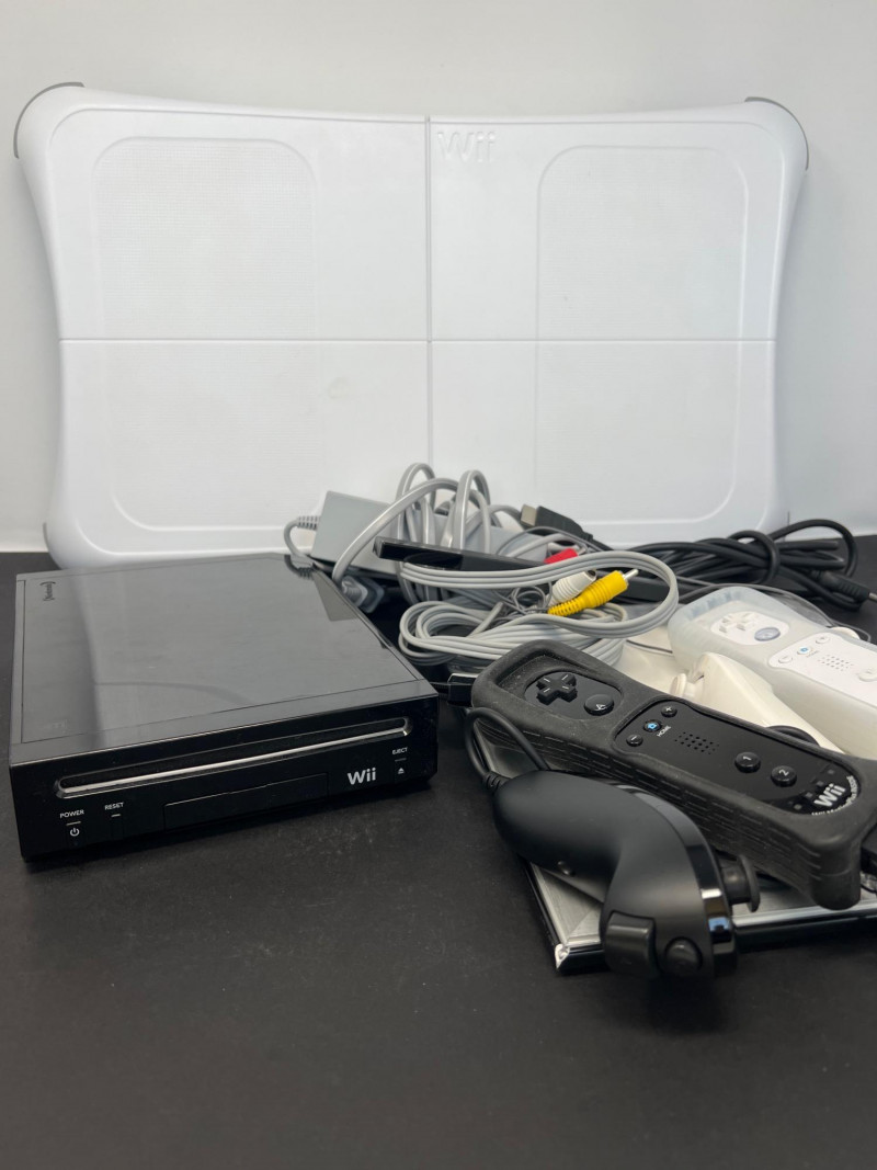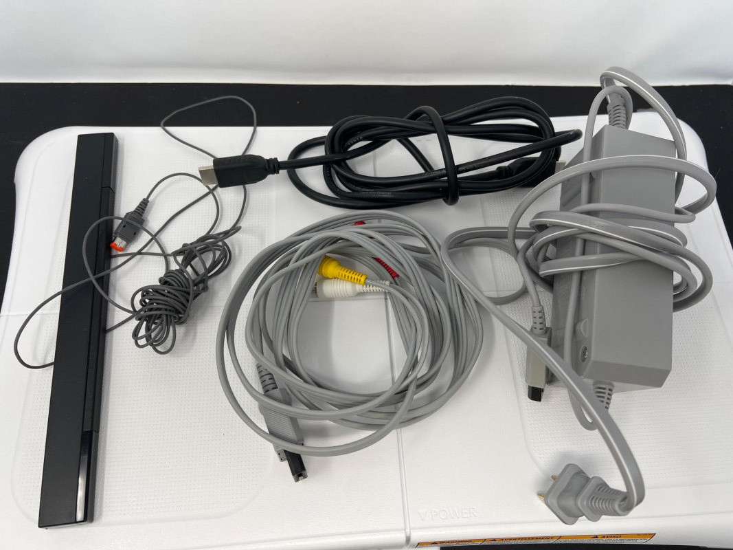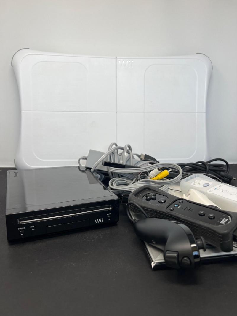 Nintendo WII black console RVL-101 and WII Fit floor balance board. Includes power cord, console to tv cable, HDMI cord, sensor bar, and two controllers (one black and one white). Brochures and one game (not pictured). System is untested.