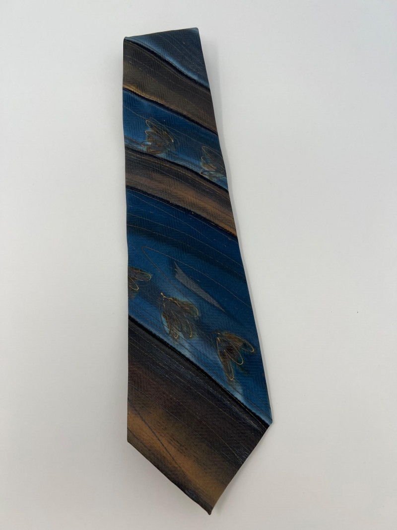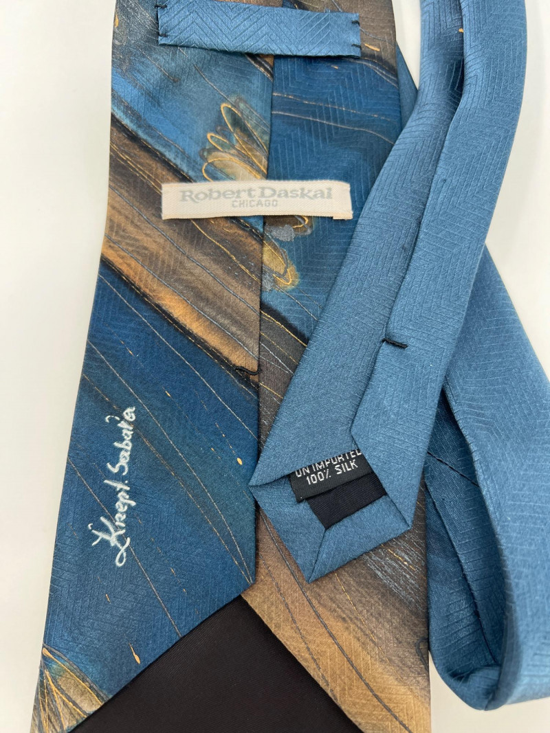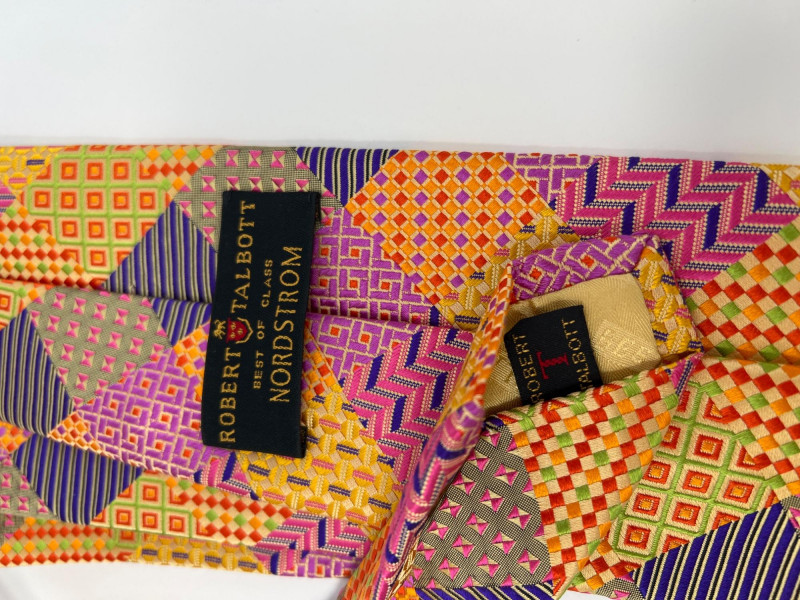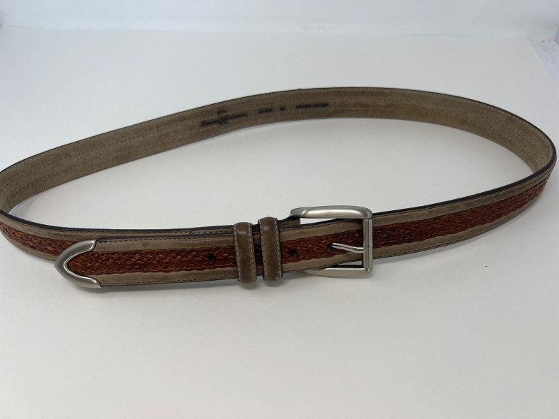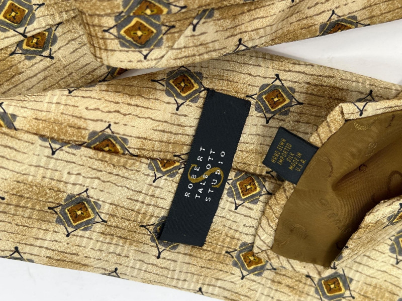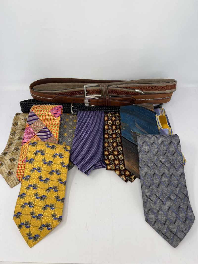 Nine finely fashioned vintage neckties with most of them 100% silk. Robert Talbot and Robert Talbot Studios, Nordstrom; Joseph Abboud; J Garcia Wetlands 1; Canali; Zegna; Robert Daskal signed. Belts - Crookhorn - handmade leather in USA (36); Brown Leather (unknown brand) (38); and Tommy Bahama (40).