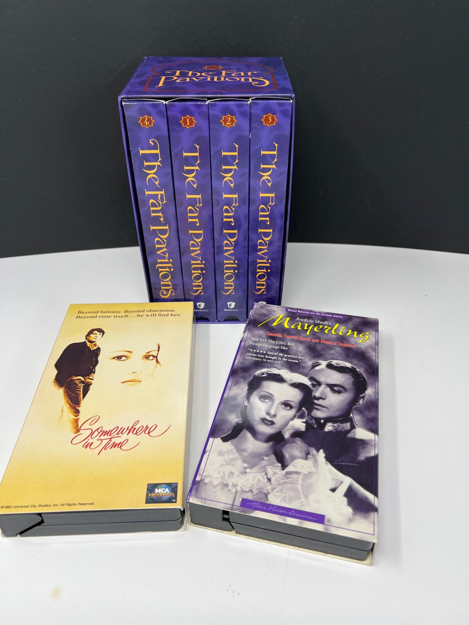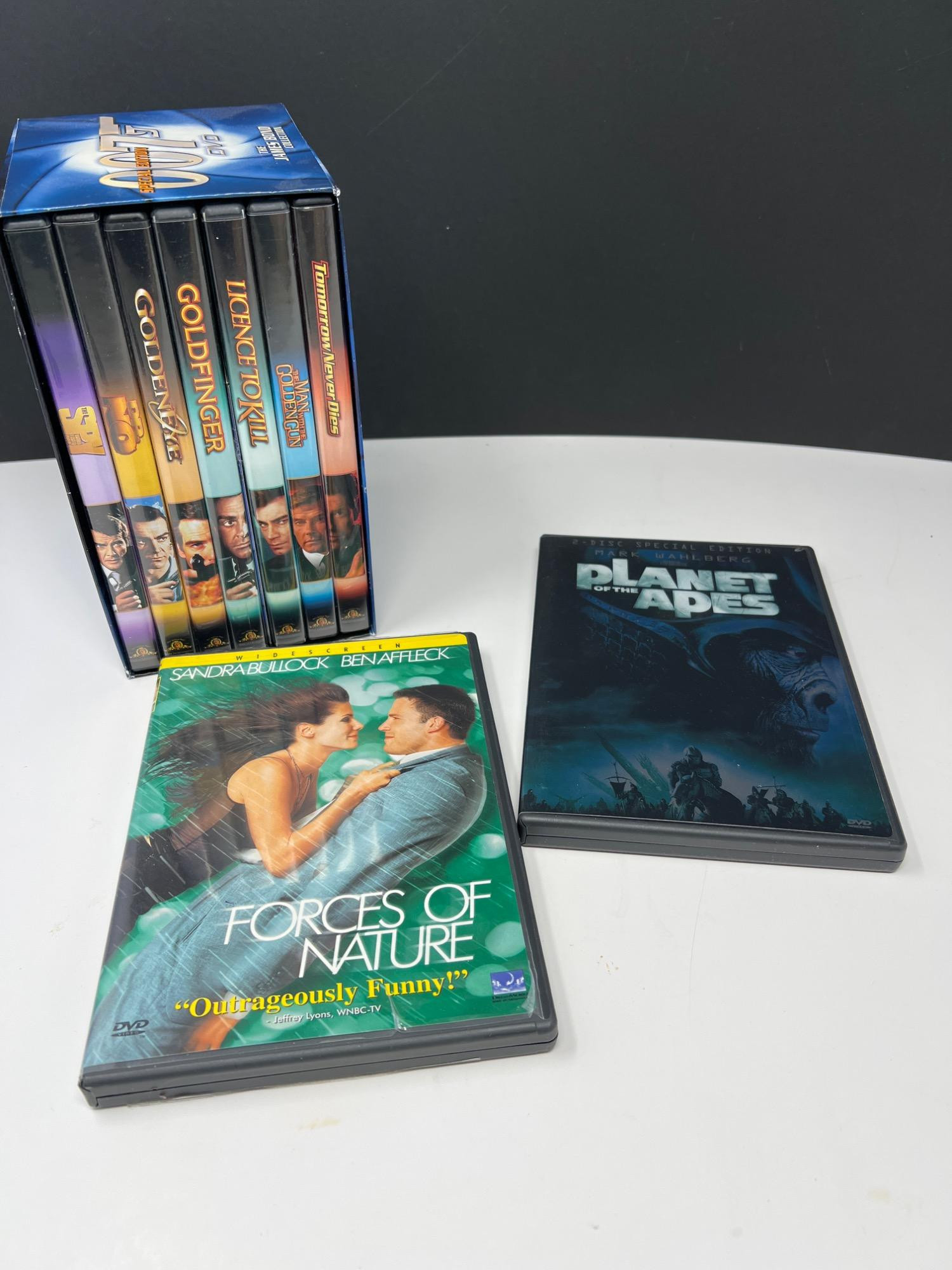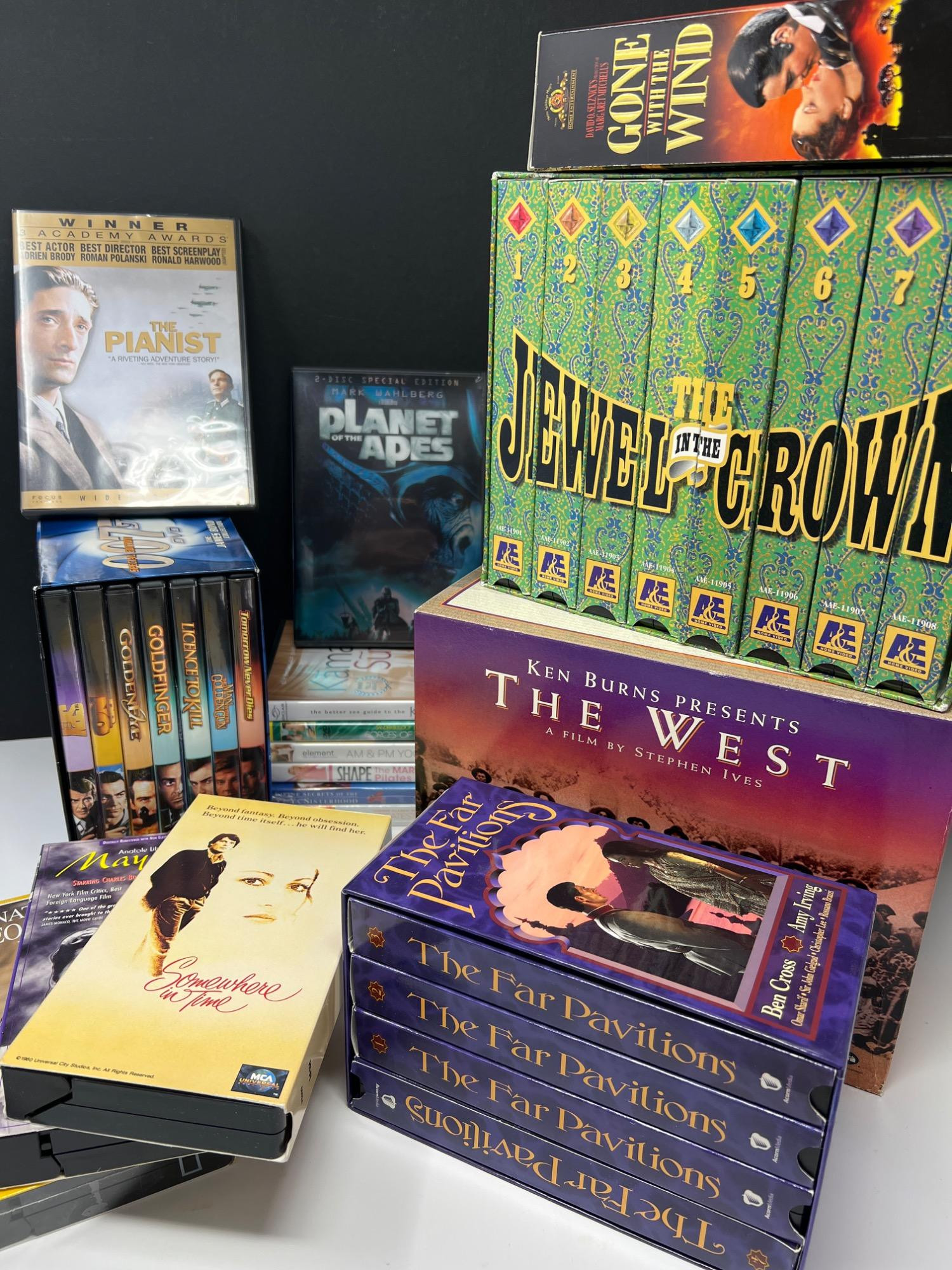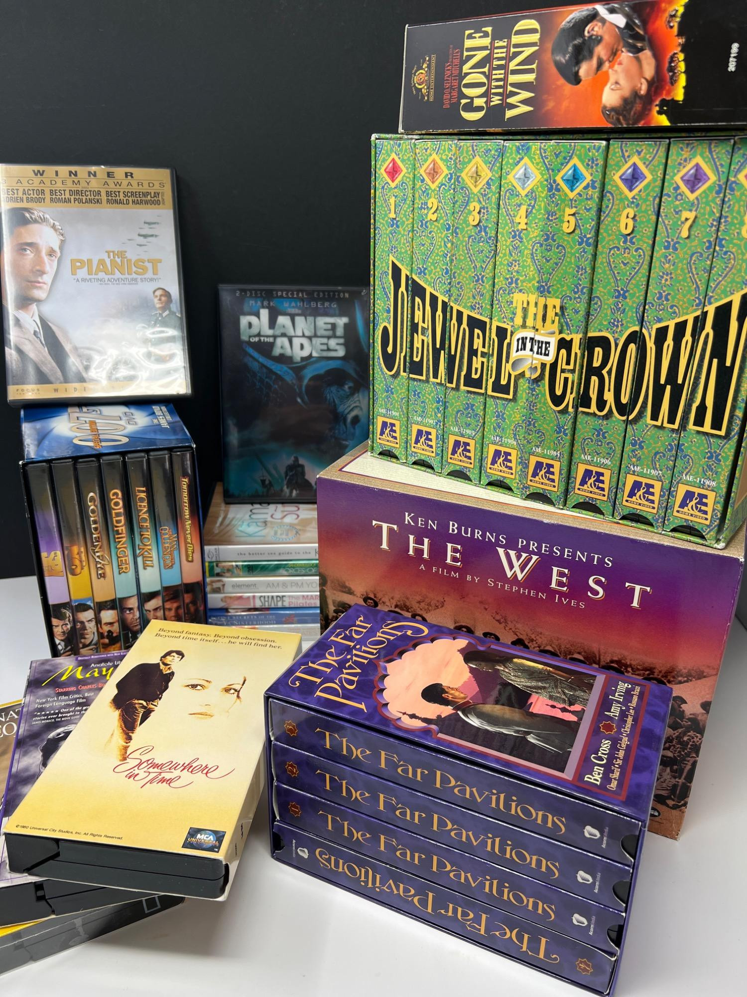 Variety of DVDs that include James Bond 007 series set, Planet of the Apes, The Pianist, and more. VHS sets that include Jewel Crown, The West, The Far Pavilions, Gone with the Wind and others.