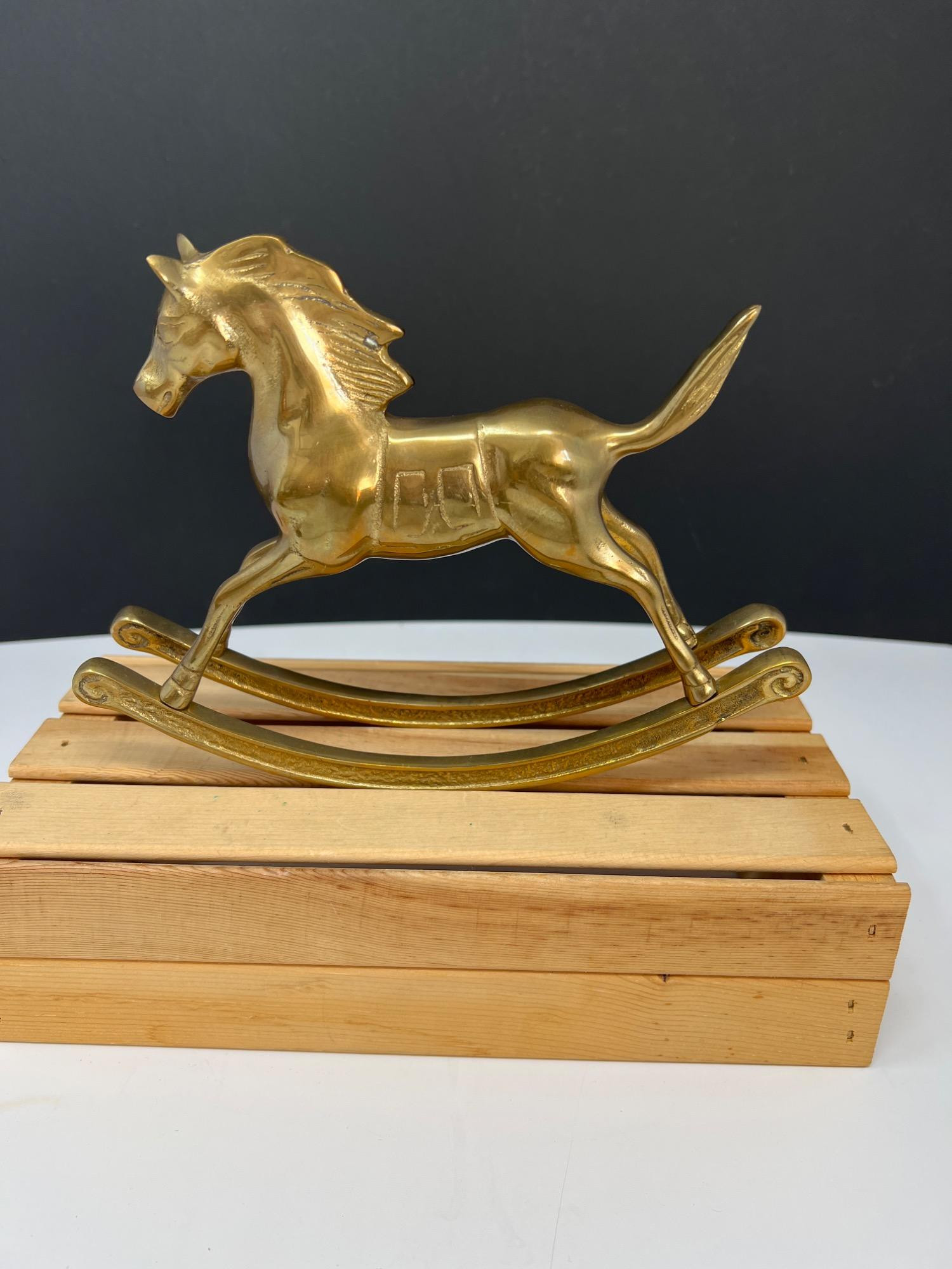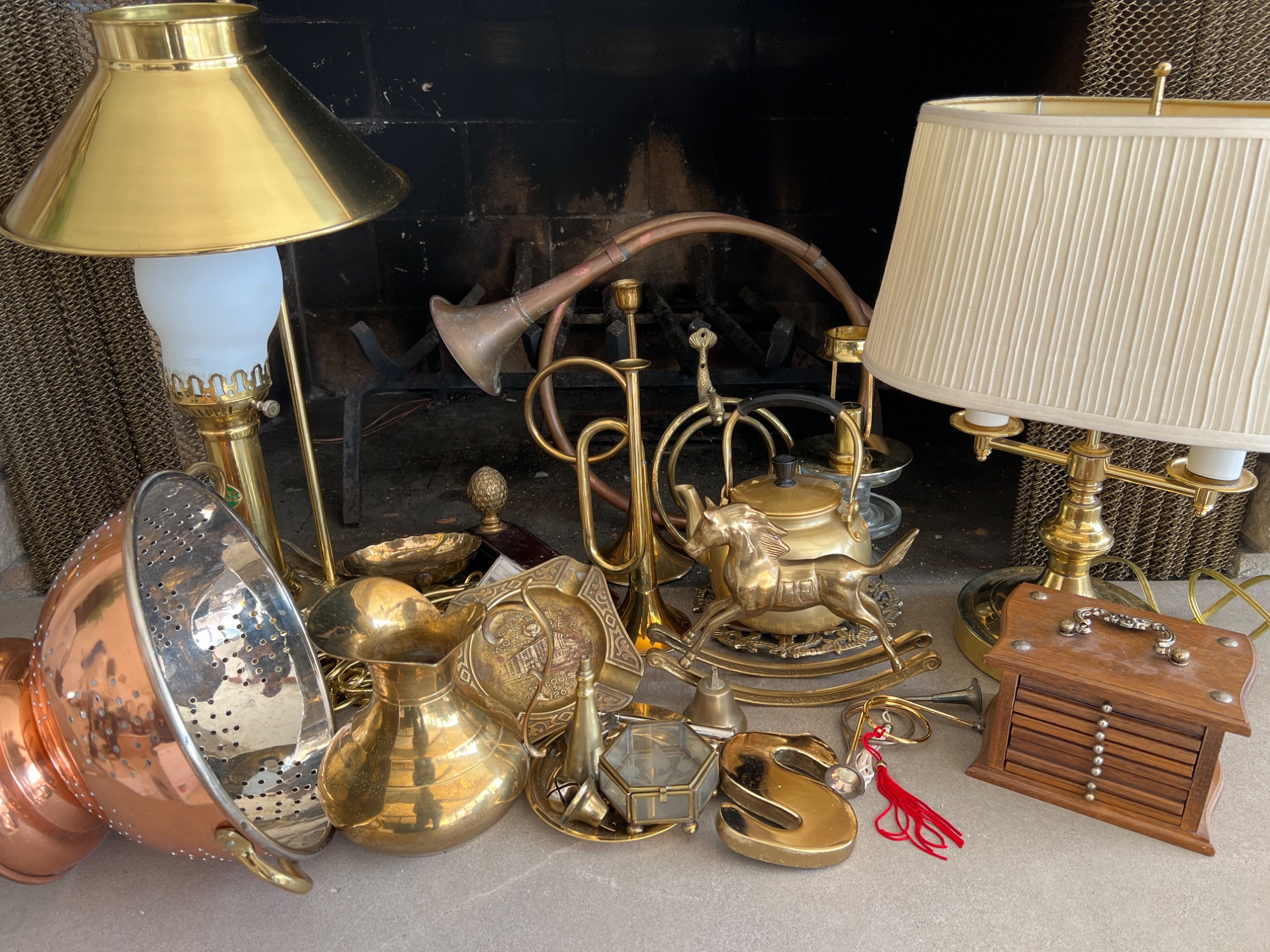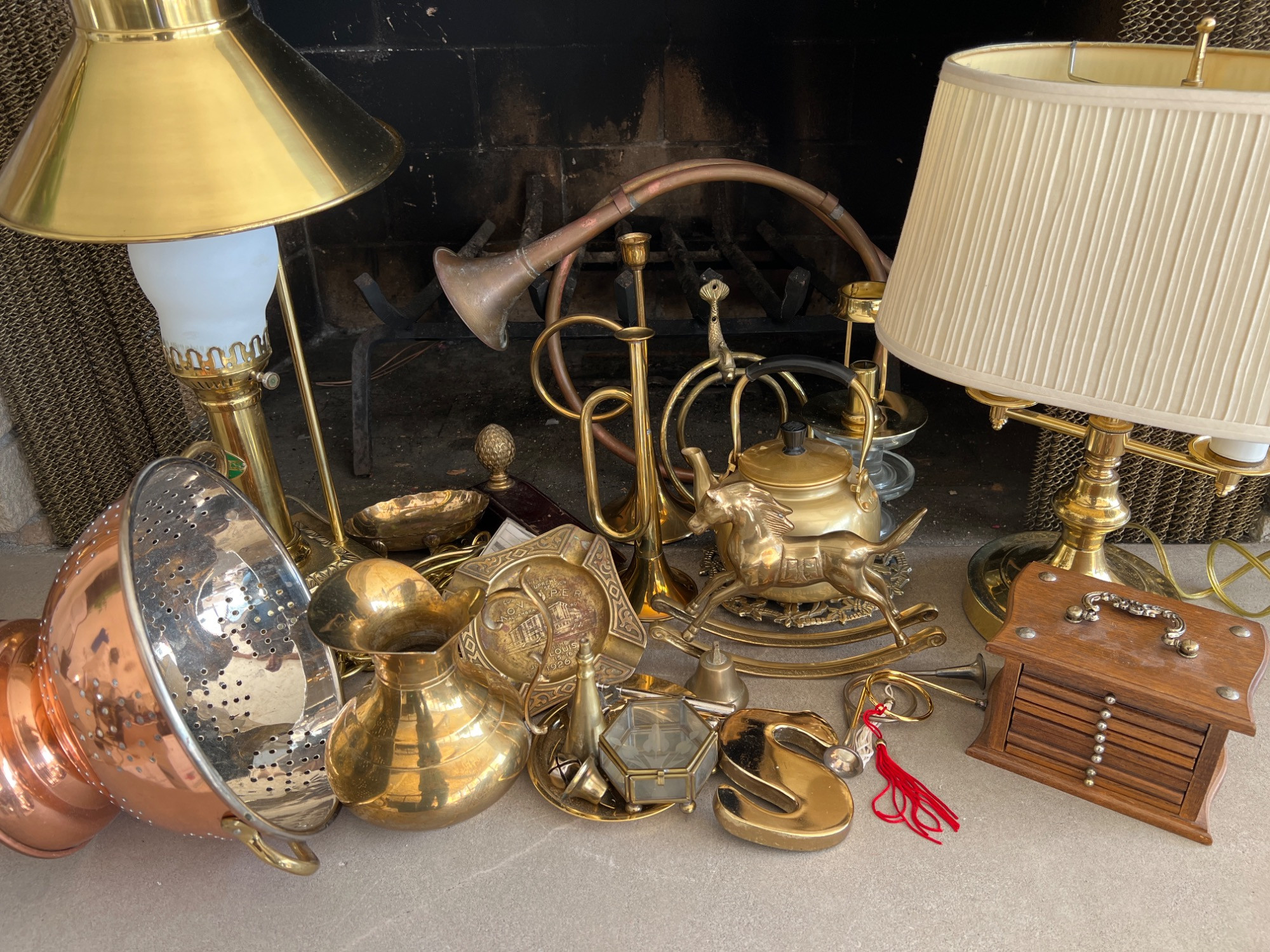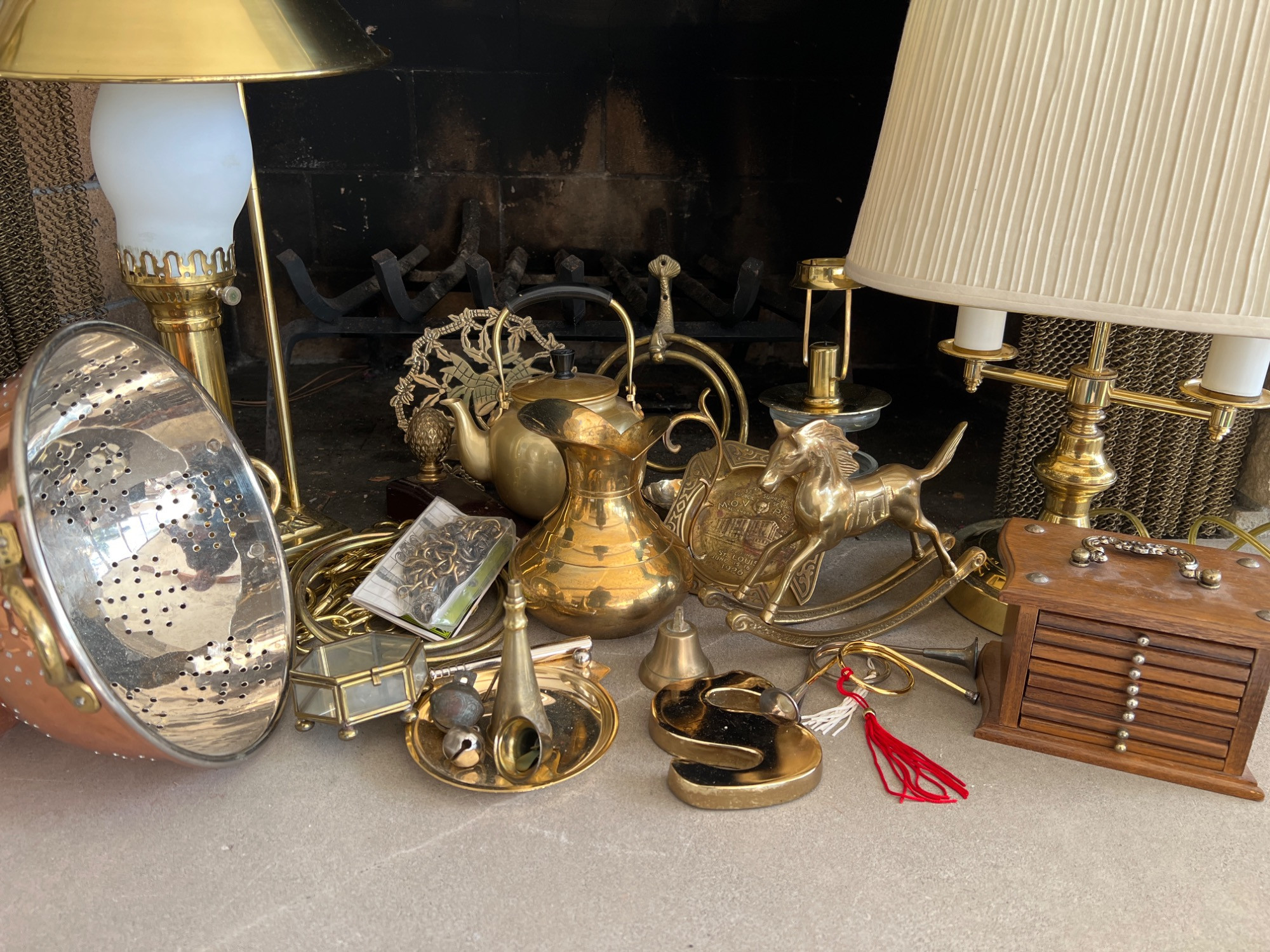 Variety of brass decorations including a vintage rocking horse, decor bugle (made in India), trivet, towel holder, pitcher, chains for hanging light fixtures, two vintage brass lamps, and copper/brass collander - and much more.