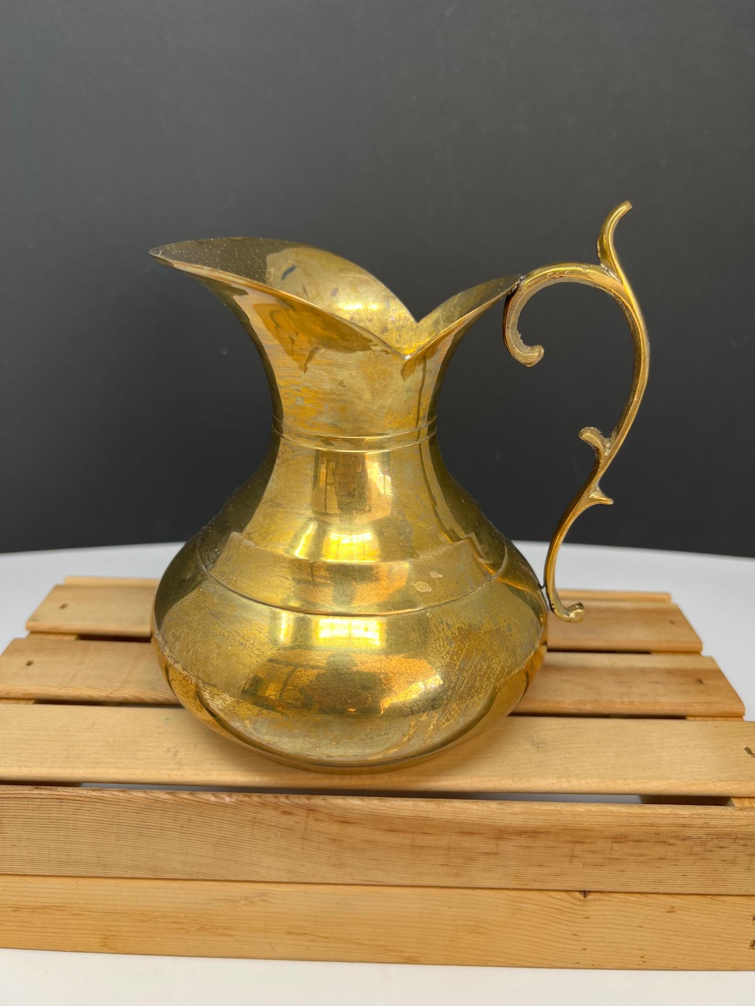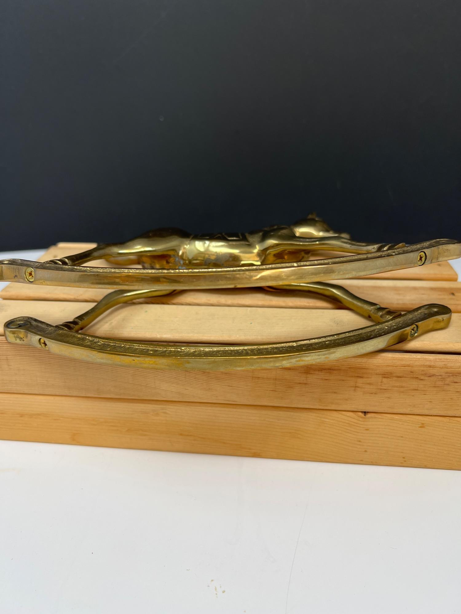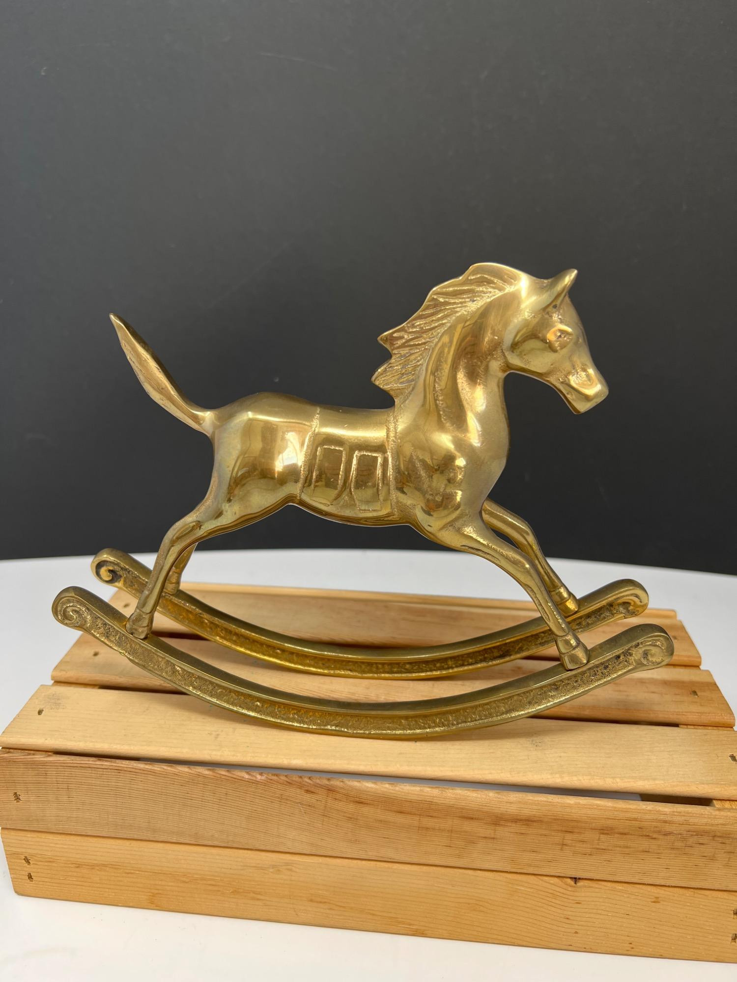 Variety of brass decorations including a vintage rocking horse, decor bugle (made in India), trivet, towel holder, pitcher, chains for hanging light fixtures, two vintage brass lamps, and copper/brass collander - and much more.
