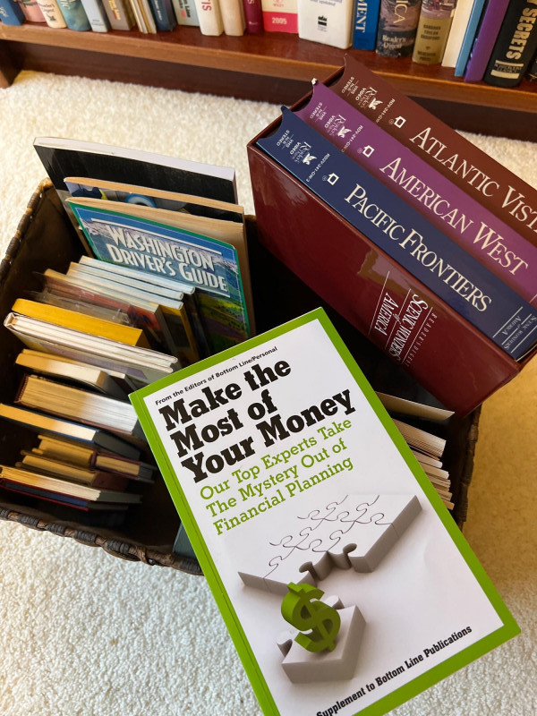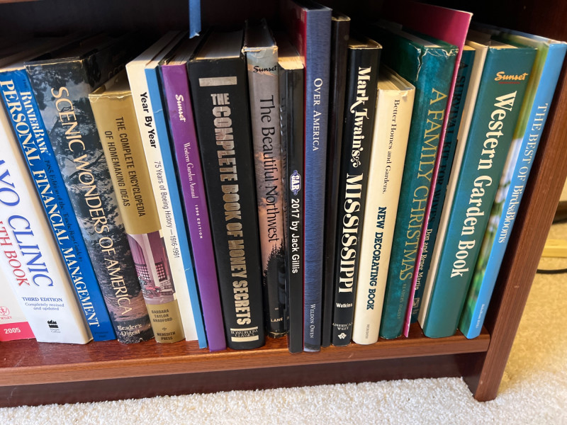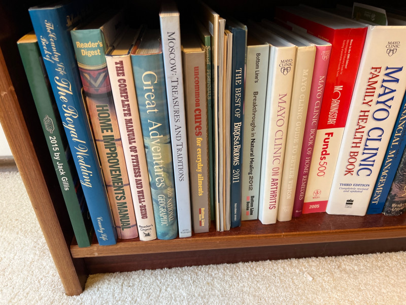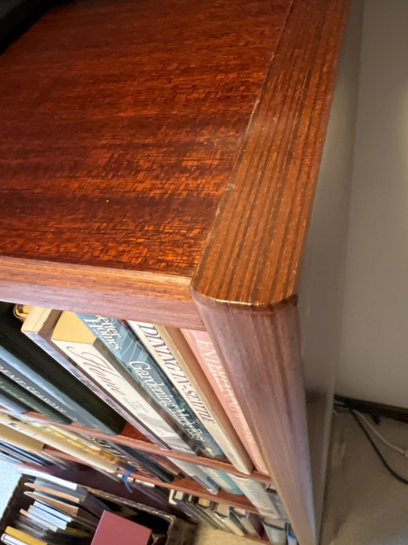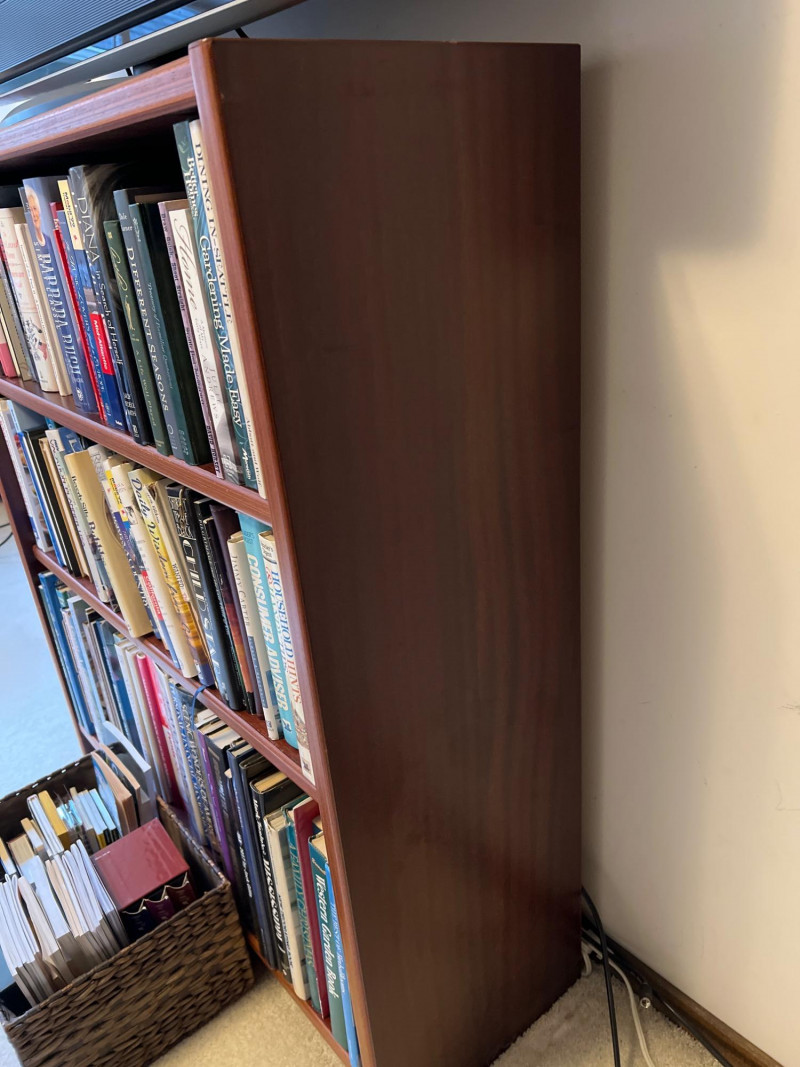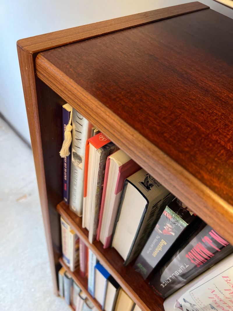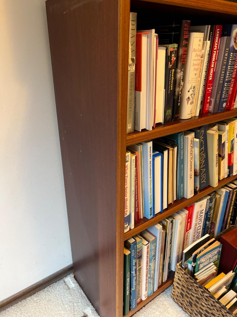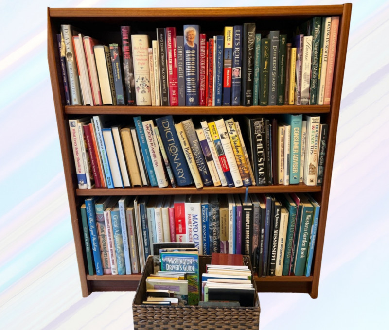 Excellently finished wood bookcase with three shelves filled with various books. See pictures for titles.