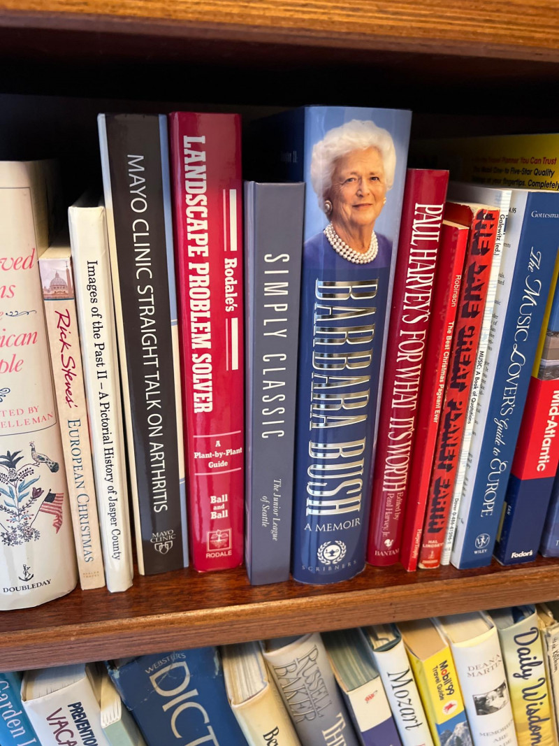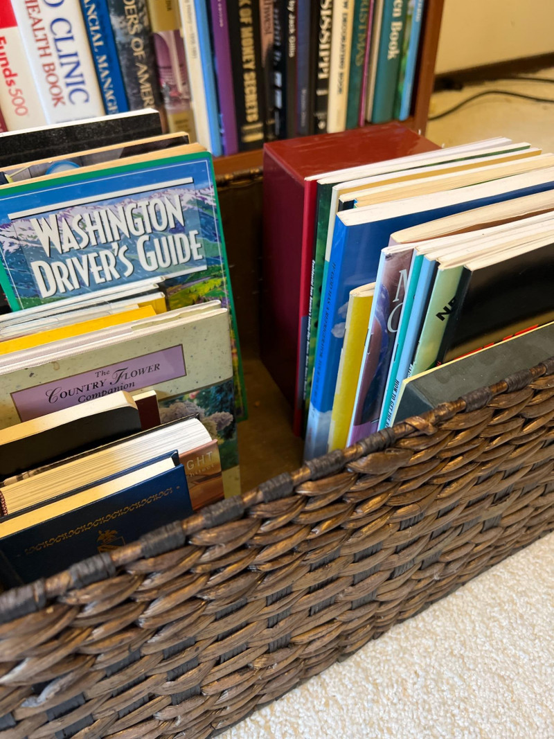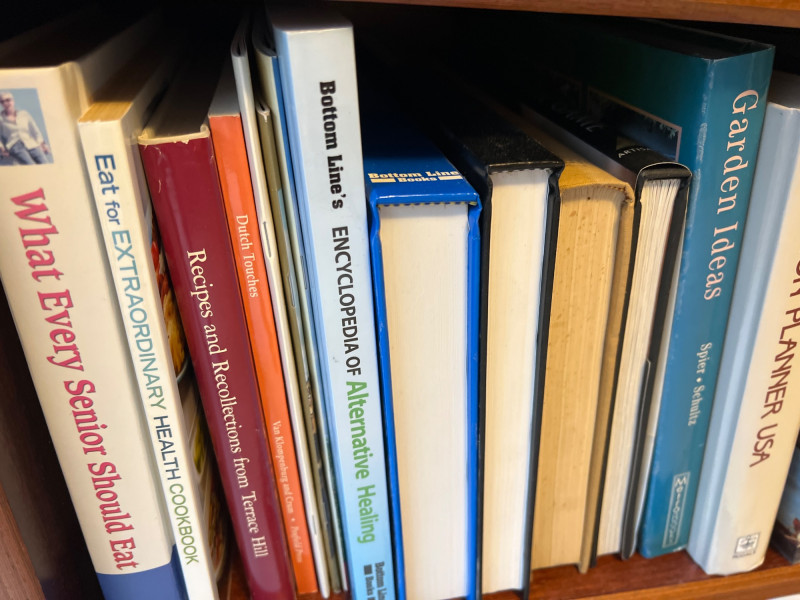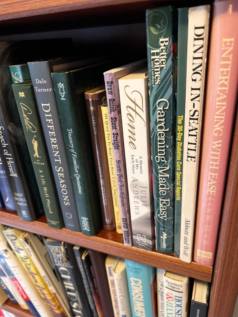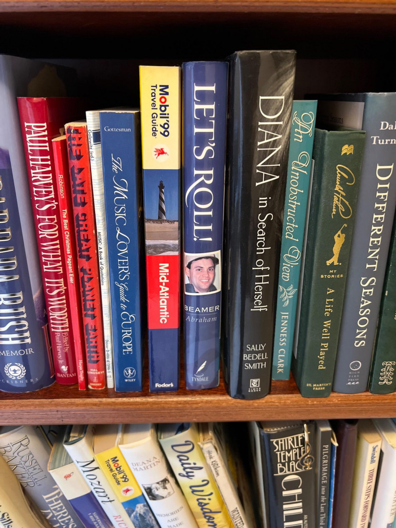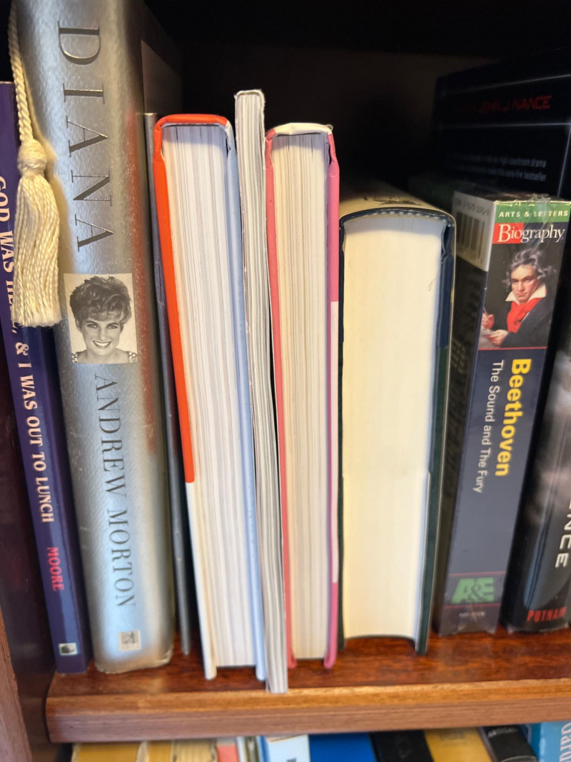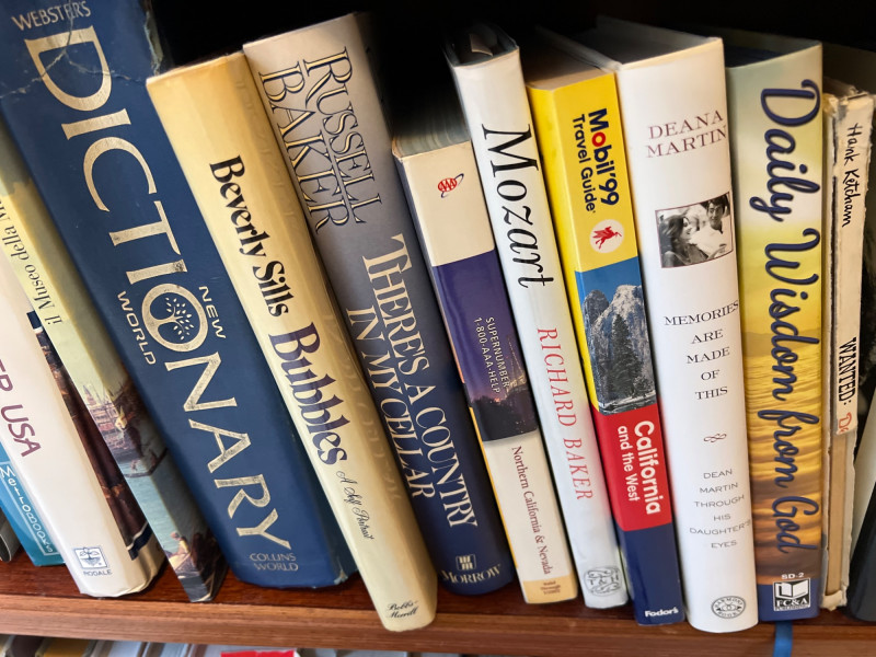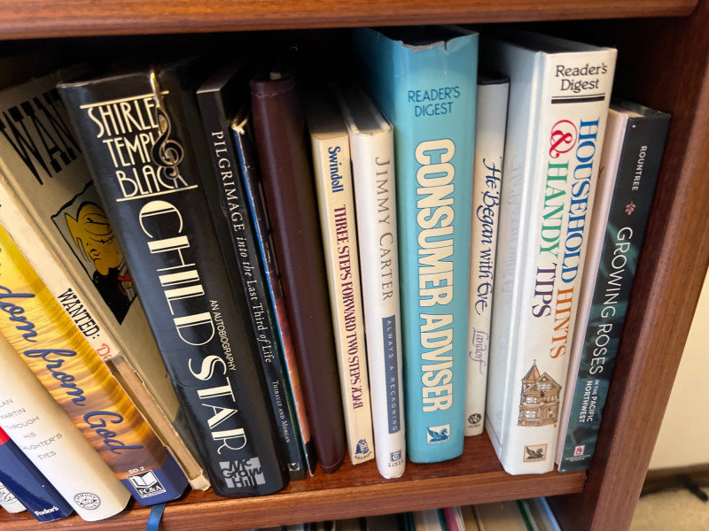 Excellently finished wood bookcase with three shelves filled with various books. See pictures for titles.