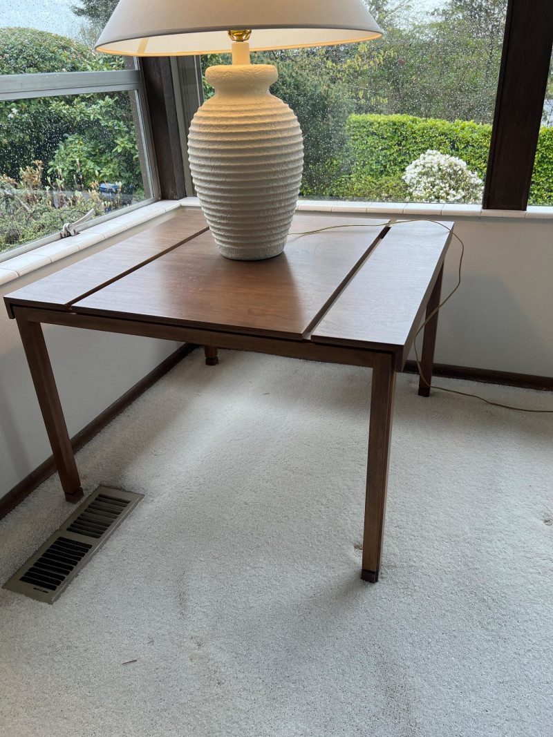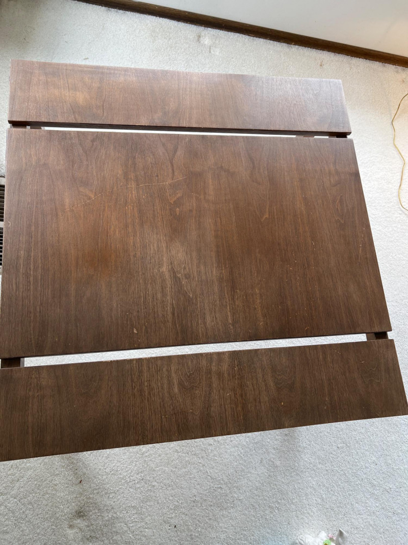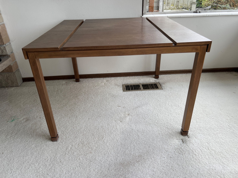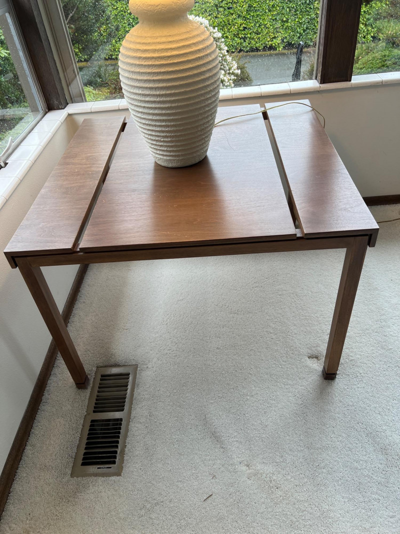 Wood table with straight legs and slatted designed top. Some scratches on table top (see picture). Located on second floor. 8 steps to entryway, and 6 cement steps to ground level.