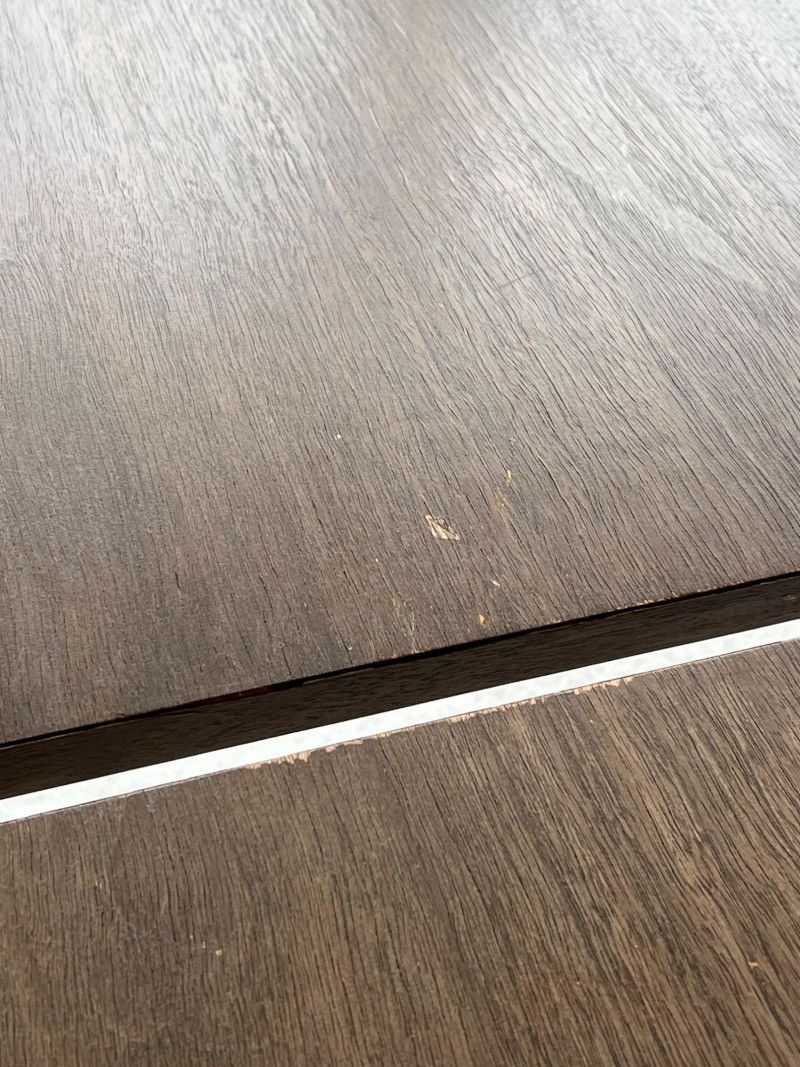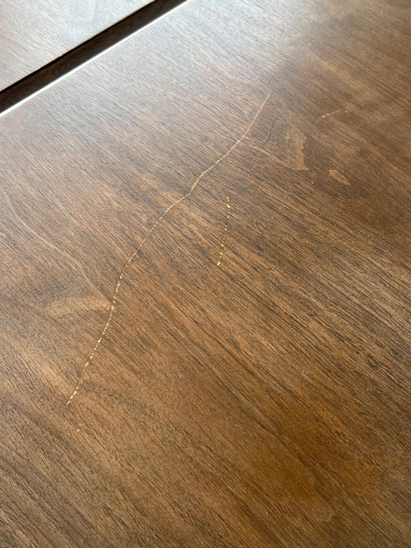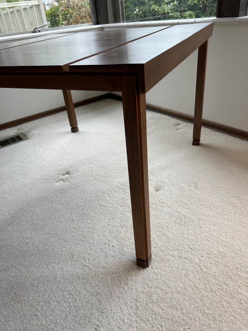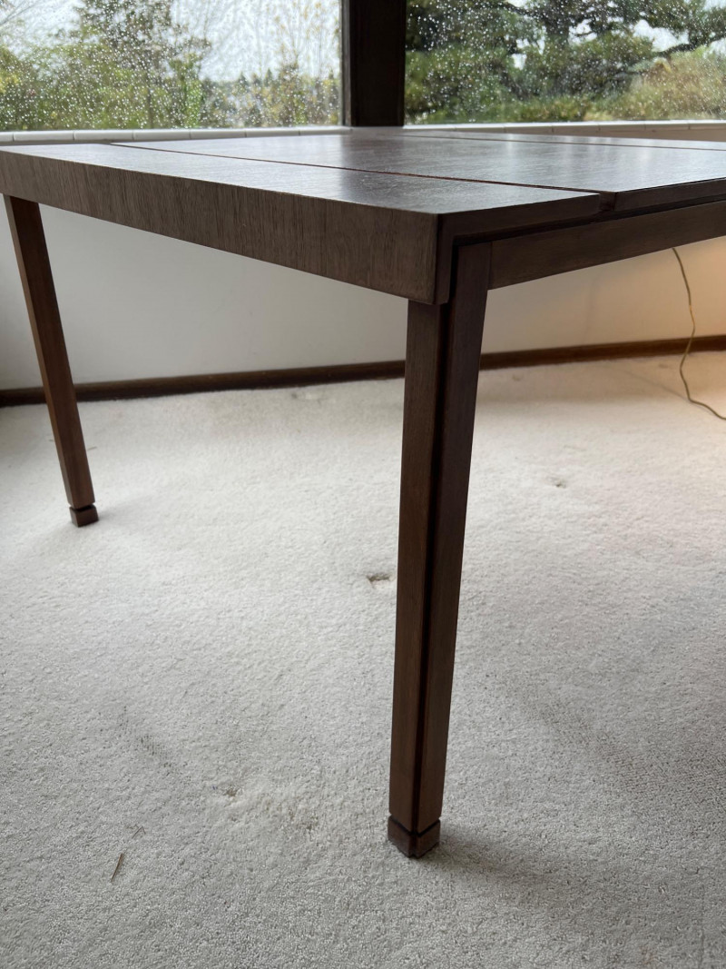 Wood table with straight legs and slatted designed top. Some scratches on table top (see picture). Located on second floor. 8 steps to entryway, and 6 cement steps to ground level.