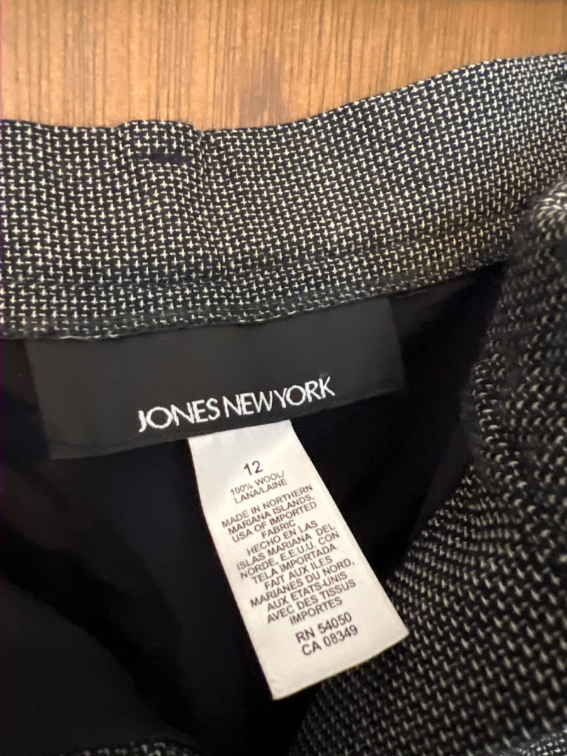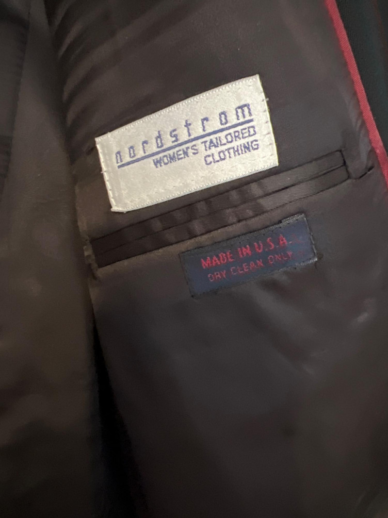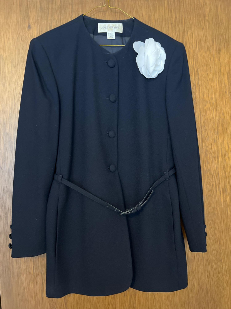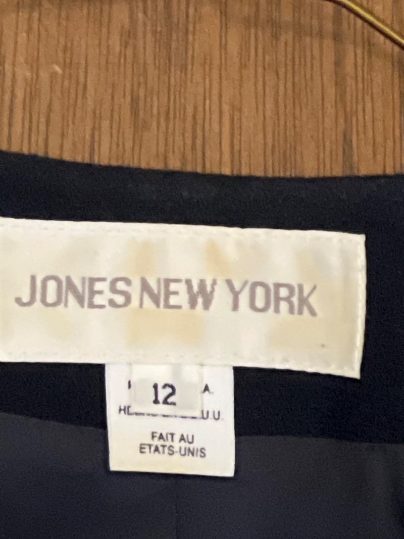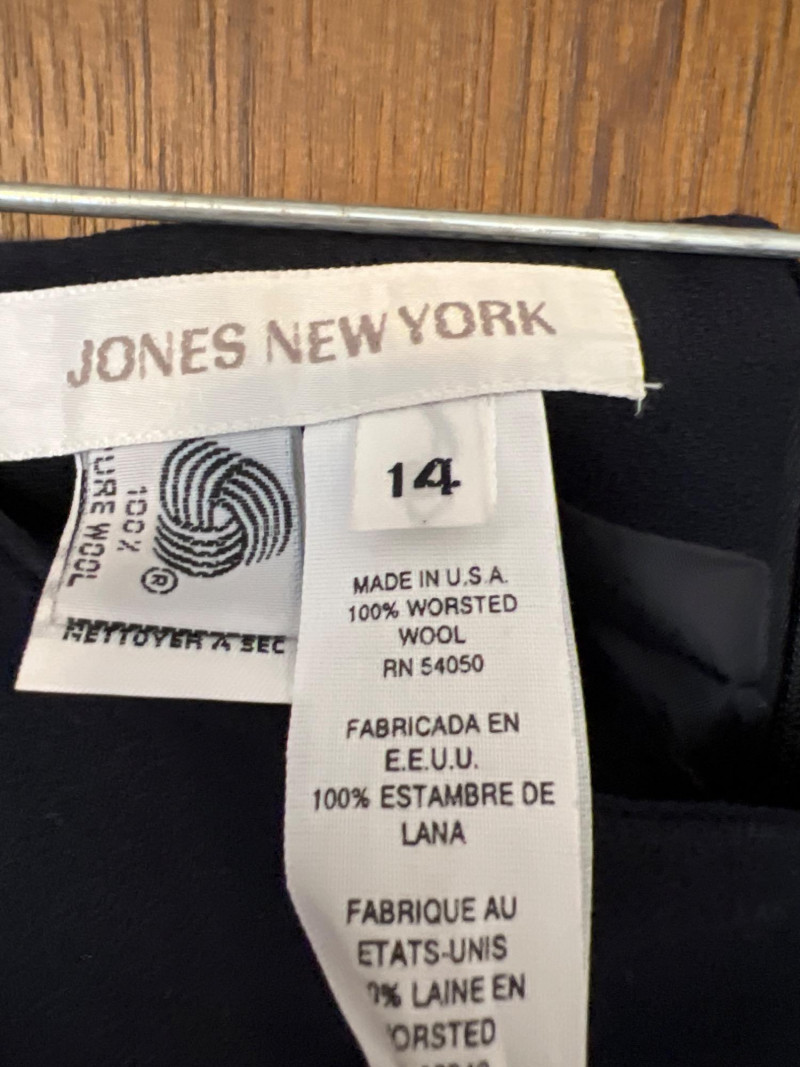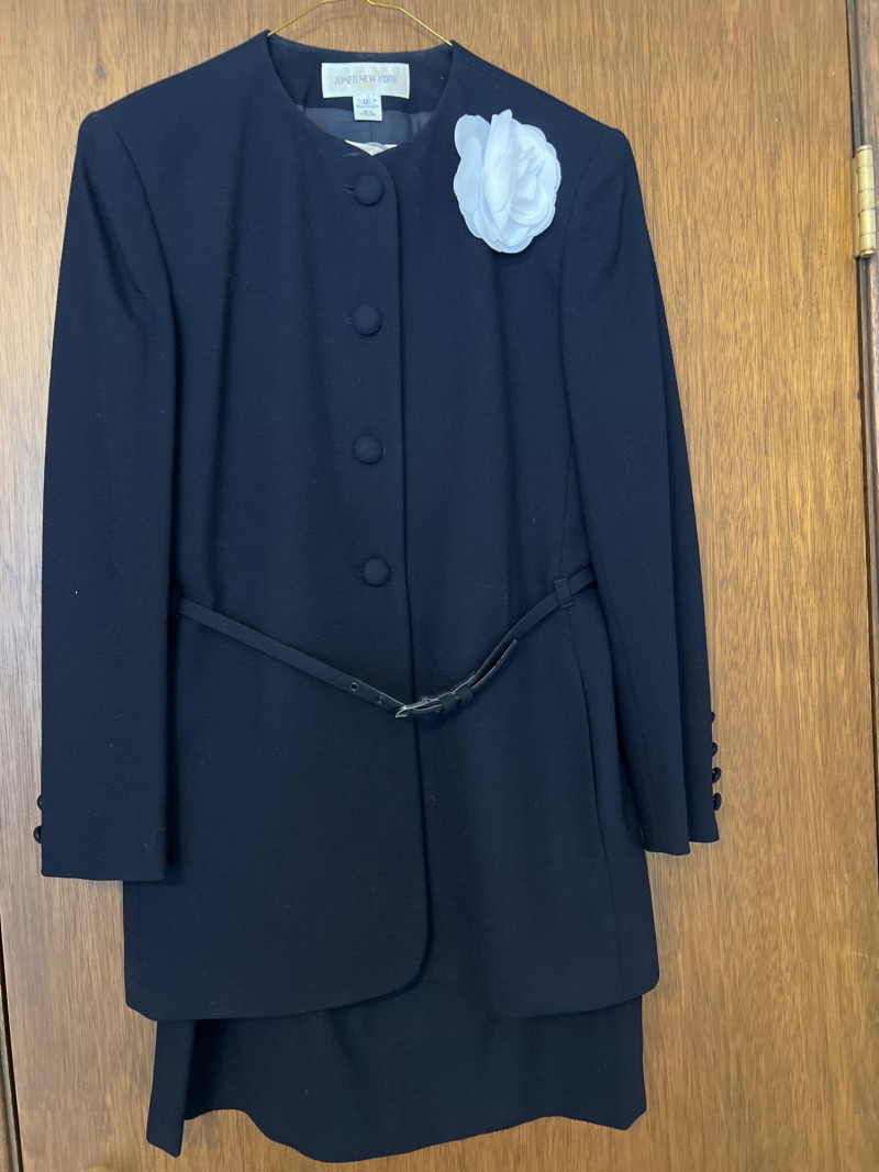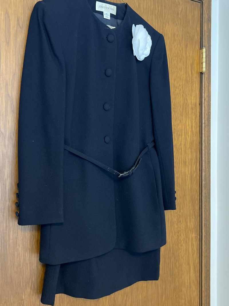 All jacket and skirt suit style sets are fully lined. Top quality made by Jones of New York, Nordstrom customs, and Kasper. Note: Jones of New York deep navy long suit style jacket and matching skirt. Skirt is 24 inches long and is a Size 14. Jacket is 29 inches long and is a sign 12. Tweed set is 100% wool, fully lined. Nordstrom custom designs suit set is Made in U.S.A.