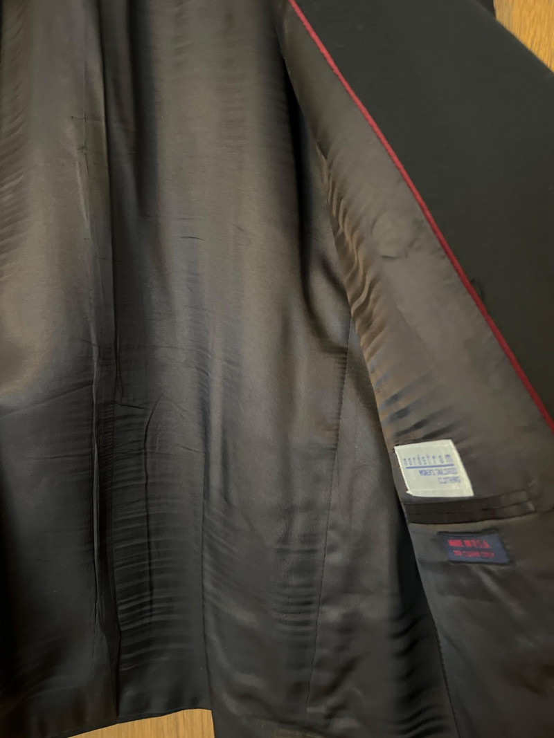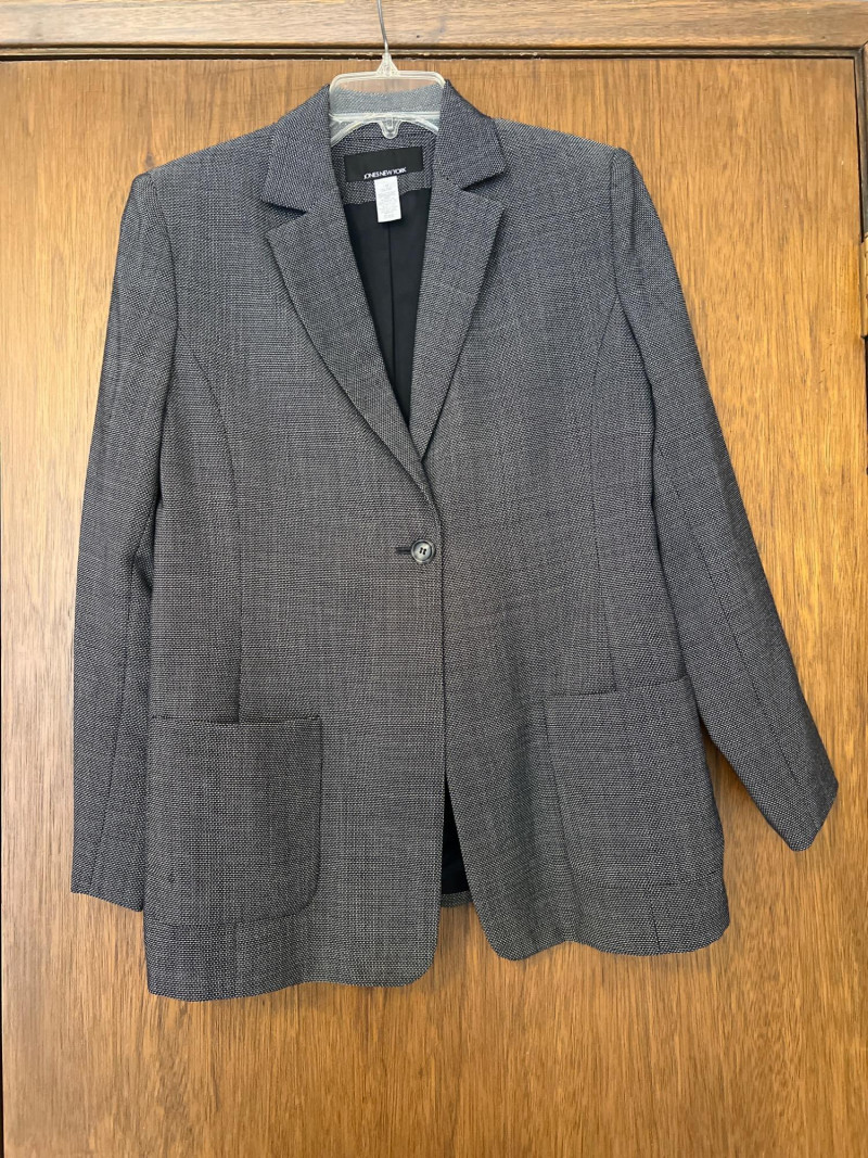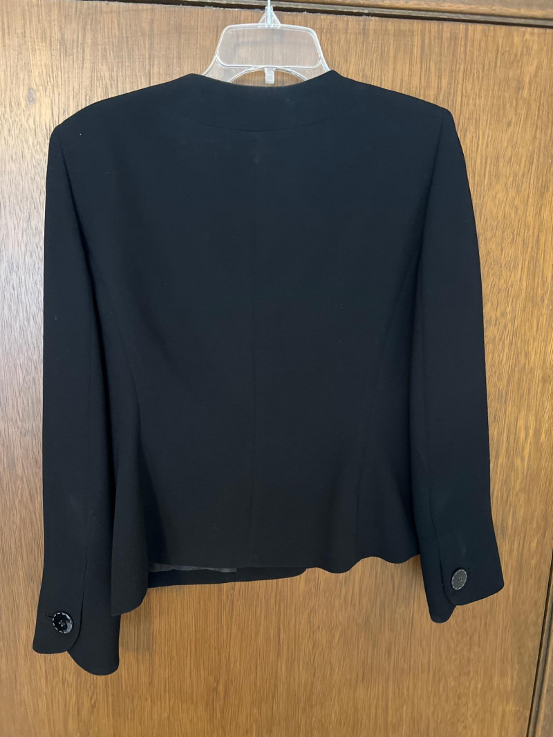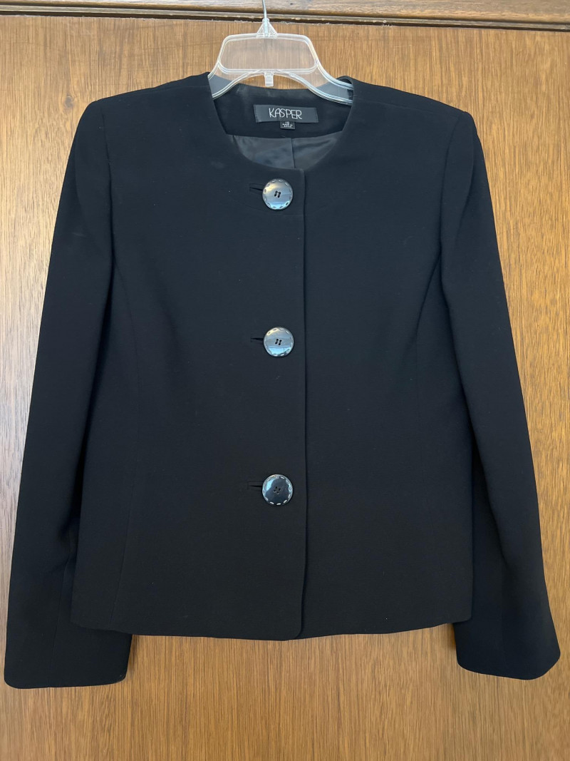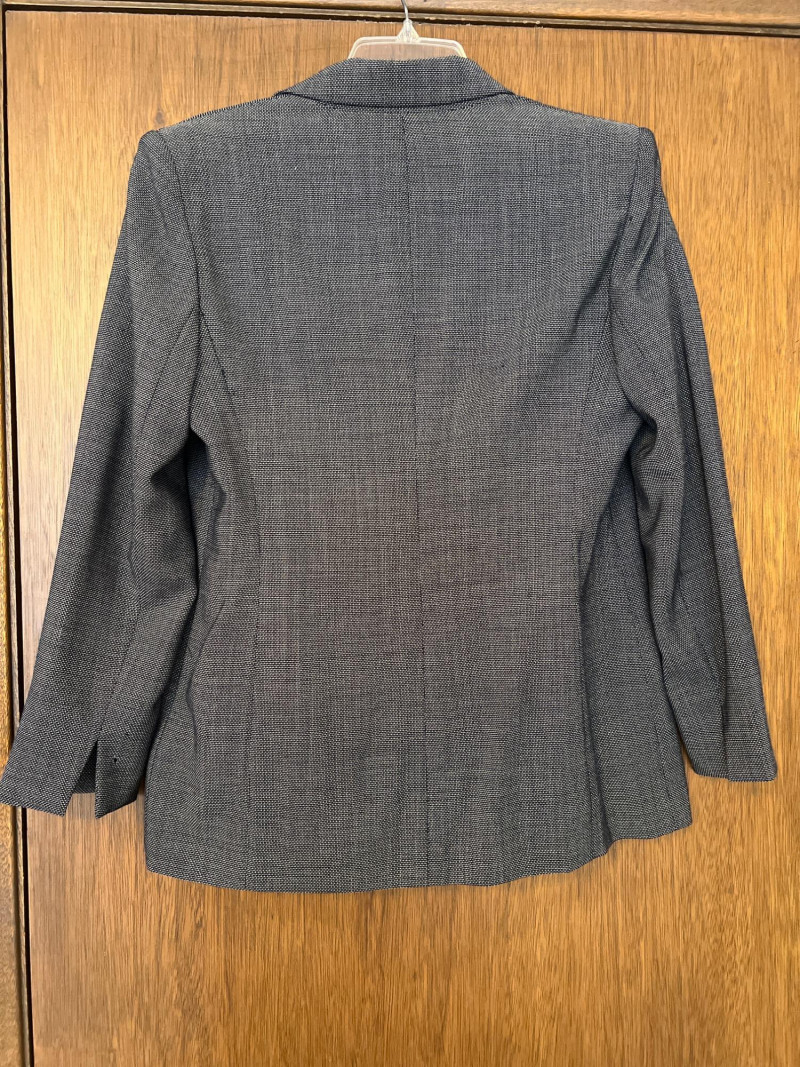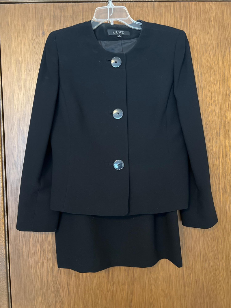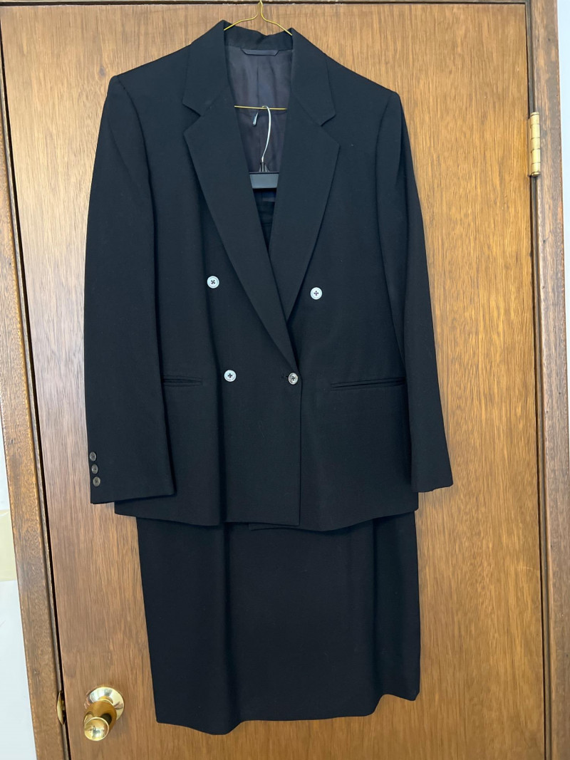 All jacket and skirt suit style sets are fully lined. Top quality made by Jones of New York, Nordstrom customs, and Kasper. Note: Jones of New York deep navy long suit style jacket and matching skirt. Skirt is 24 inches long and is a Size 14. Jacket is 29 inches long and is a sign 12. Tweed set is 100% wool, fully lined. Nordstrom custom designs suit set is Made in U.S.A.