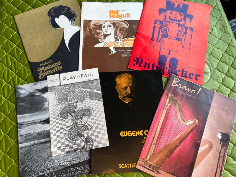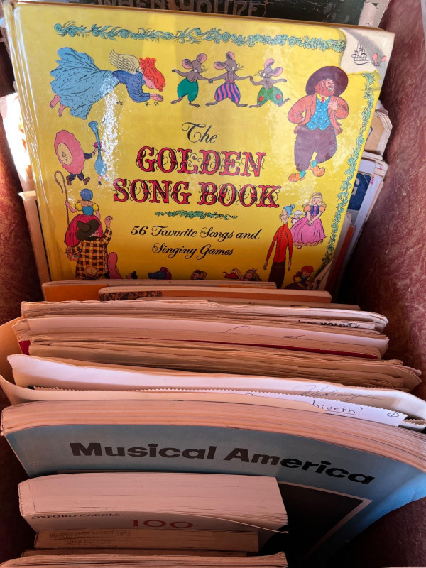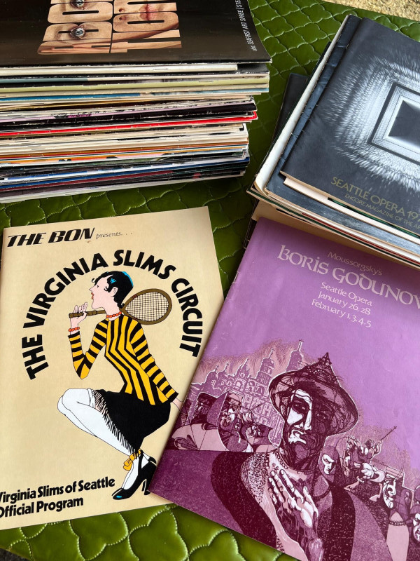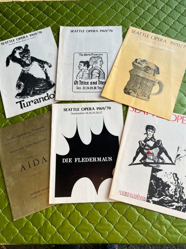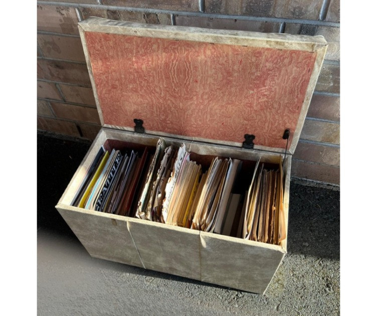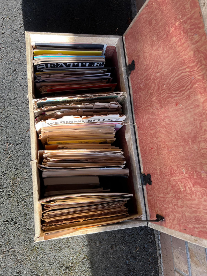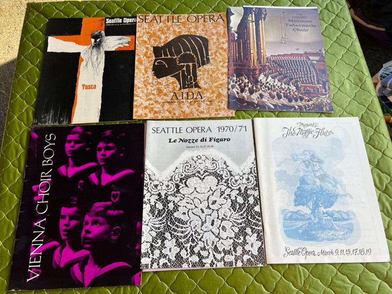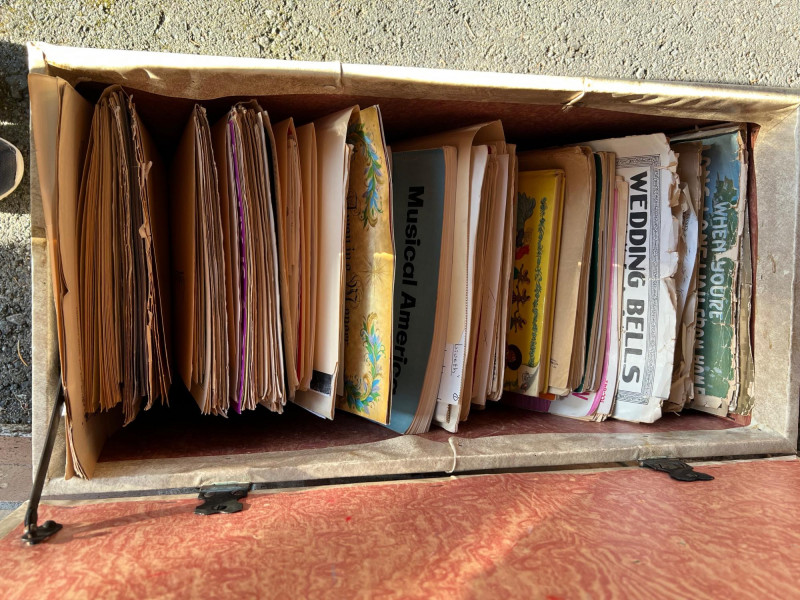 Mid century vinyl covered wood box (with padded top) filled with Seattle Opera brochure programs, Seattle Magazines, and musical sheet music. Seattle Opera brochures are the originals from 1969 to 1980s (later changed name to Encore). Some years included with this new brochure title. Seattle - The Pacific Northwest Magazine from the 1970s - 1980s. Loads of sheet music from early 1900's to 1980's. Several genres.