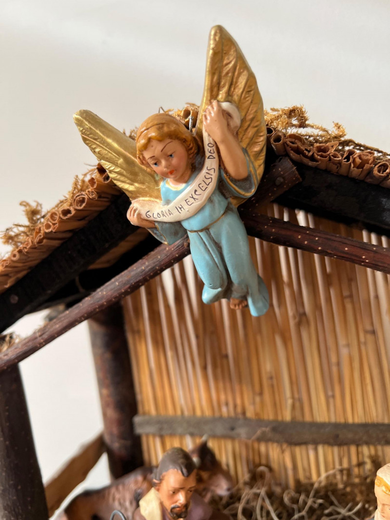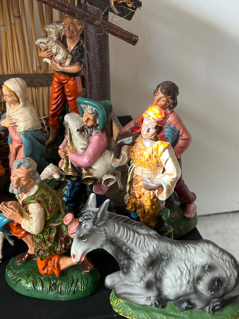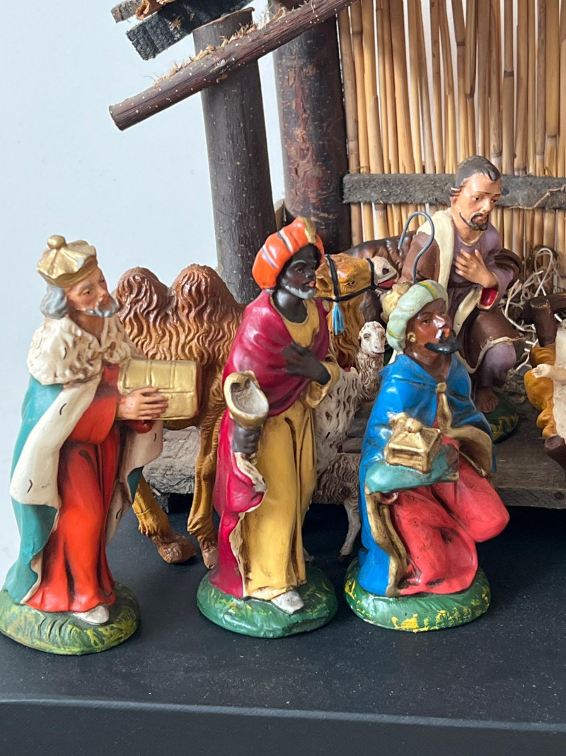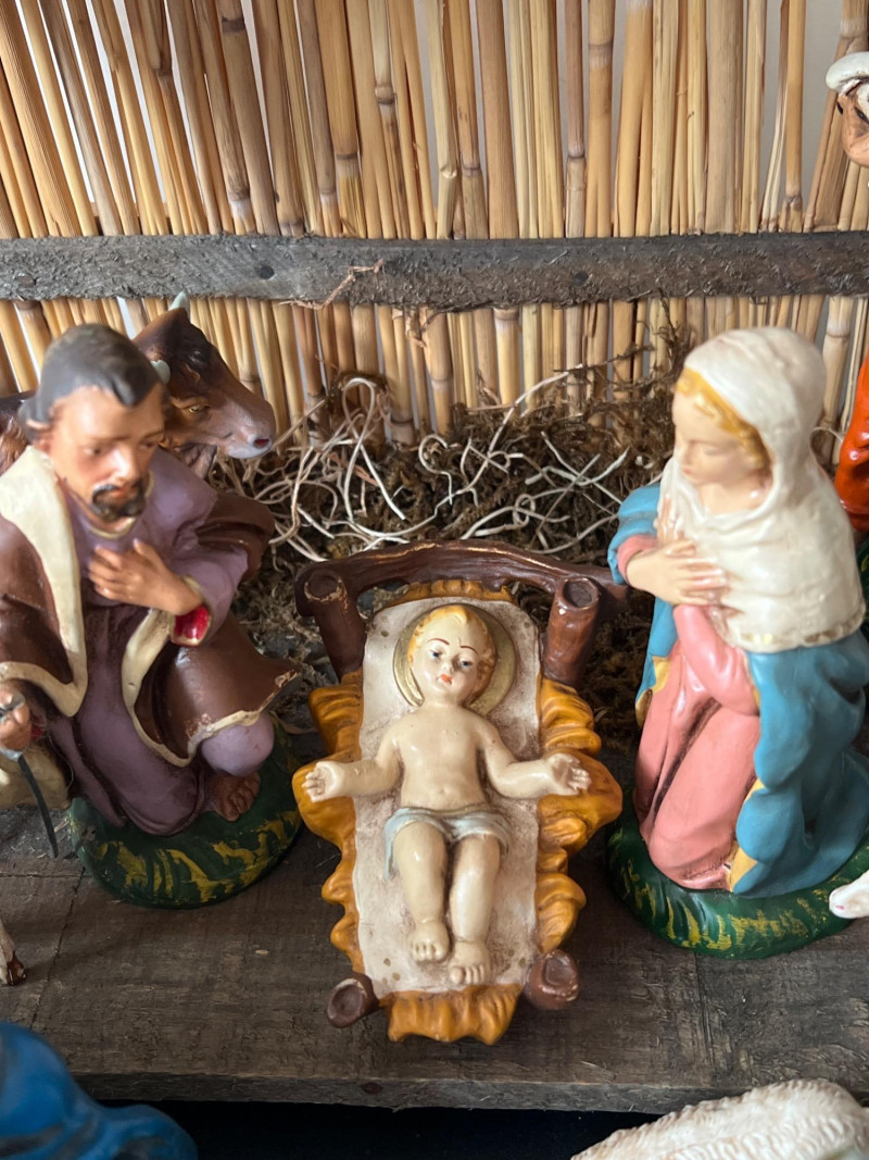 Impressive mid century creche with three kings, shepherds, angel, Joseph, Mary and Jesus. Animals include a donkey, four sheep, cow and camel. Wood and sturdy straw with dried moss manger. Figures range from 4" tall to 8" tall. They have some weight to them (similar texture as Fontanini figures). Hand painted.