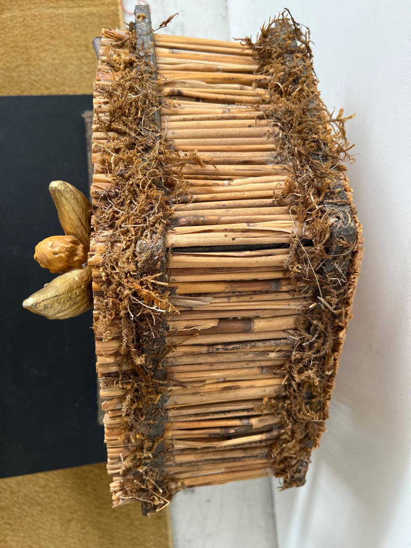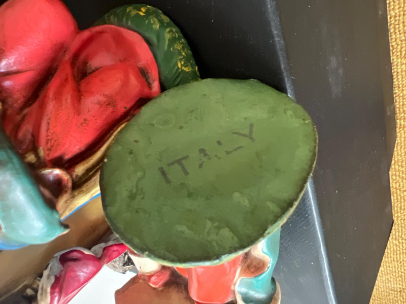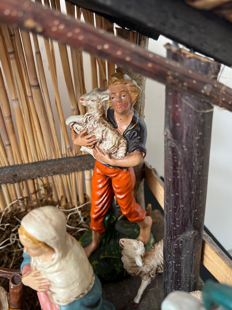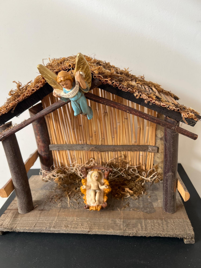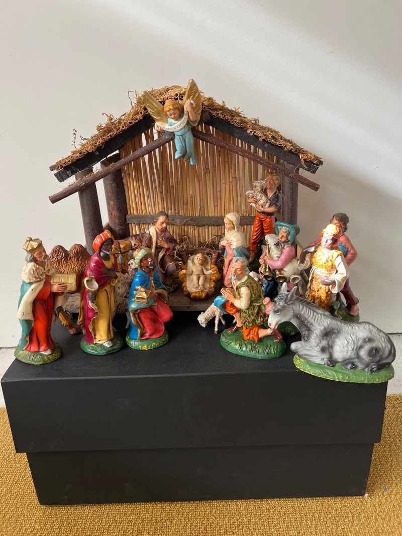 Impressive mid century creche with three kings, shepherds, angel, Joseph, Mary and Jesus. Animals include a donkey, four sheep, cow and camel. Wood and sturdy straw with dried moss manger. Figures range from 4" tall to 8" tall. They have some weight to them (similar texture as Fontanini figures). Hand painted.
