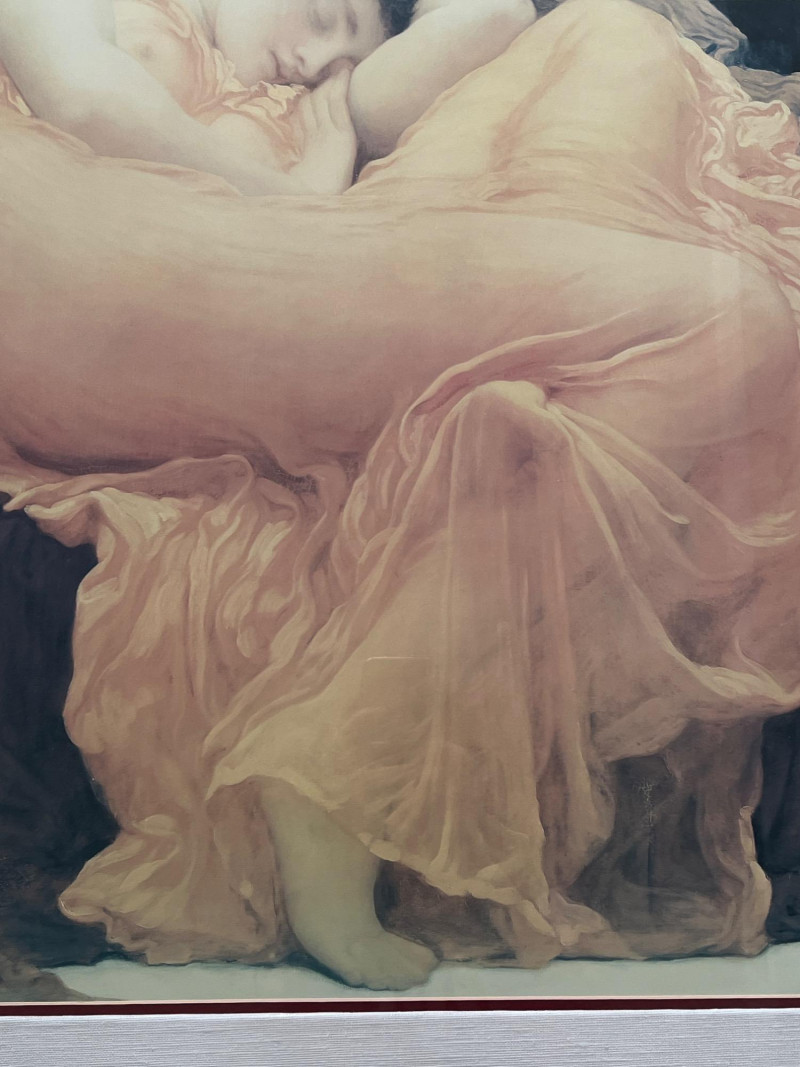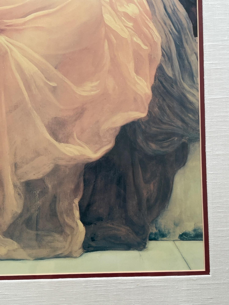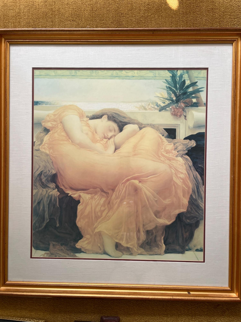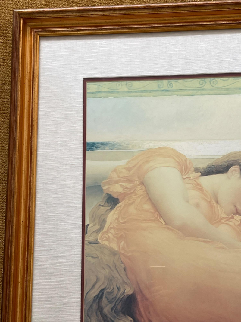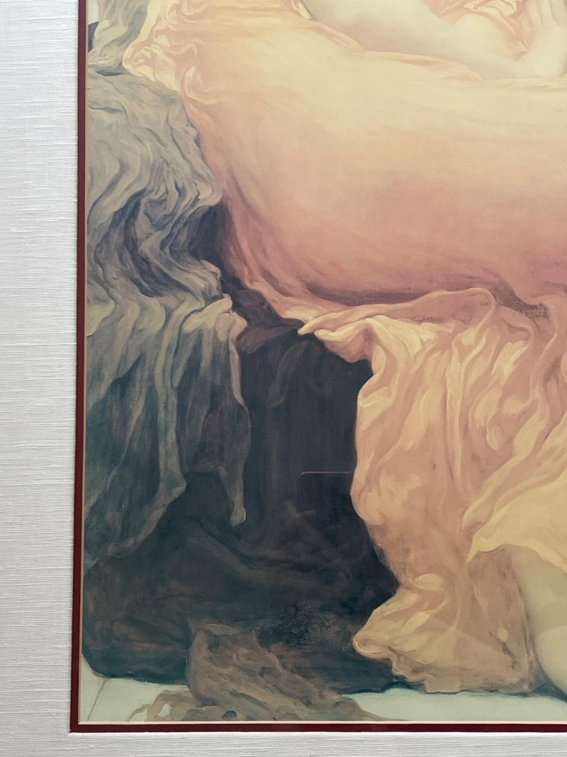 This is a fine print of "Flaming June" by Sir Frederic Leighton. Wonderfully framed and under glass. History: "Flaming June" is an oil painting completed in 1895 by Sir Frederic Leighton. It is one of Leighton's most recognizable works, depicting a sleeping woman in flowing orange robes. The artwork is considered a masterpiece and an icon of Victorian art. The pose of the figure was inspired by Michelangelo's sculpture "Night". The oleander flowers in the painting may symbolize death or danger. It is currently on loan to the Royal Academy of Arts in London until January 12, 2025. The painting is owned by the Museo de Arte de Ponce in Puerto Rico.
