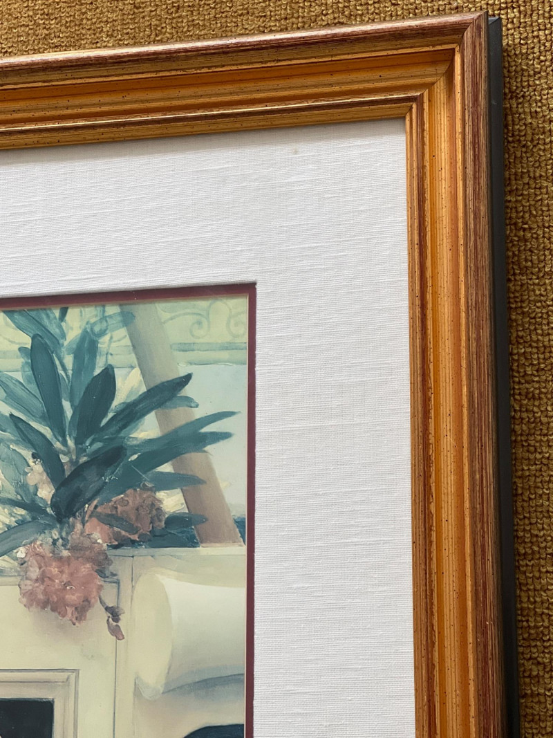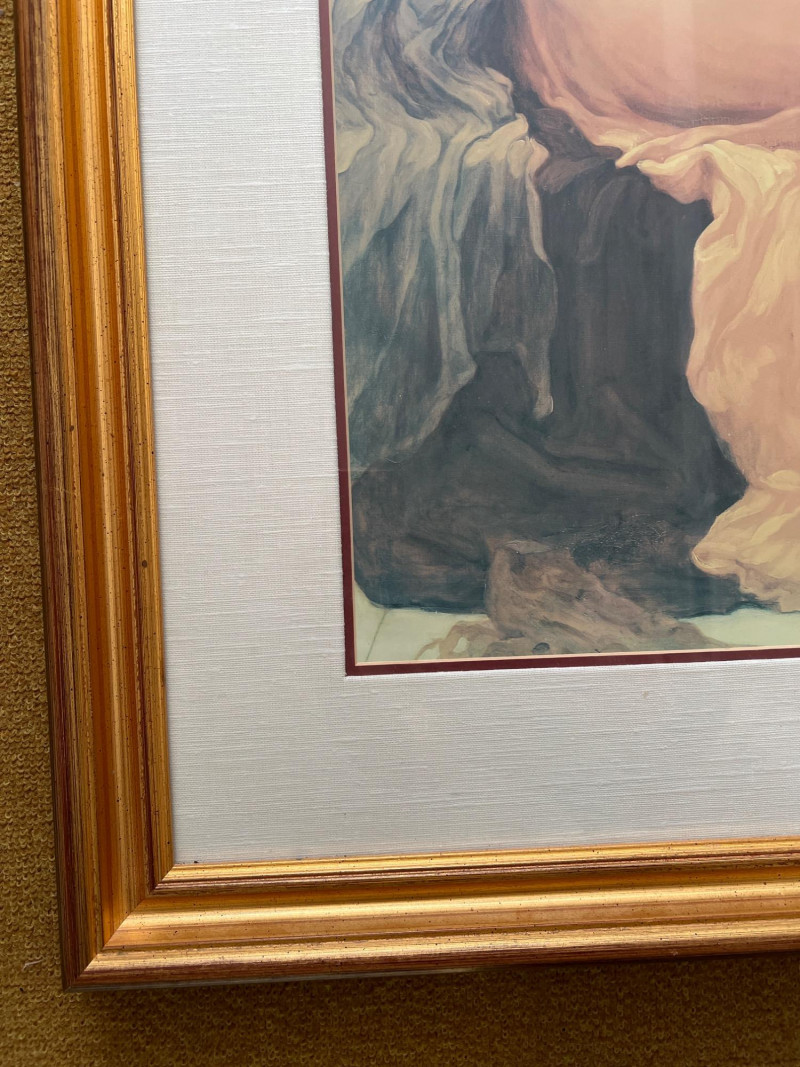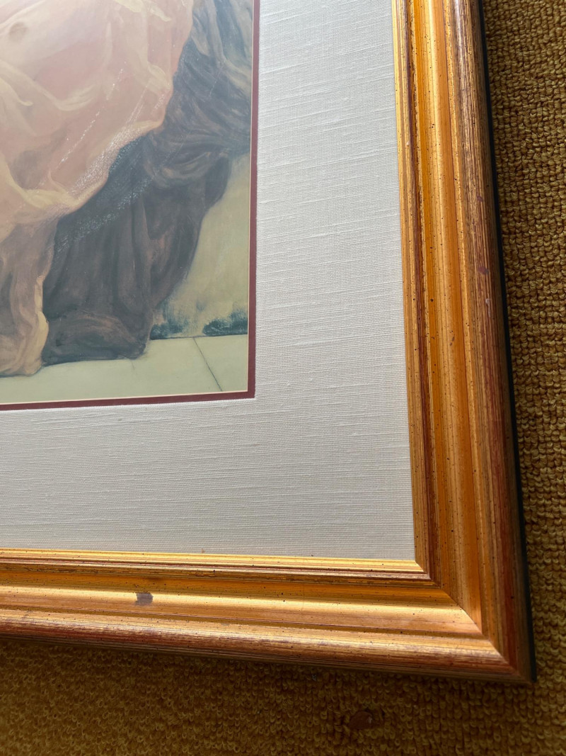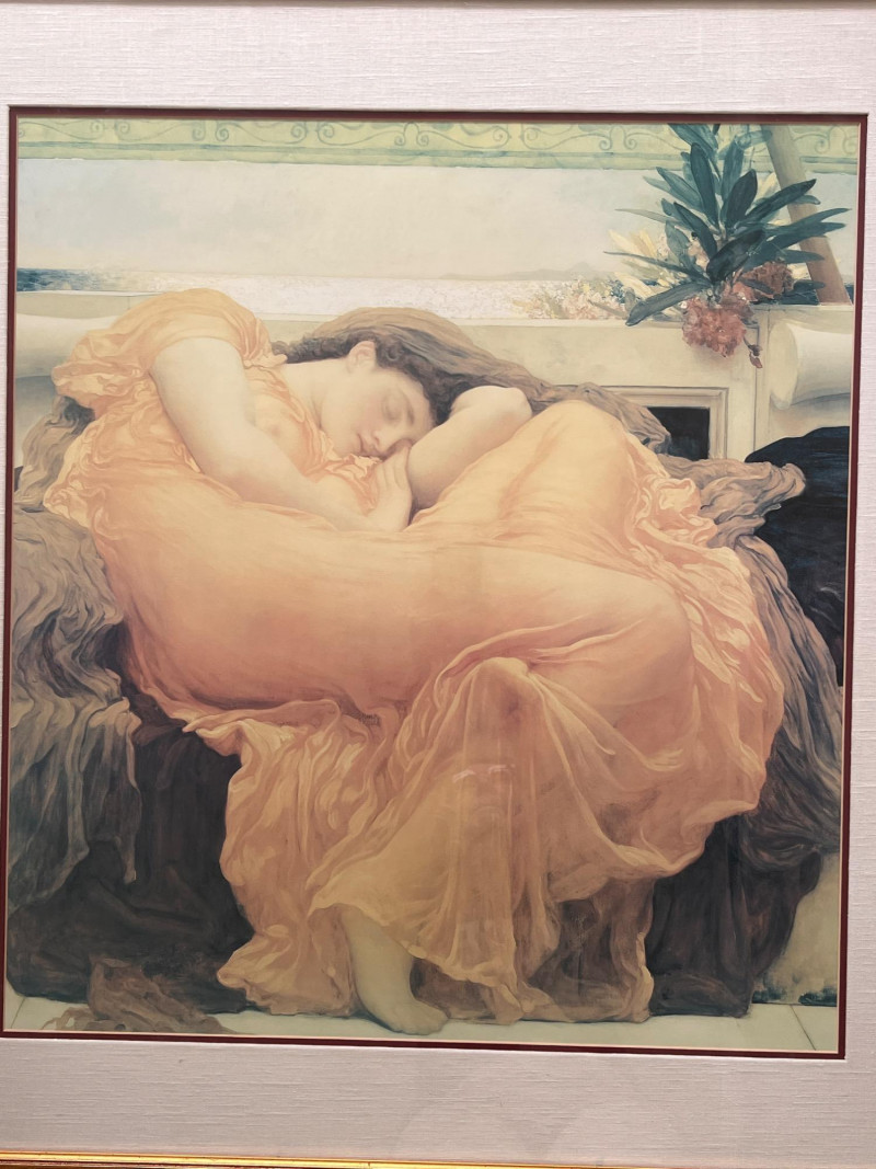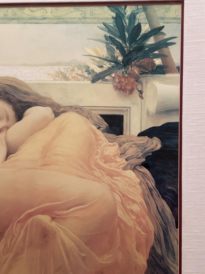 This is a fine print of "Flaming June" by Sir Frederic Leighton. Wonderfully framed and under glass. History: "Flaming June" is an oil painting completed in 1895 by Sir Frederic Leighton. It is one of Leighton's most recognizable works, depicting a sleeping woman in flowing orange robes. The artwork is considered a masterpiece and an icon of Victorian art. The pose of the figure was inspired by Michelangelo's sculpture "Night". The oleander flowers in the painting may symbolize death or danger. It is currently on loan to the Royal Academy of Arts in London until January 12, 2025. The painting is owned by the Museo de Arte de Ponce in Puerto Rico.
