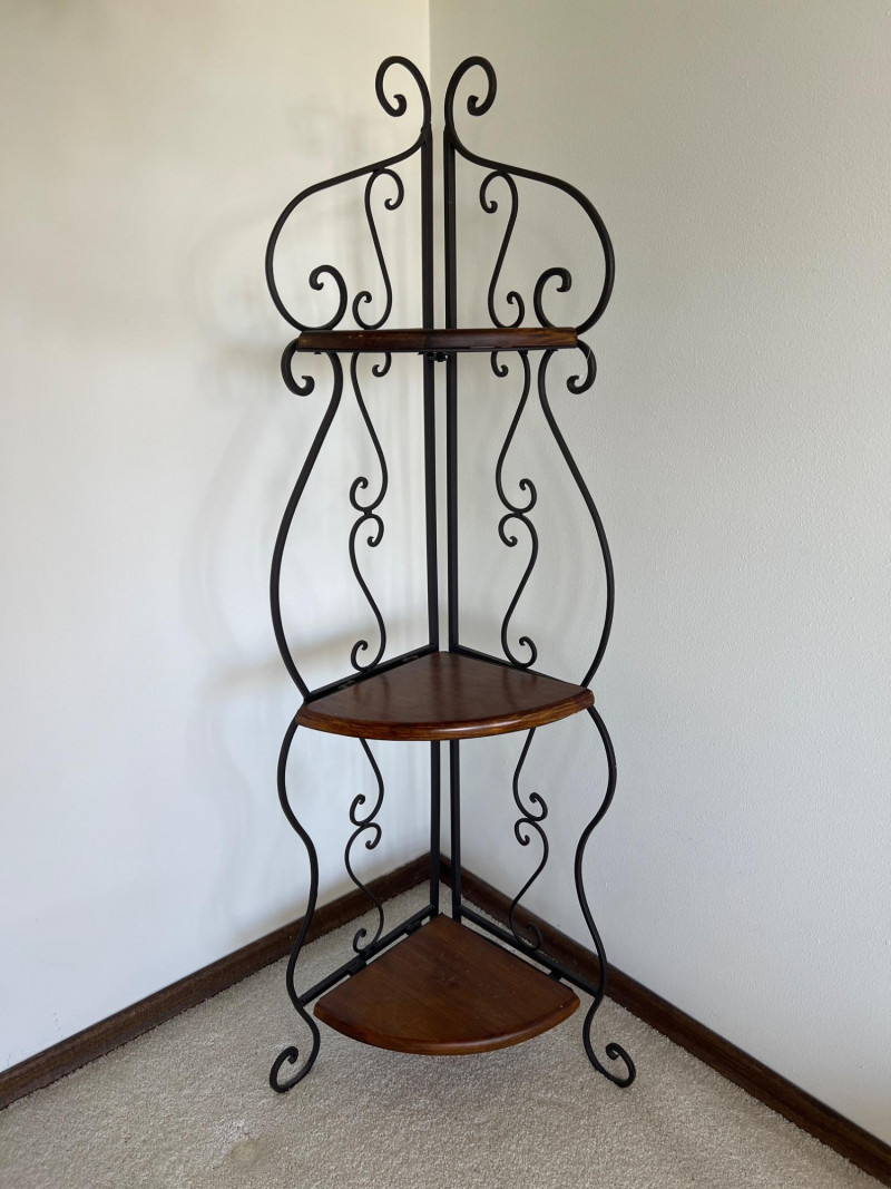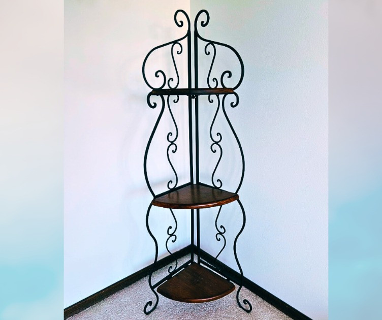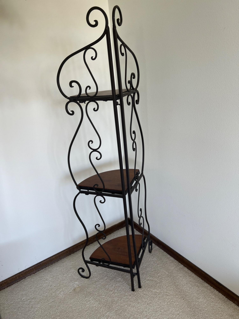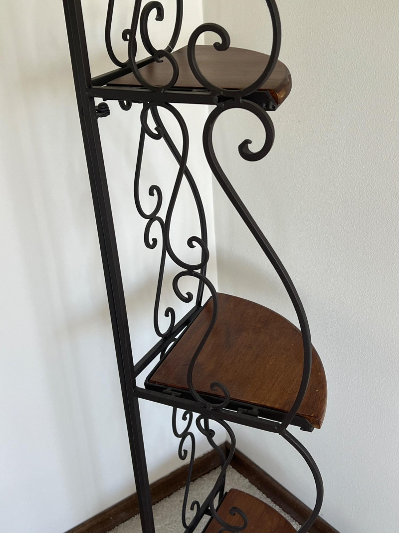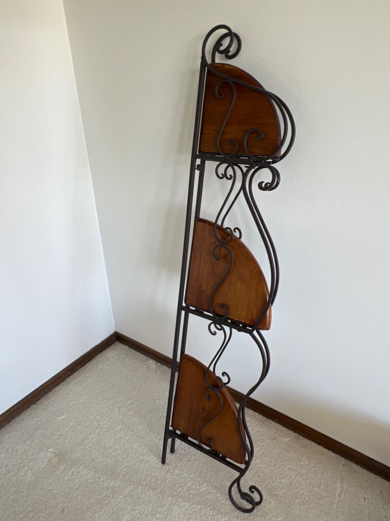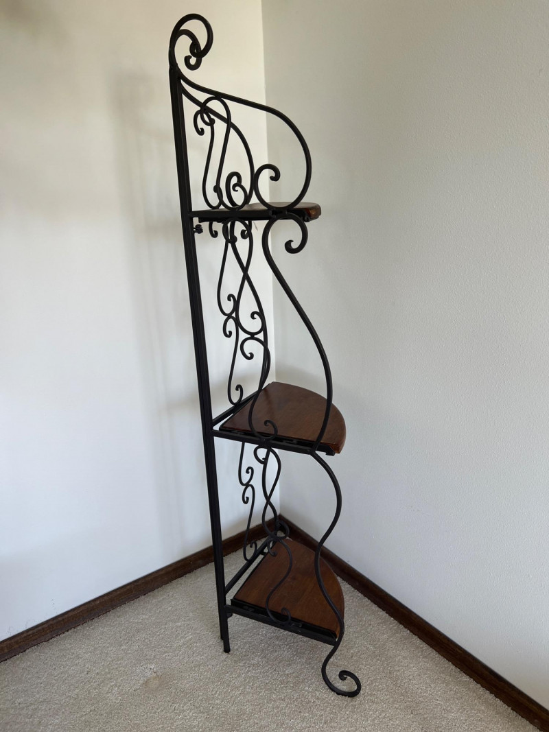 This is a corner, tiered iron and wood rack, a beautifully designed piece featuring a wrought iron frame with intricate scrollwork and triangular wooden shelves. Its aesthetic leans toward a vintage or antique style. The rack folds for easy transport or storage when not in use.