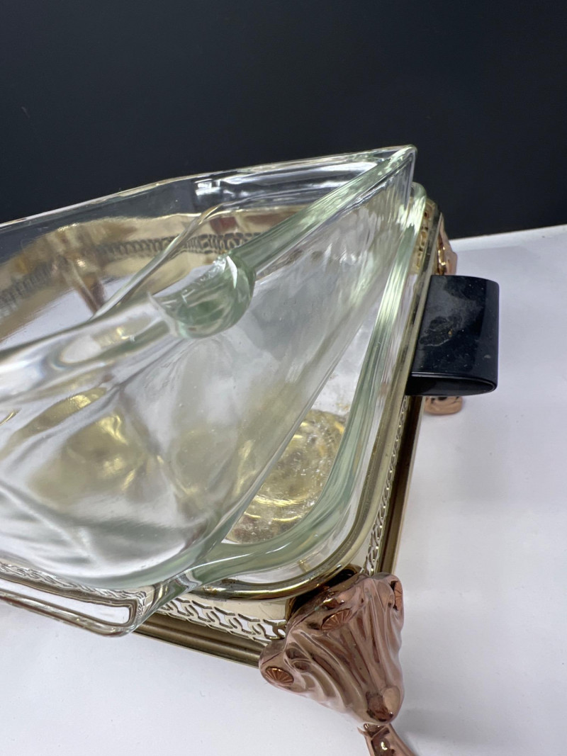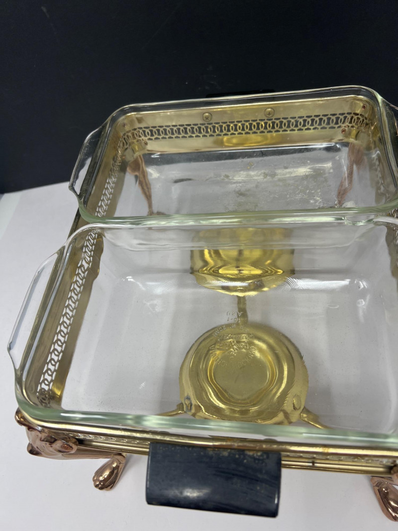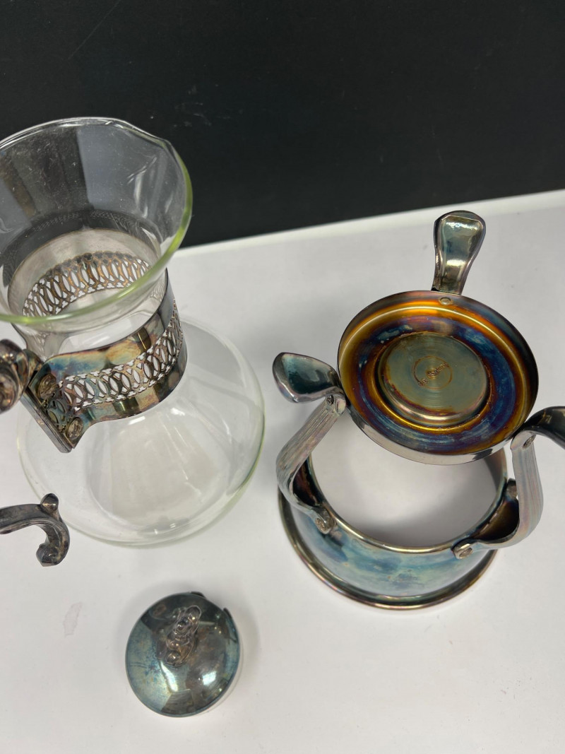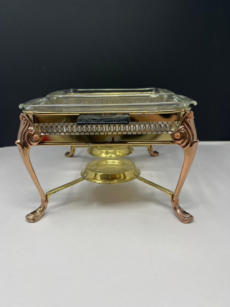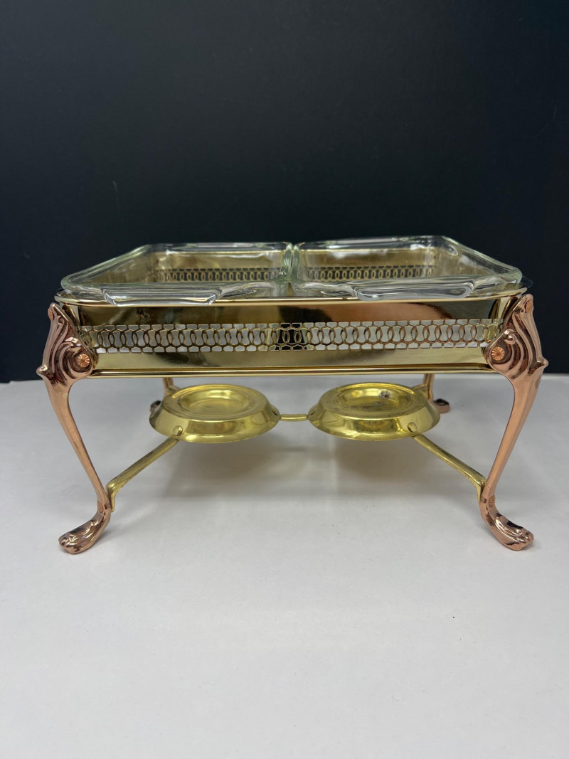 Silver carafe pot marked F.B. Rogers is 13.5” tall x 6” round Gold and copper toned oval server is 14” length x 10” width x 6" height Rectangular double compartment gold and copper toned service is 11.5" width x 10" depth x 6" height. One of the glass serving dishes has a chip (see picture).