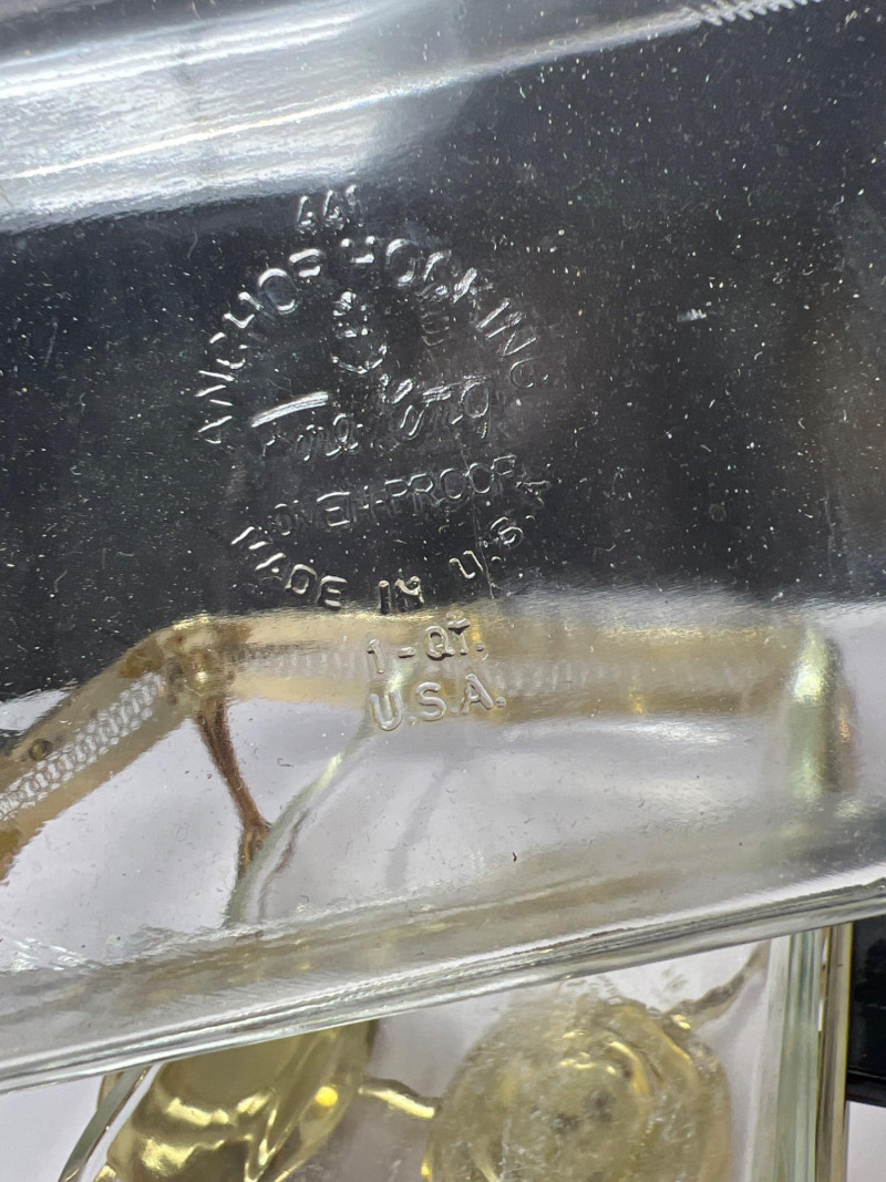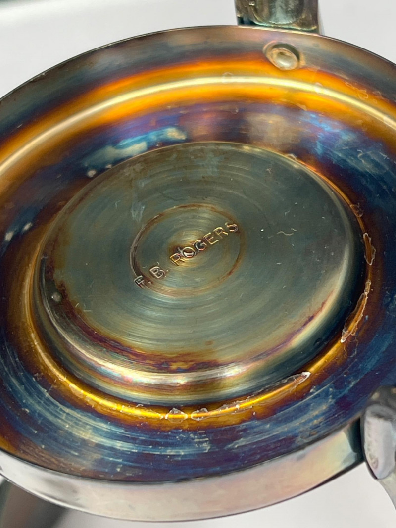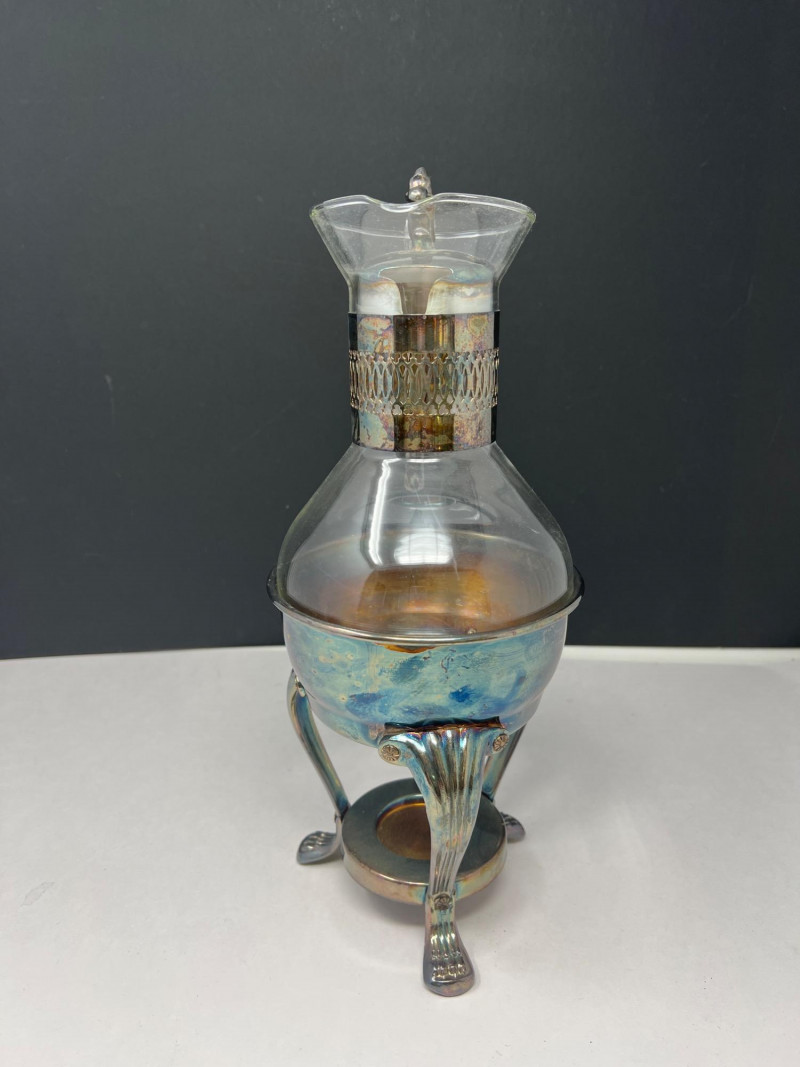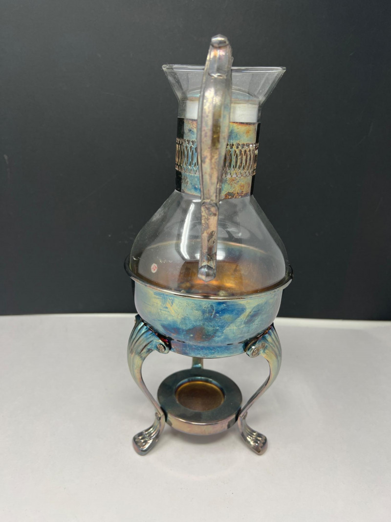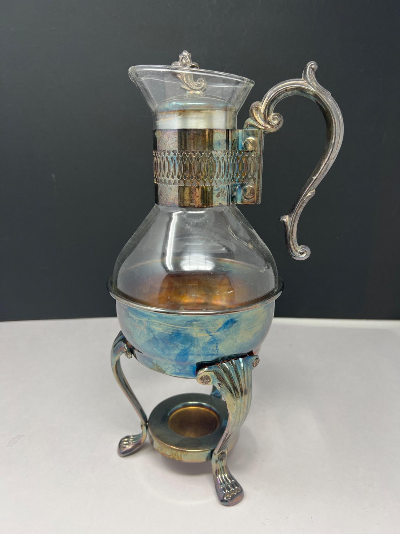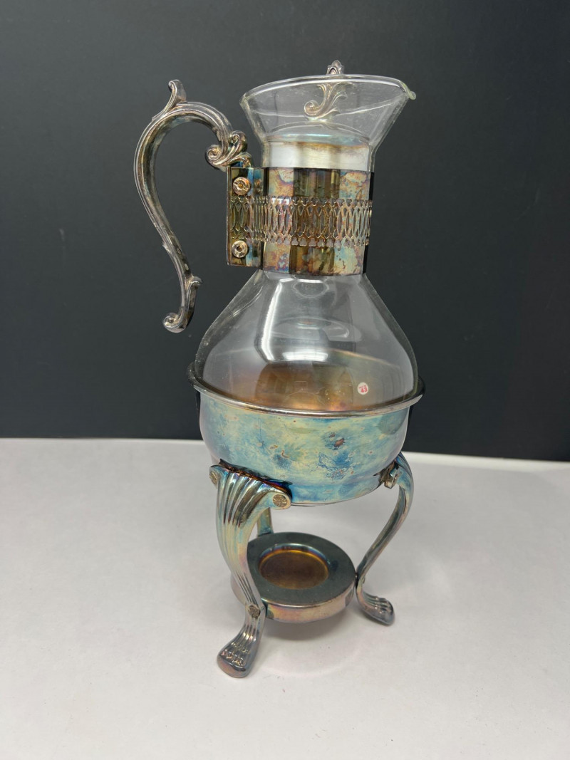 Silver carafe pot marked F.B. Rogers is 13.5” tall x 6” round Gold and copper toned oval server is 14” length x 10” width x 6" height Rectangular double compartment gold and copper toned service is 11.5" width x 10" depth x 6" height. One of the glass serving dishes has a chip (see picture).