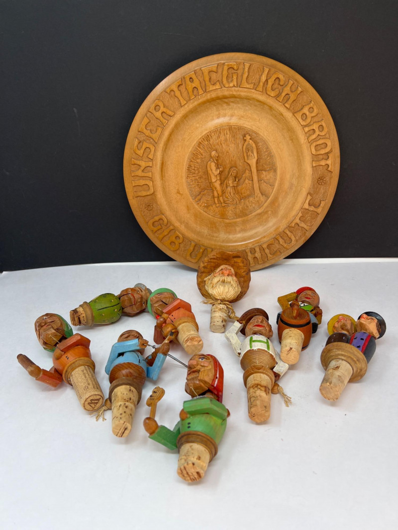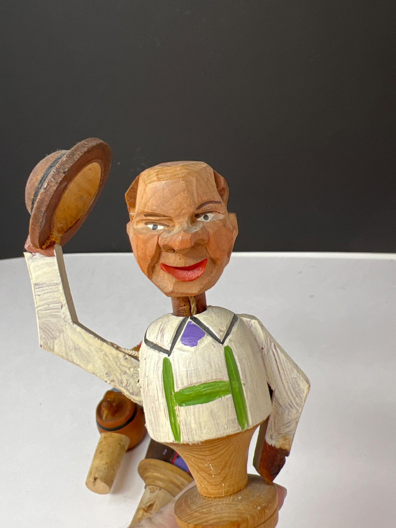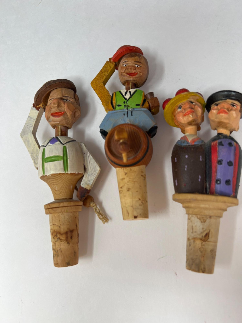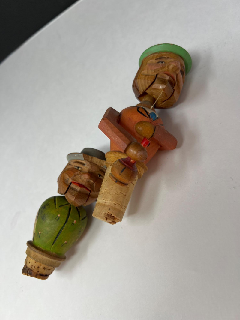 Nine (9) hand-carved wooden cork bottle stoppers featuring colorful figures in traditional or folk attire. They serve as decorative pieces to cap bottles. Their charm lies in the craftsmanship and attention to detail, with each figure adding personality. Several have either a lever in back that when depressed cause the character's mouth or other movement. Stoppers like these were popular in the mid-20th century, often made in Europe, including regions like Italy or Germany. Stoppers range from 4 inches tall to 6 inches tall. Also included is a Bottle Rocket wine bottle de-corker.