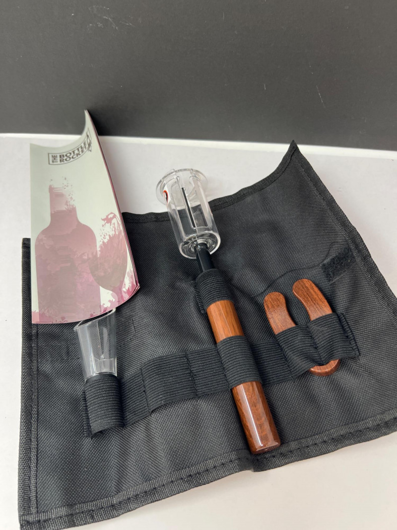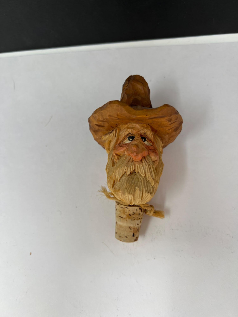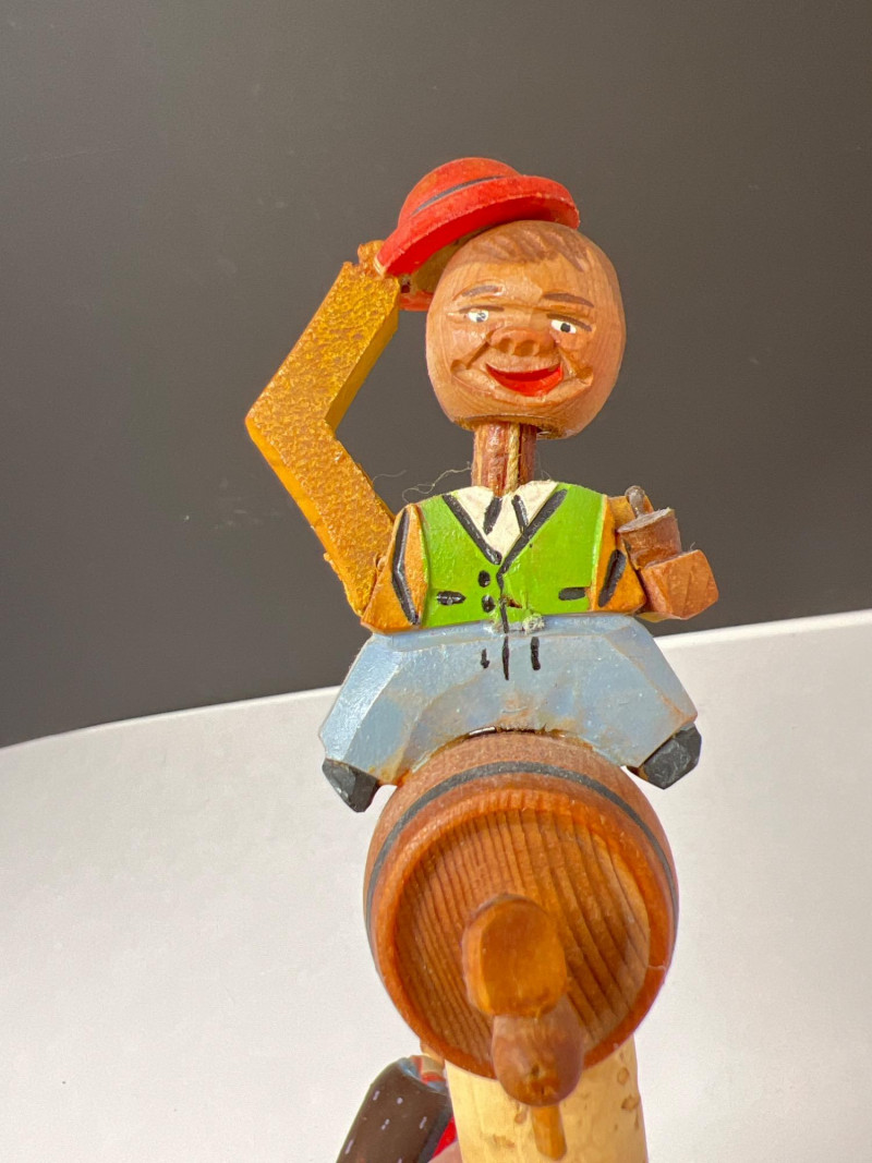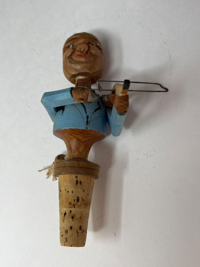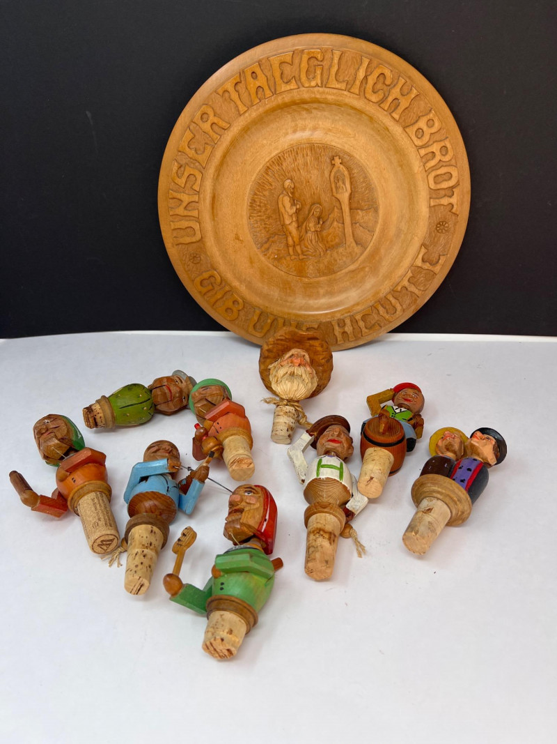Nine (9) hand-carved wooden cork bottle stoppers featuring colorful figures in traditional or folk attire. They serve as decorative pieces to cap bottles. Their charm lies in the craftsmanship and attention to detail, with each figure adding personality. Several have either a lever in back that when depressed cause the character's mouth or other movement. Stoppers like these were popular in the mid-20th century, often made in Europe, including regions like Italy or Germany. Stoppers range from 4 inches tall to 6 inches tall. Also included is a Bottle Rocket wine bottle de-corker.