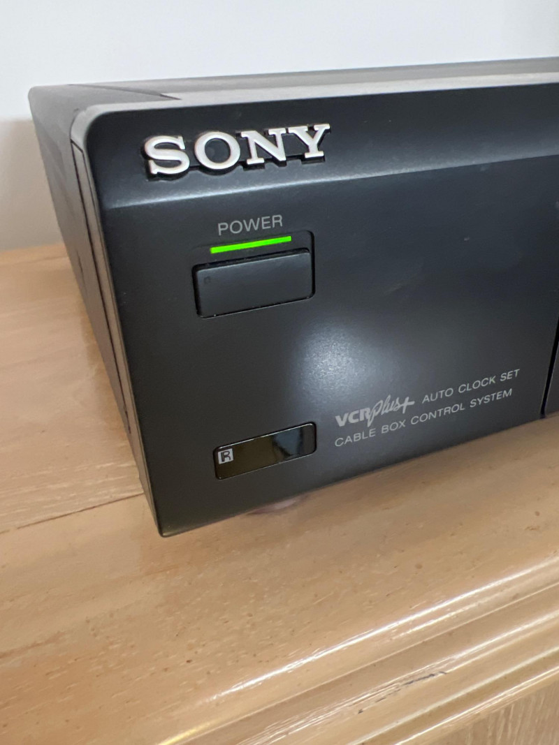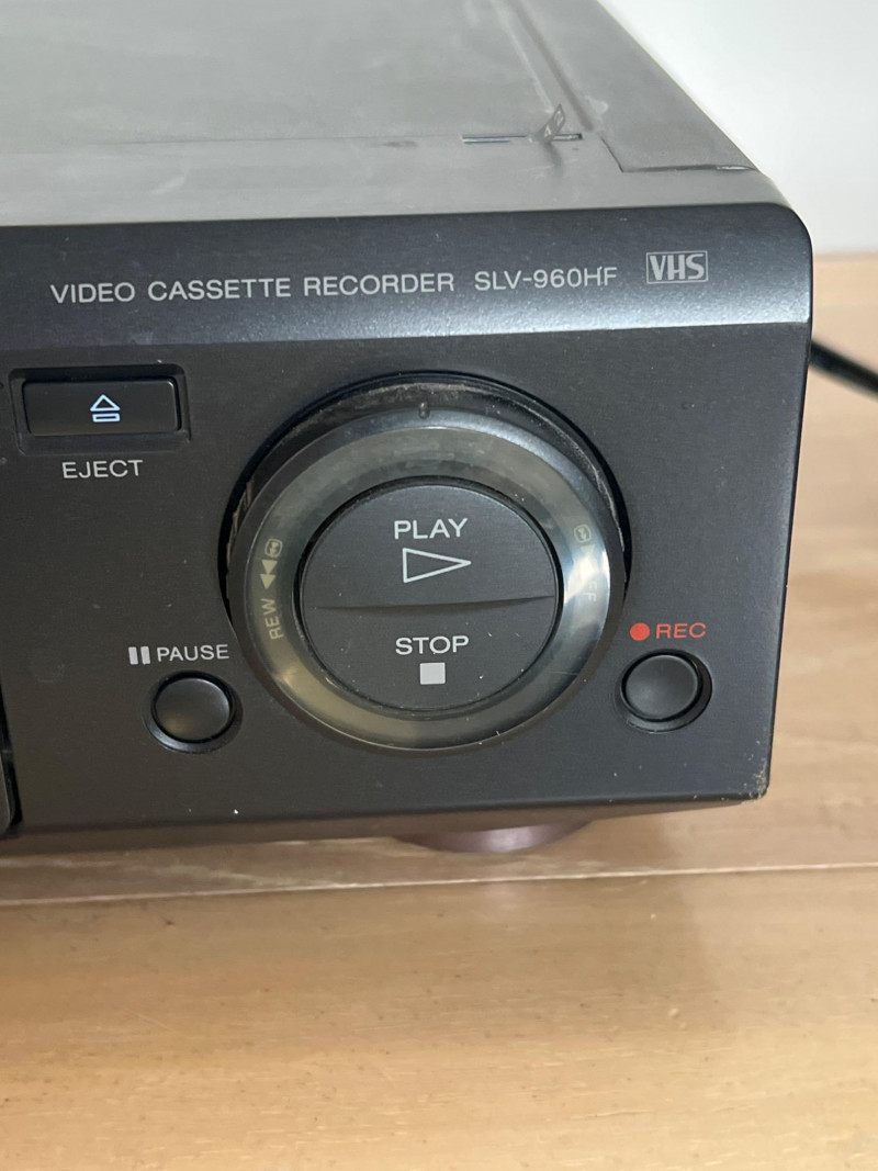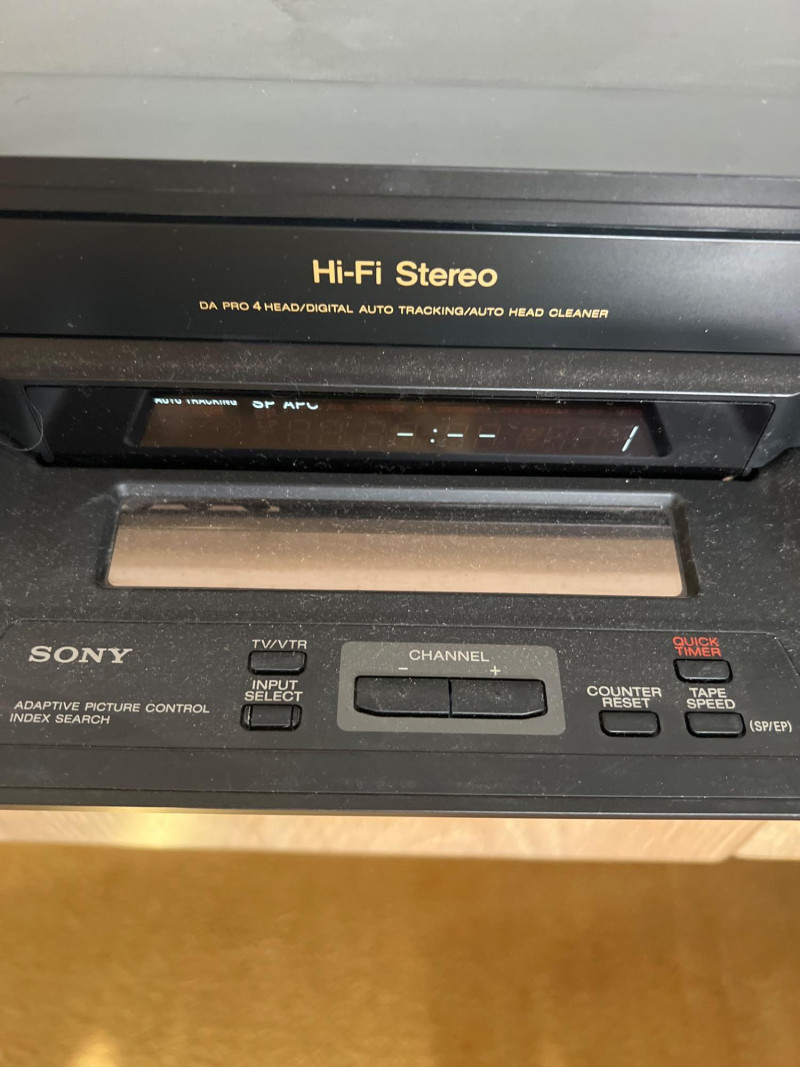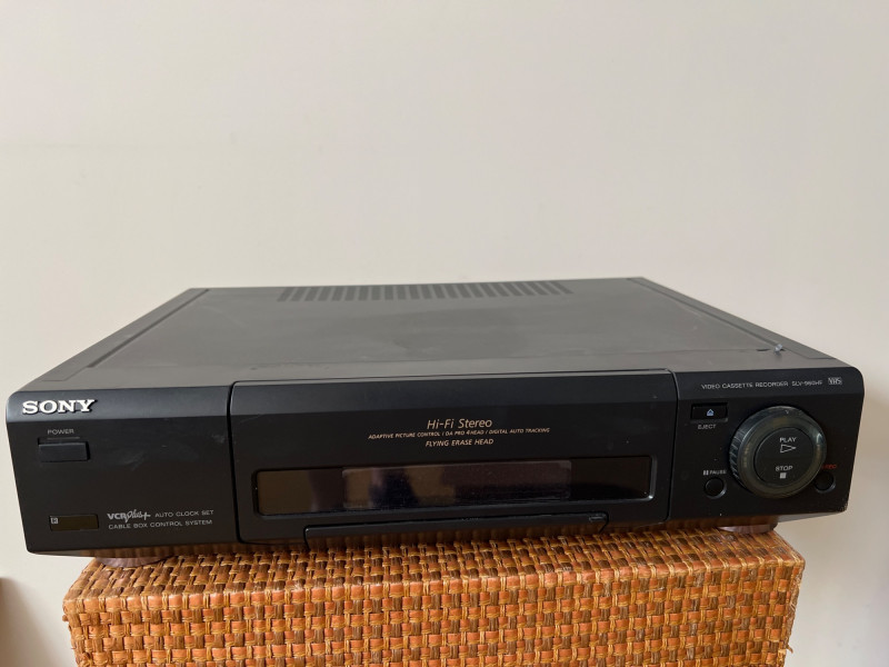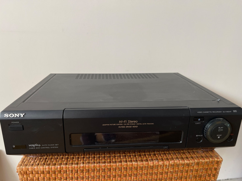 The Sony SLV-960HF VHS Player is a vintage 4-head Hi-Fi VCR known for its high-quality playback and recording capabilities. It features stereo sound, dual azimuth recording, and playback options, making it a reliable choice for enjoying VHS tapes. The design includes a flip-down control panel with AV inputs, a large LCD display, and a glow-in-the-dark multi-brand remote for convenience.This model also supports features like slow motion, frame-by-frame advance, and commercial skip, enhancing the viewing experience. Unit powers on. No further testing.