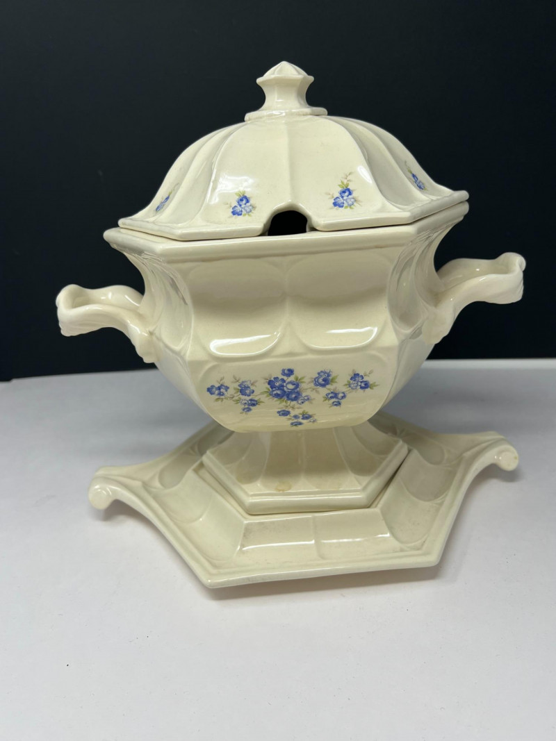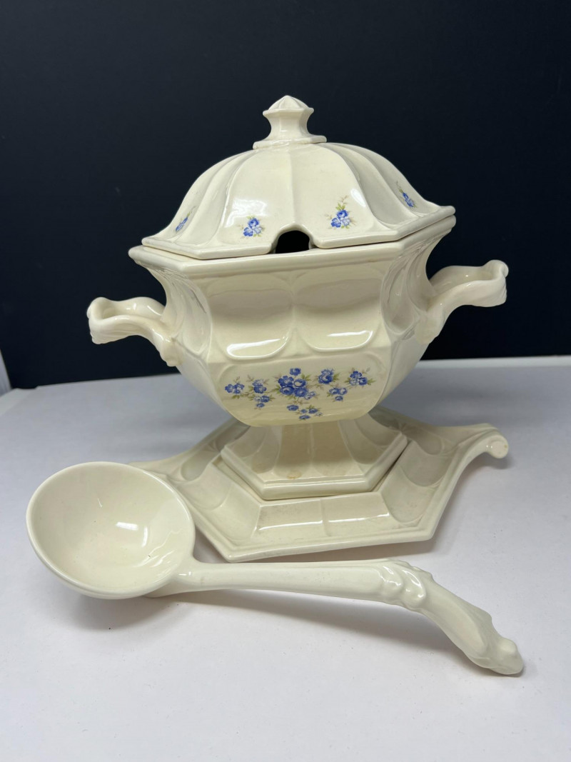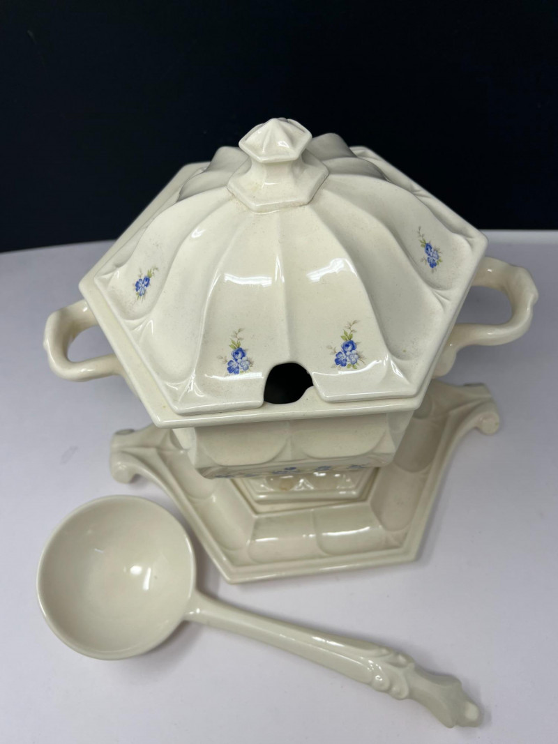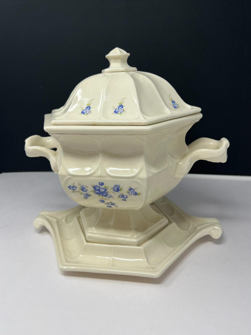 This ceramic Arnels Mold from 1961 is cream-colored with blue floral patterns and accompanied by a hexagonal-shaped matching base. Tureen is 15 inches height and 12 inches wide. Six (6) matching soup bowls (5.5 inches).