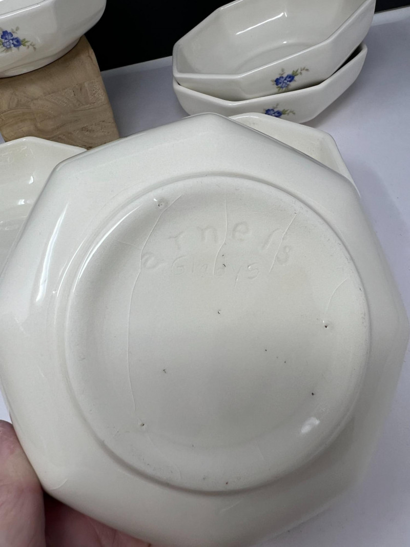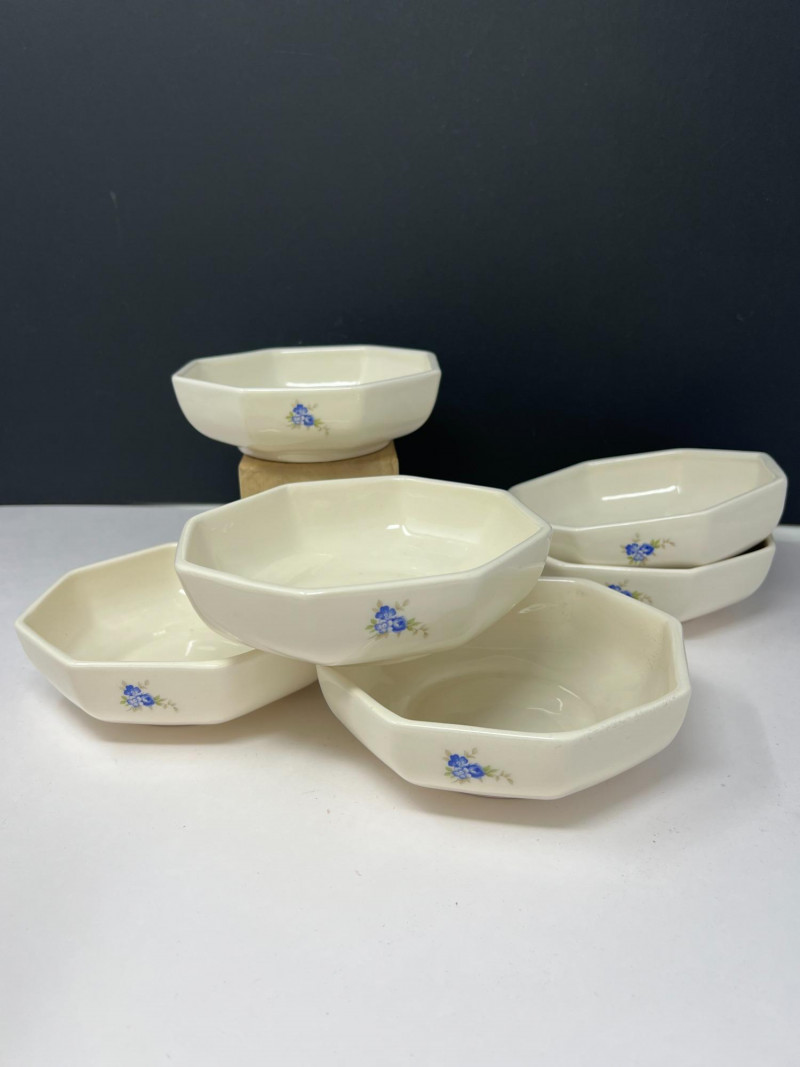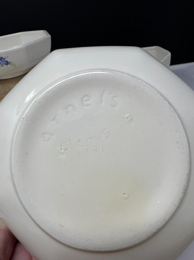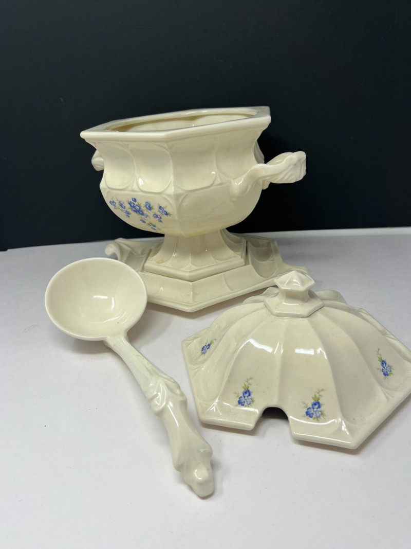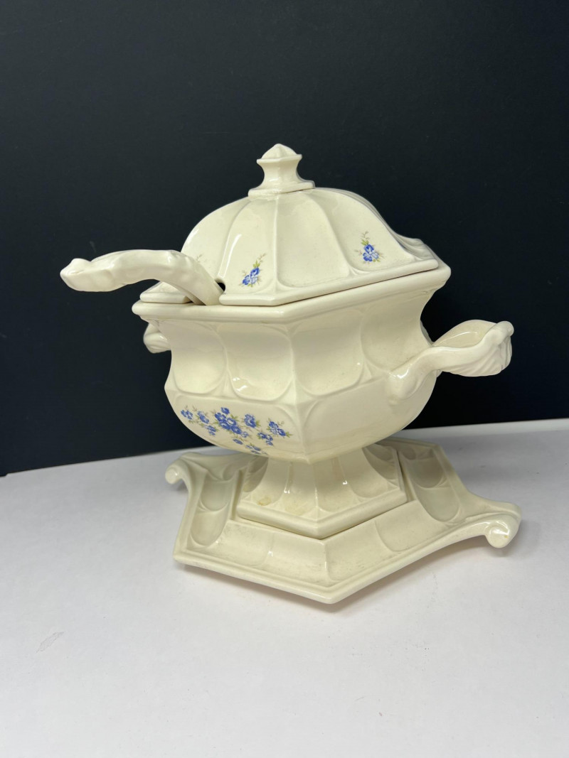 This ceramic Arnels Mold from 1961 is cream-colored with blue floral patterns and accompanied by a hexagonal-shaped matching base. Tureen is 15 inches height and 12 inches wide. Six (6) matching soup bowls (5.5 inches).