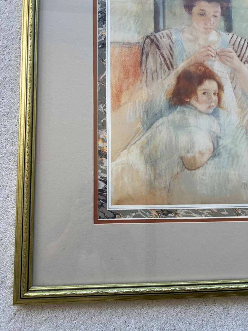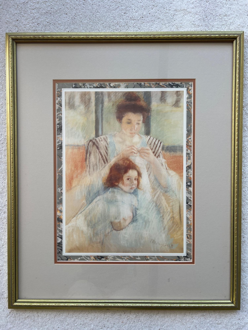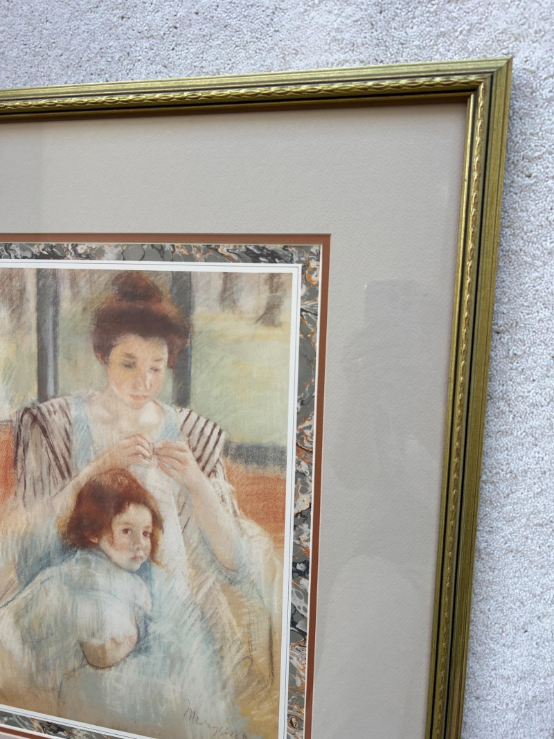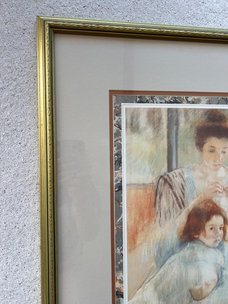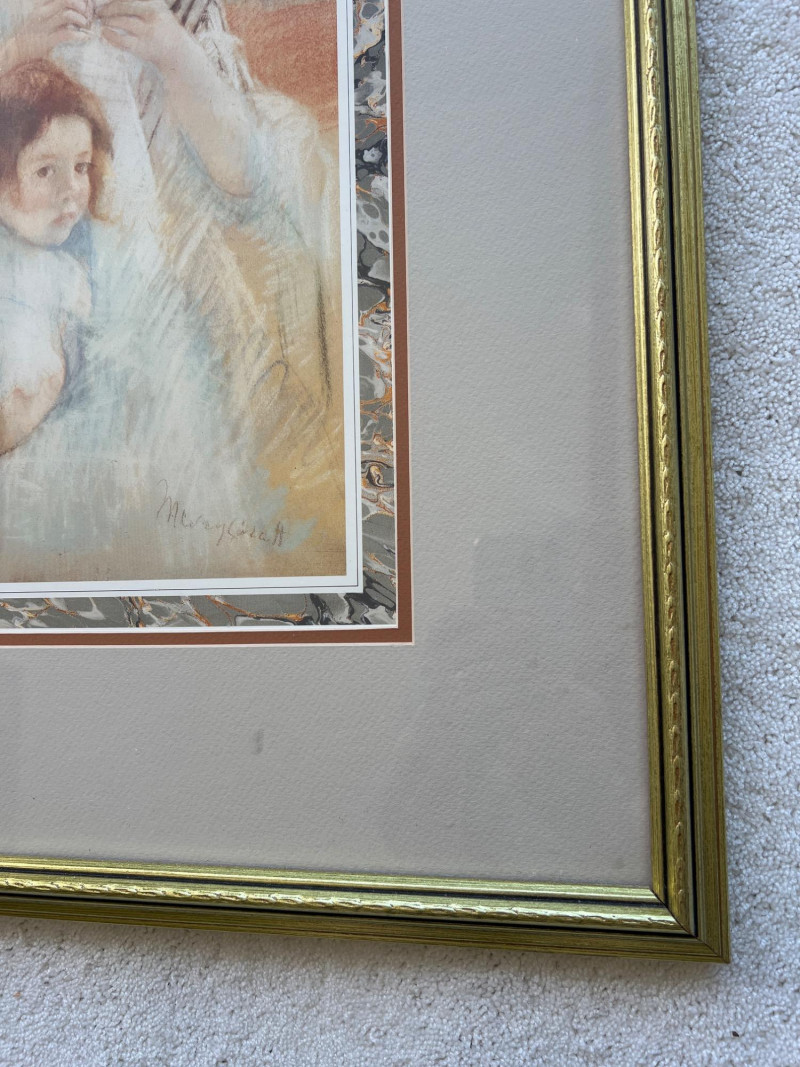 Mary Cassatt (American artist and highly celebrated) is known for her depictions of women and children. Cassatt is considered a master at conveying intimacy and emotion through her art. Wonderfully framed in gold gilt and triple matted. Print is shown as signed.